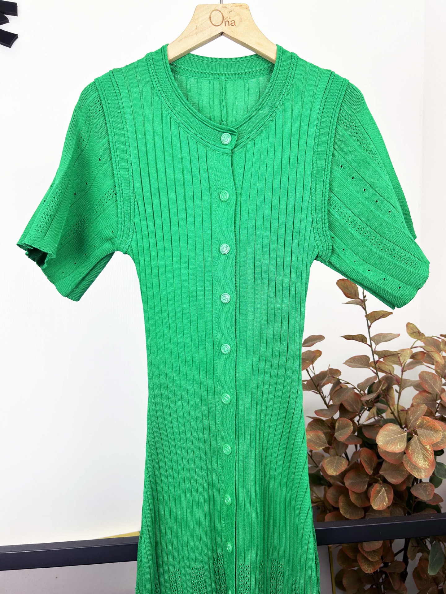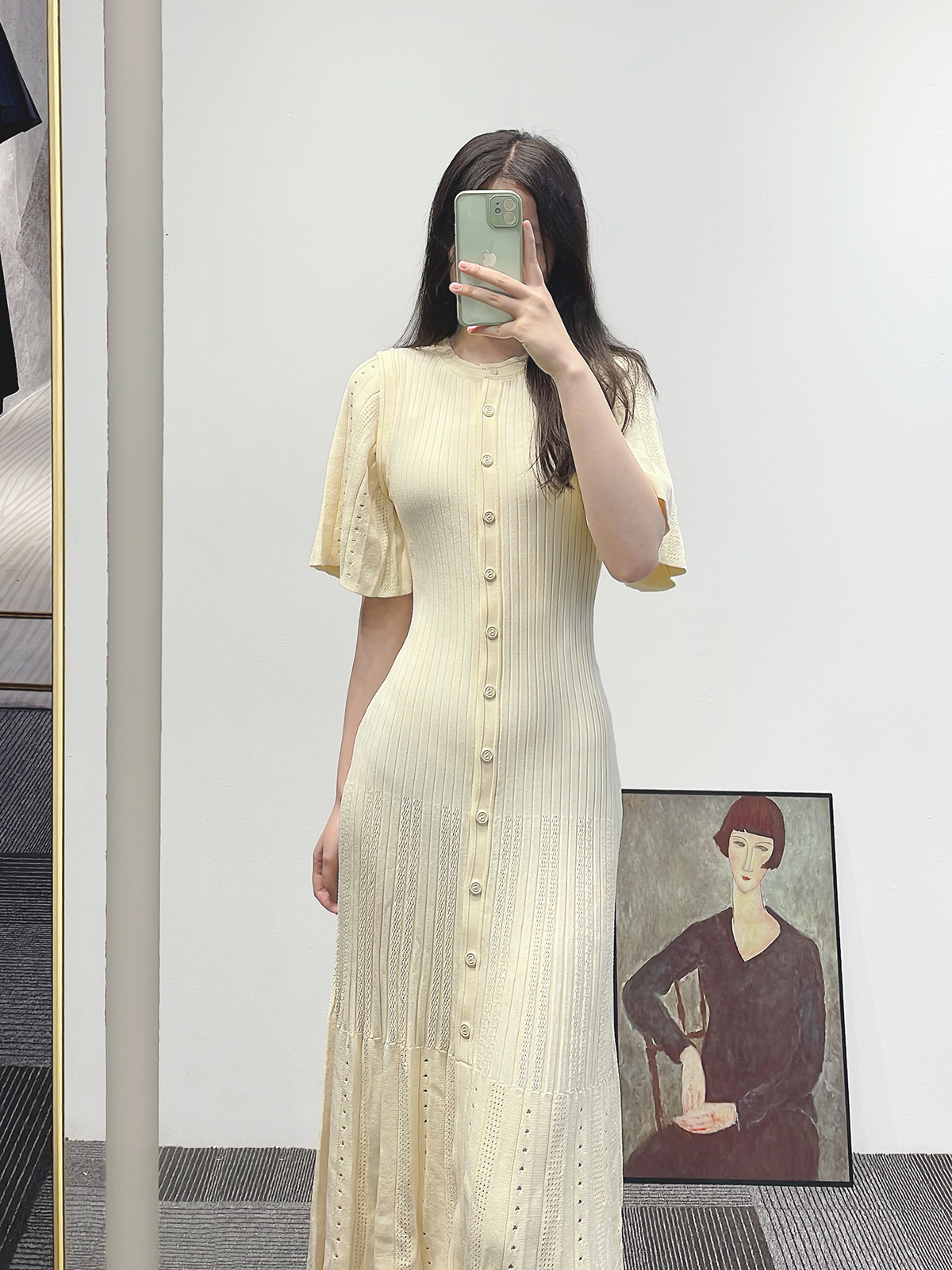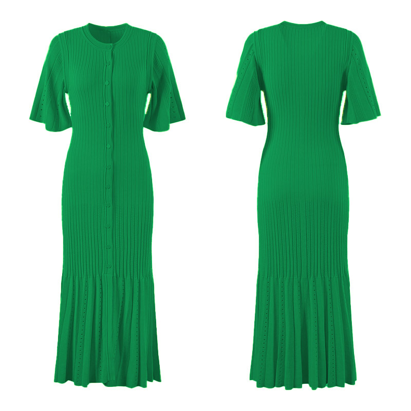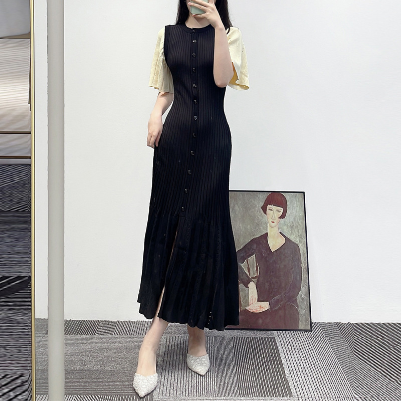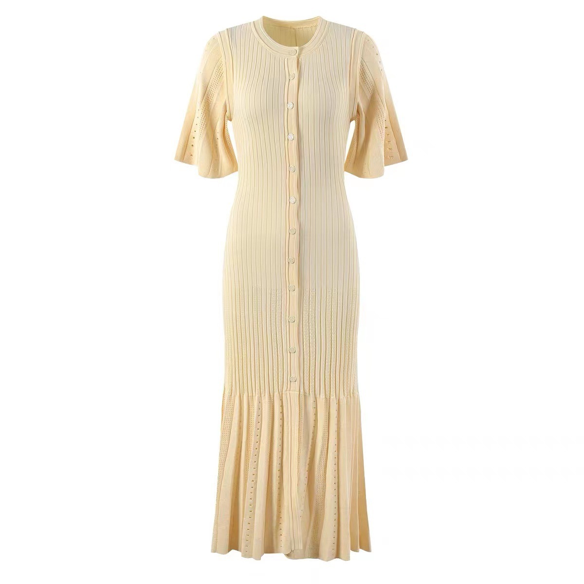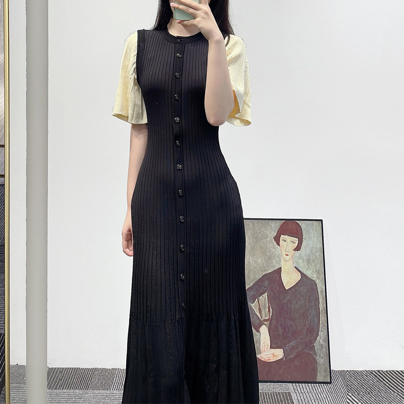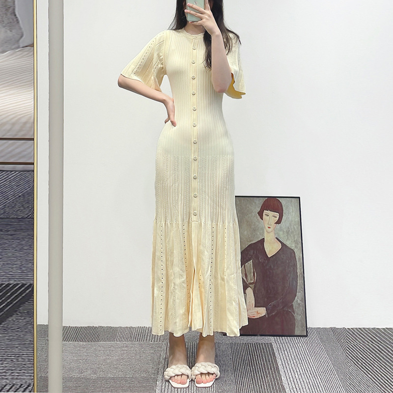 2024 여름 새로운 프랑스 스타일 우아한 타이트 허리 슬리밍 니트 원피스 라운드 넥 싱글 브레스트 롱 원피스