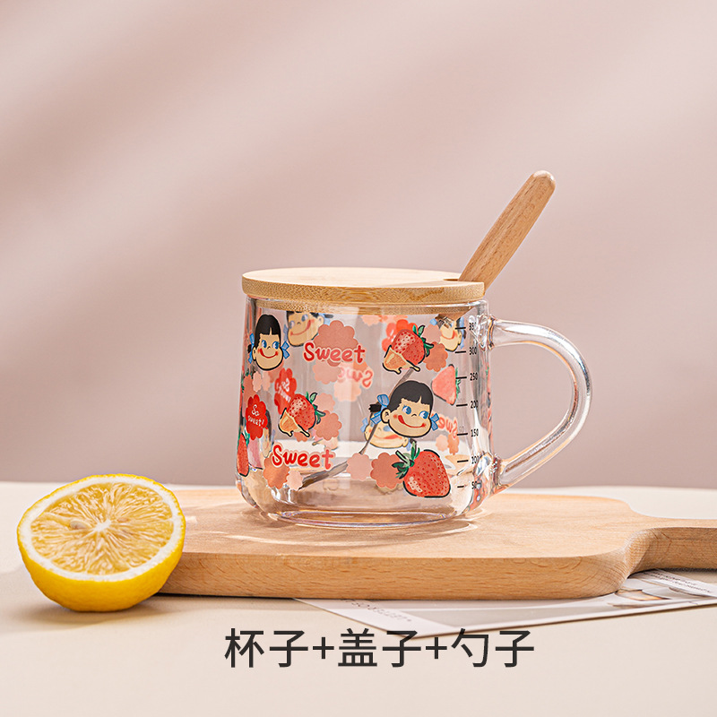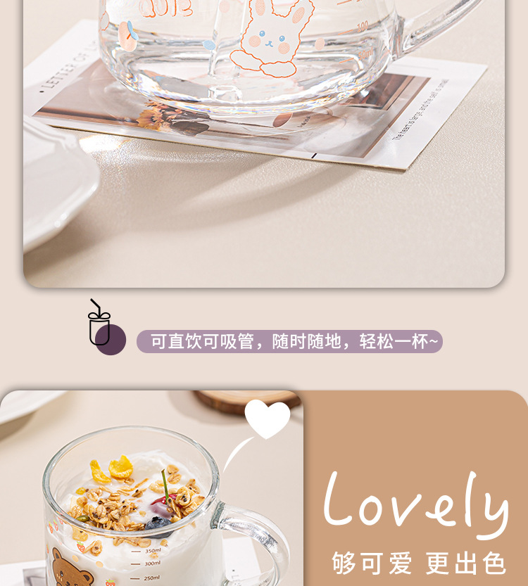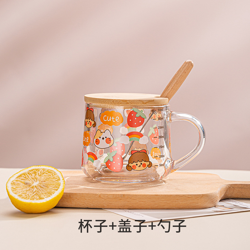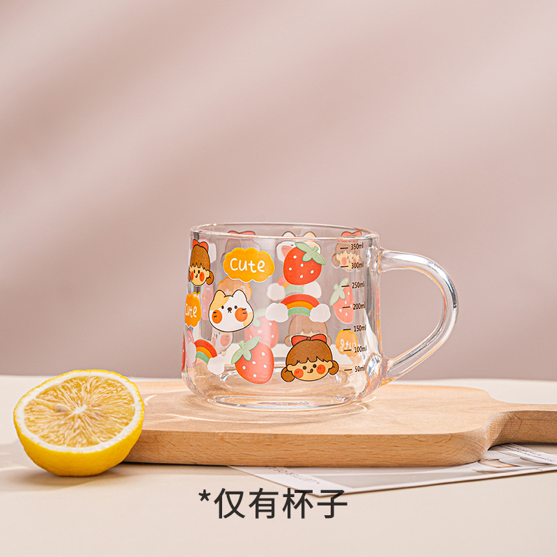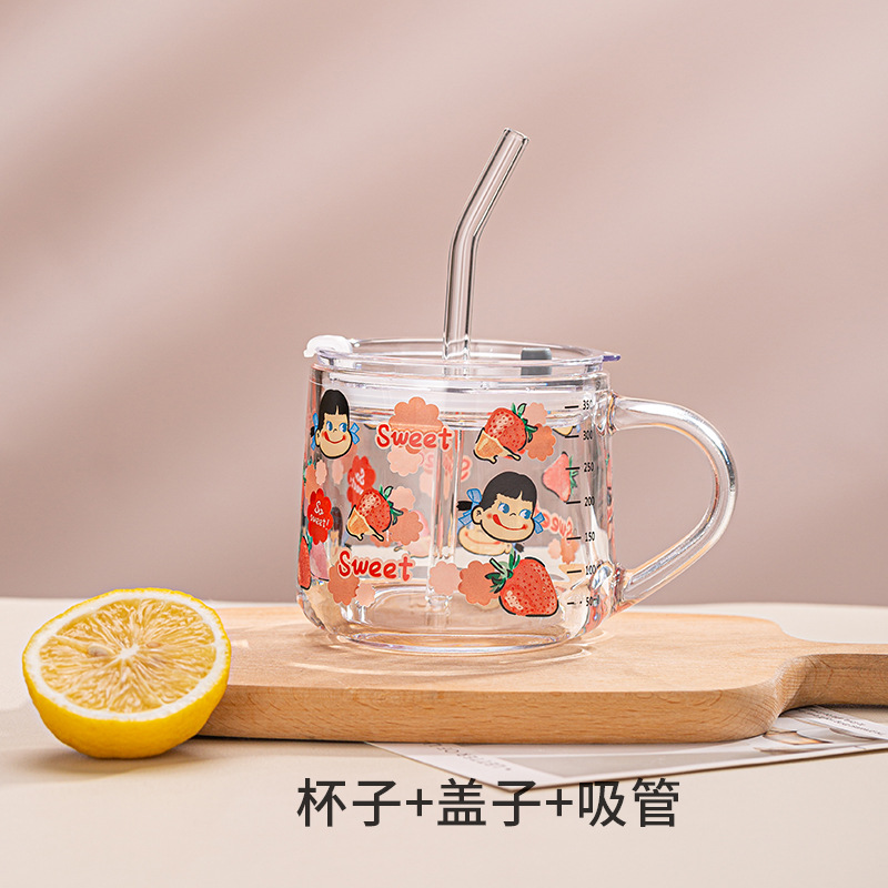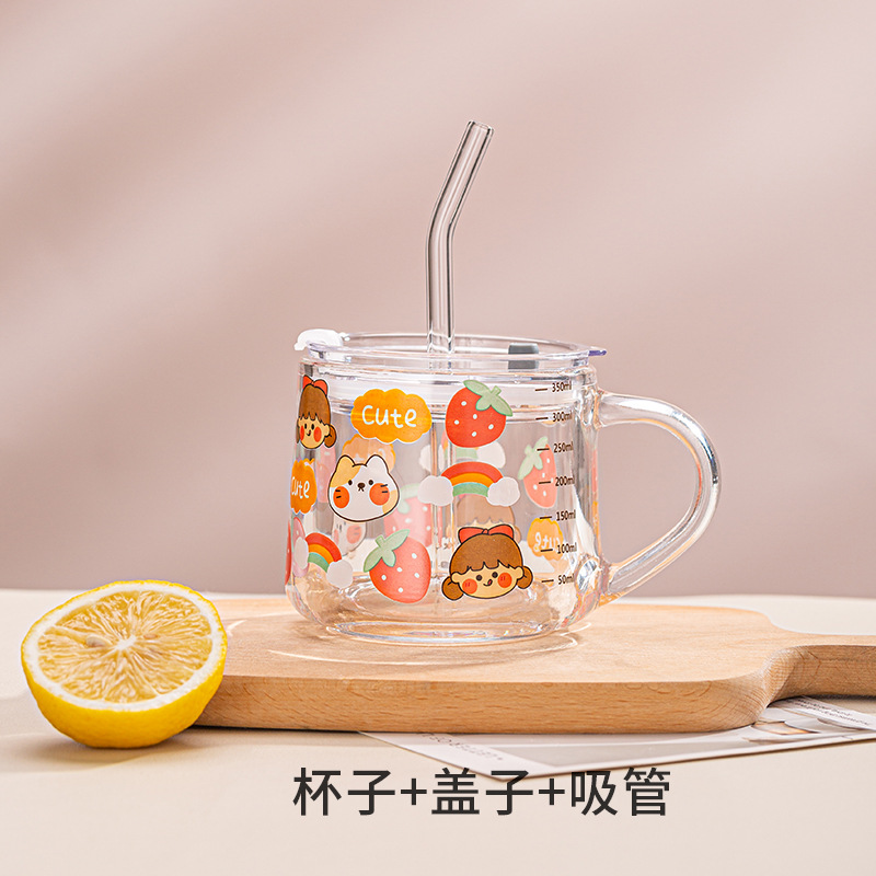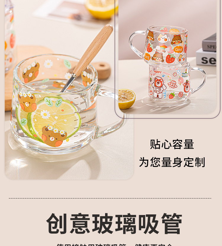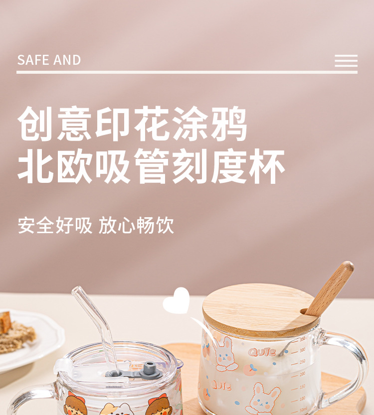 Ins 밀크 아침 식사 컵 짚으로 유리 디저트 컵 소녀 선물을위한 숟가락과 귀여운 인쇄 스케일 컵