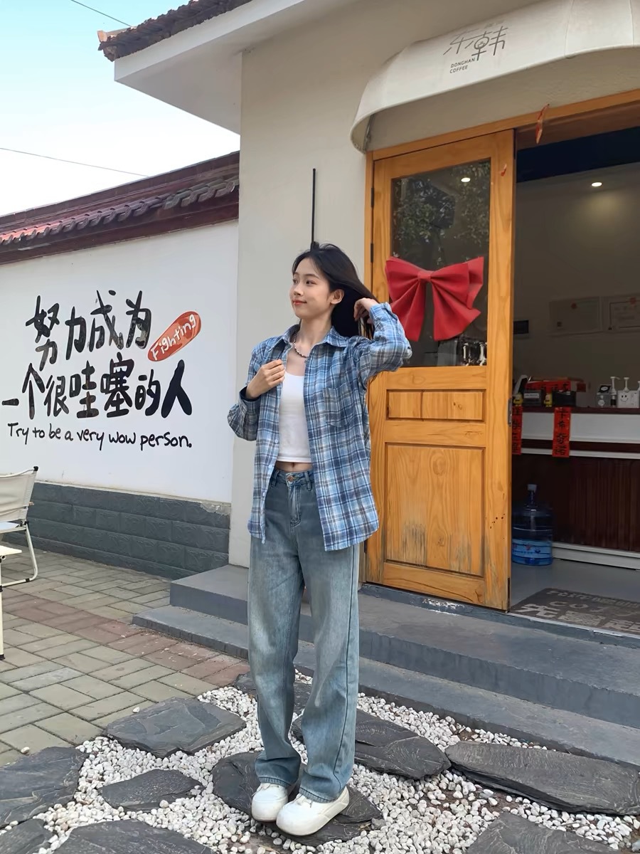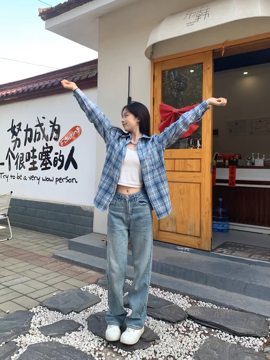 미국 레트로 블루 격자 무늬 셔츠 여성의 봄과 여름 디자인 센스 올 매치 태양 보호 긴 소매 셔츠 Bm 느슨한 재킷스토어 가기