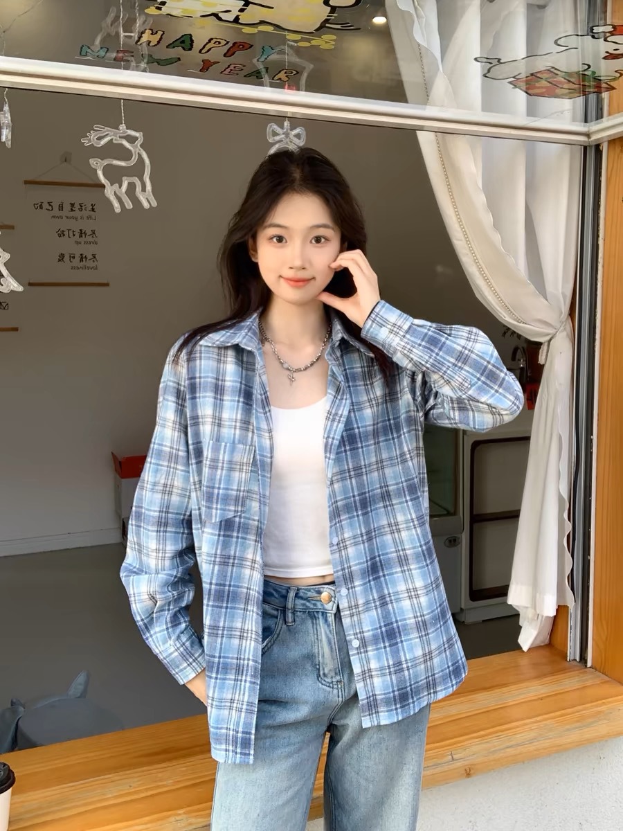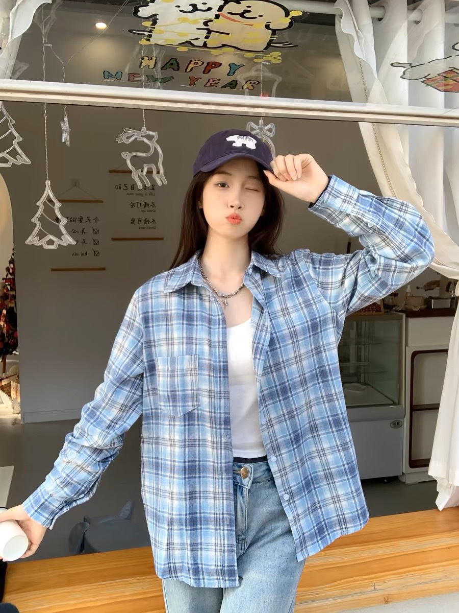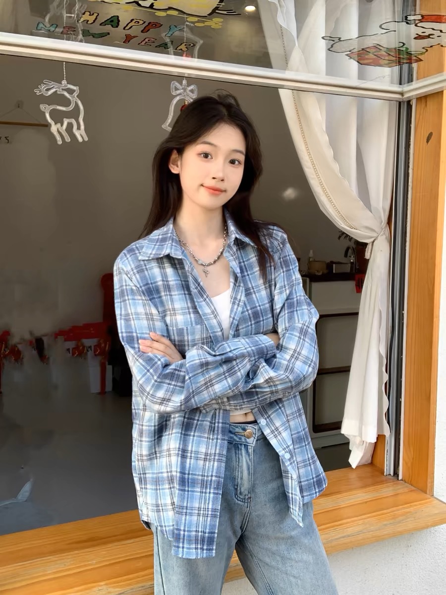 미국 레트로 블루 격자 무늬 셔츠 여성의 봄과 여름 디자인 센스 올 매치 태양 보호 긴 소매 셔츠 Bm 느슨한 재킷