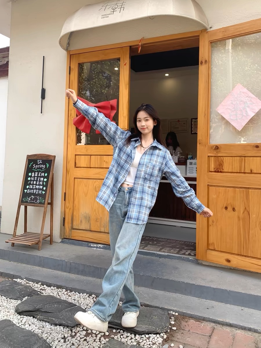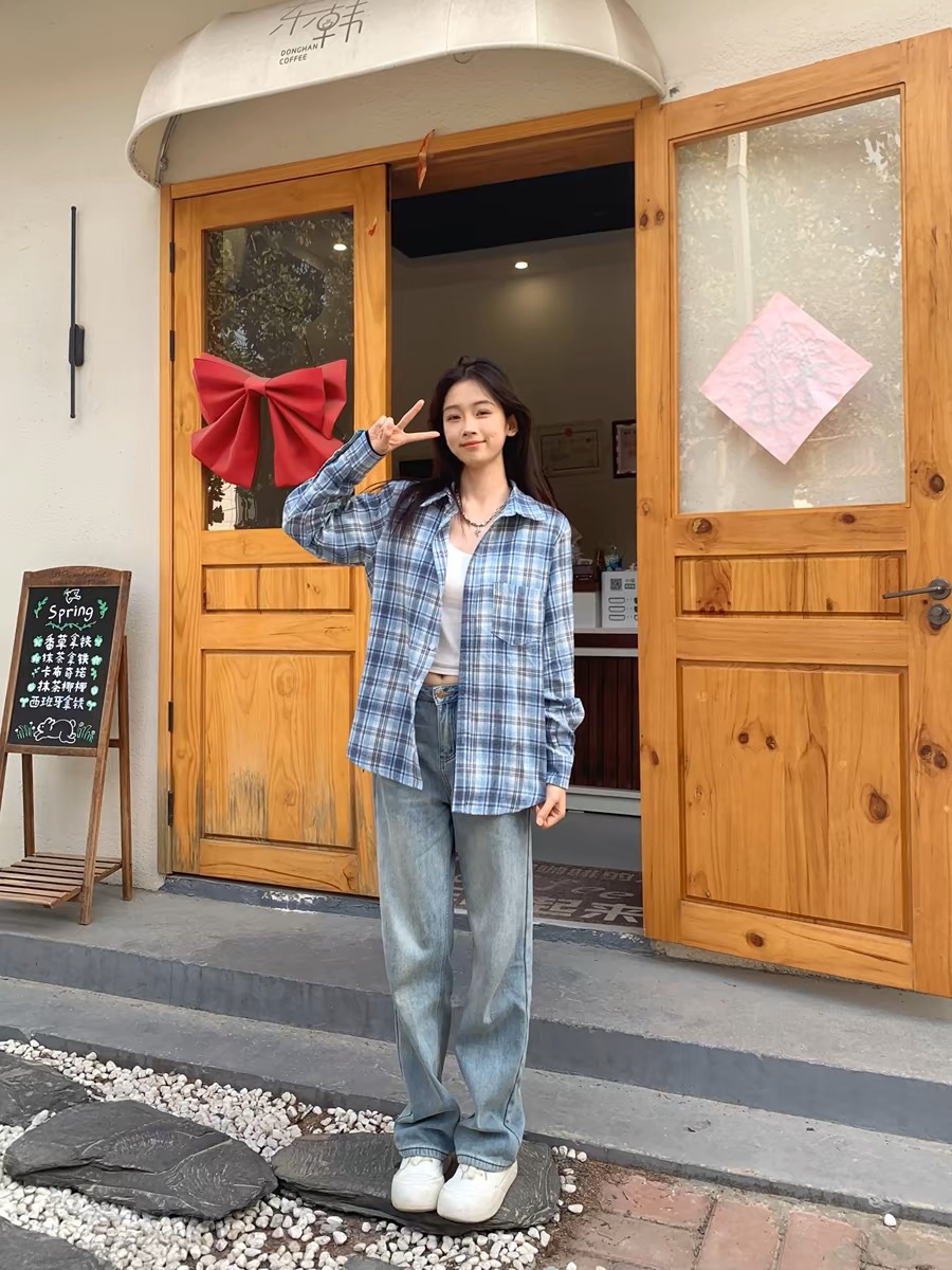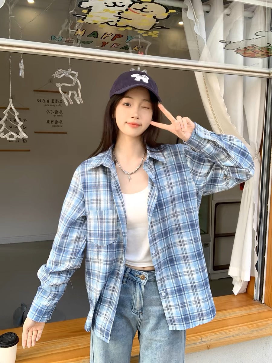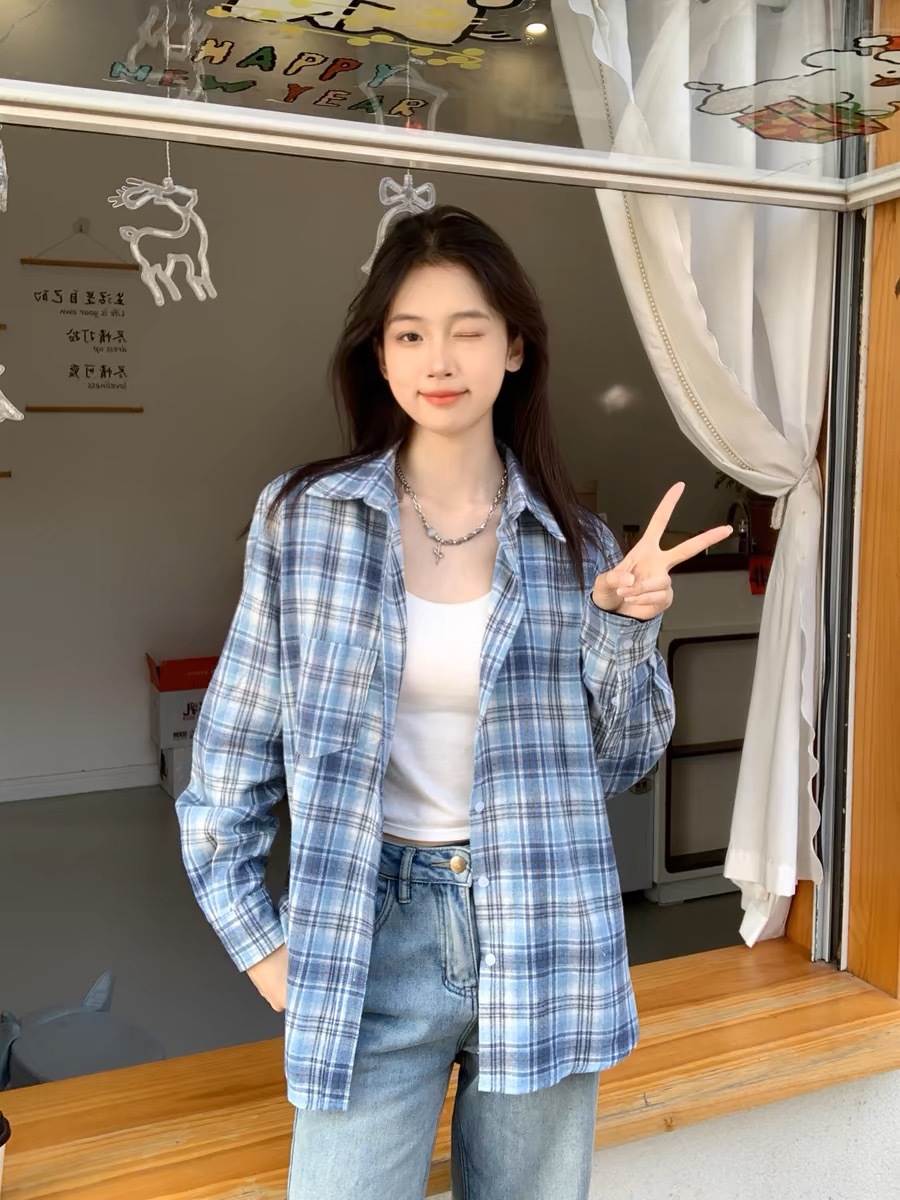 미국 레트로 블루 격자 무늬 셔츠 여성의 봄과 여름 디자인 센스 올 매치 태양 보호 긴 소매 셔츠 Bm 느슨한 재킷
