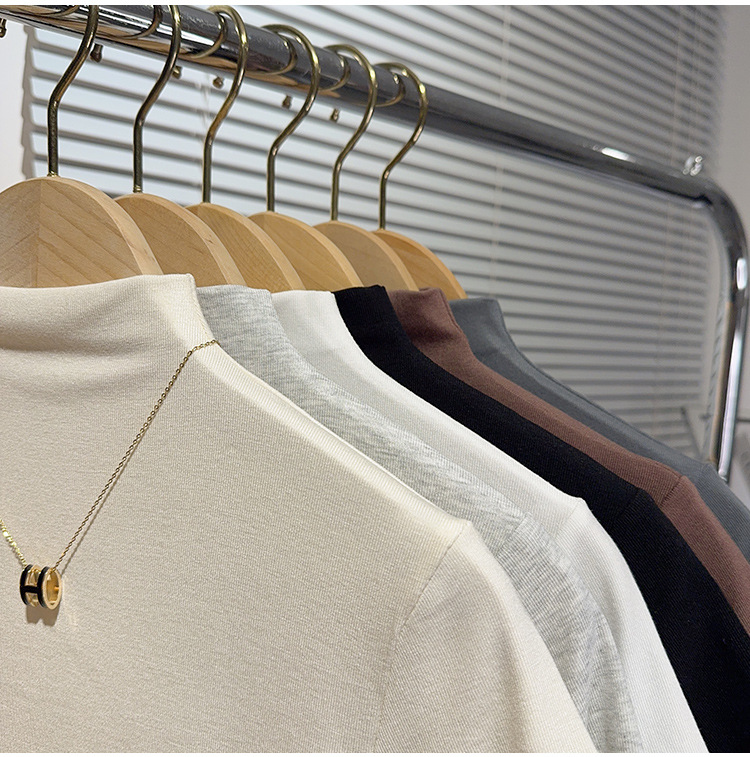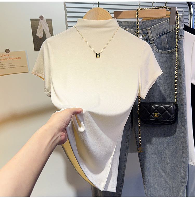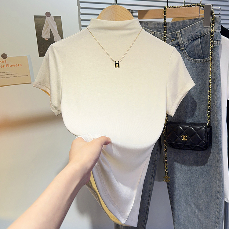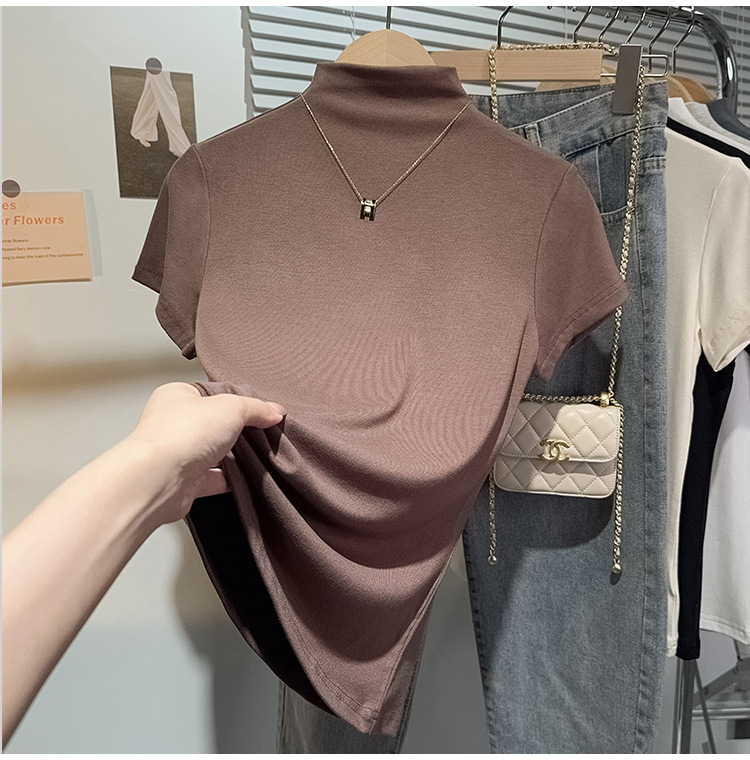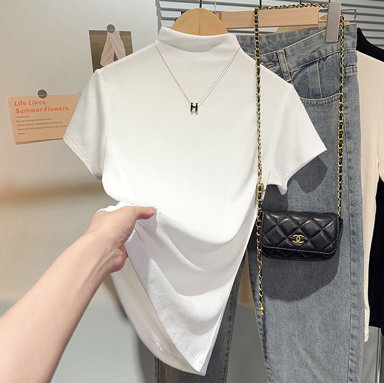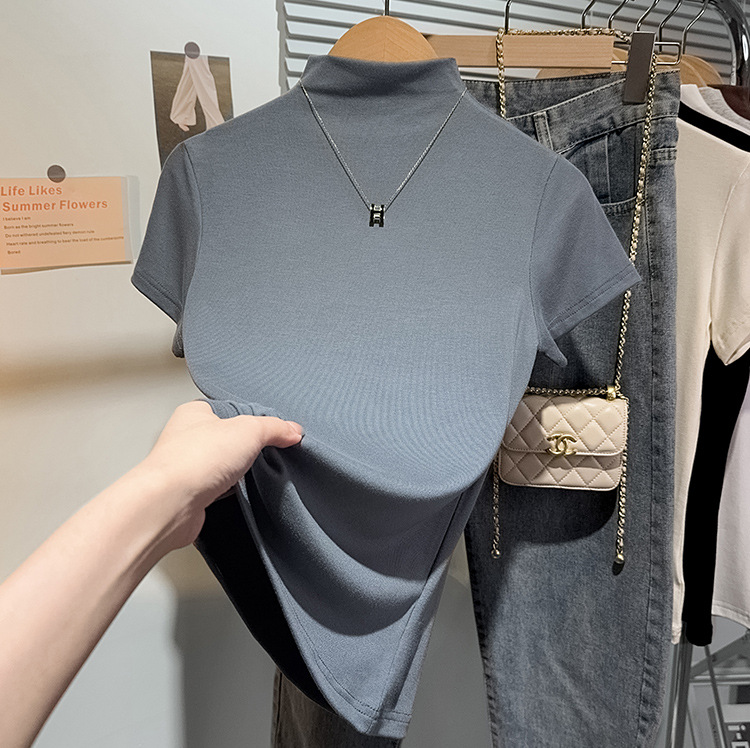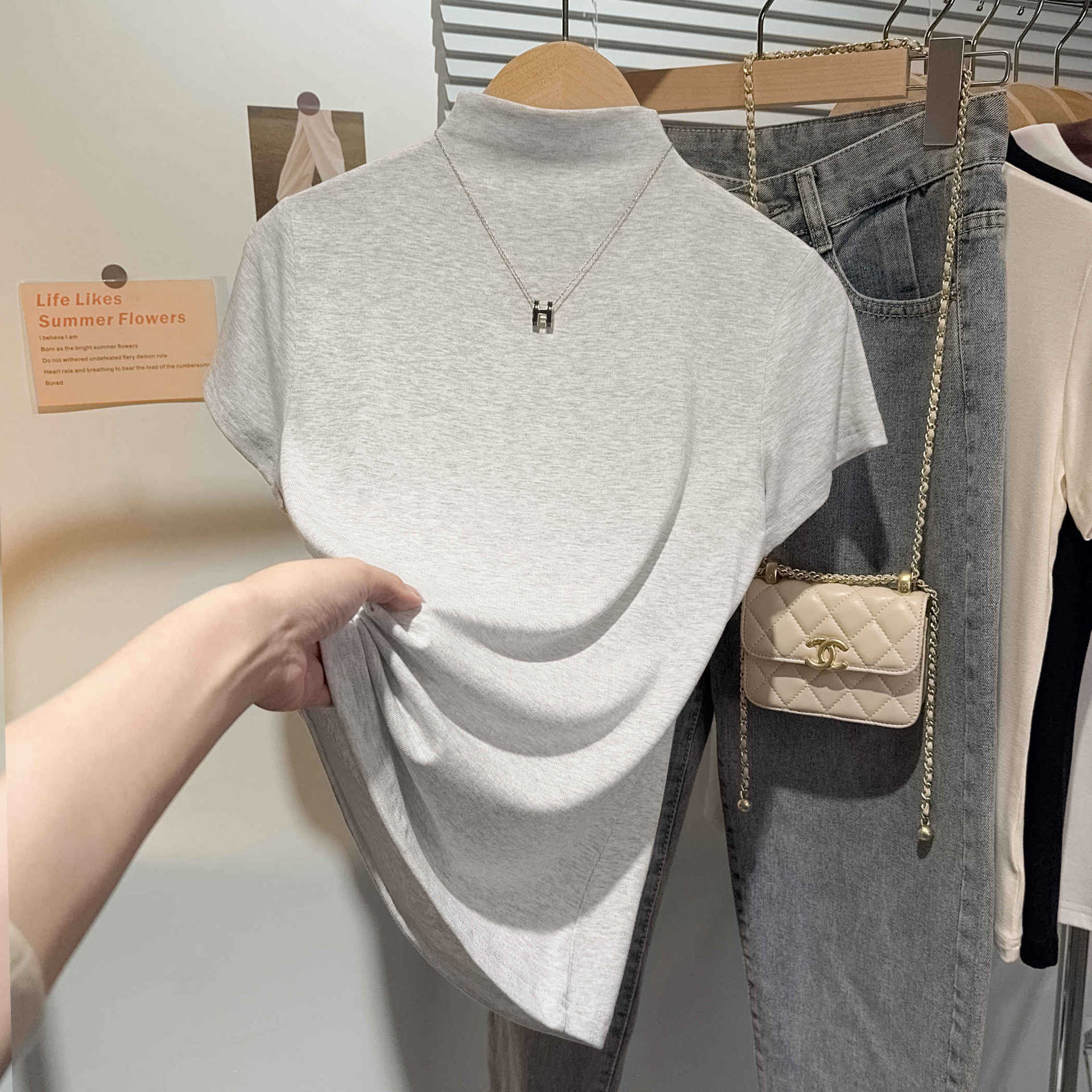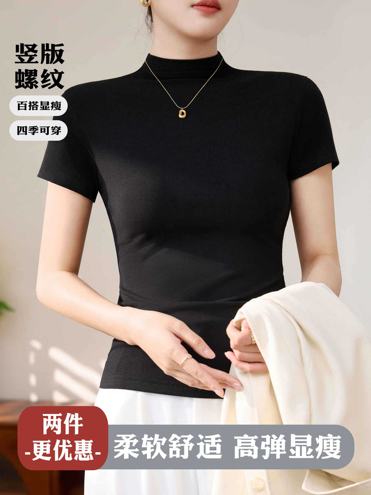 스레드 블랙 하프 하이 넥 반팔 티셔츠 여성용 2024 여름 뉴 숄더베이스 셔츠 디자인 웨스턴 스타일 탑스토어 가기