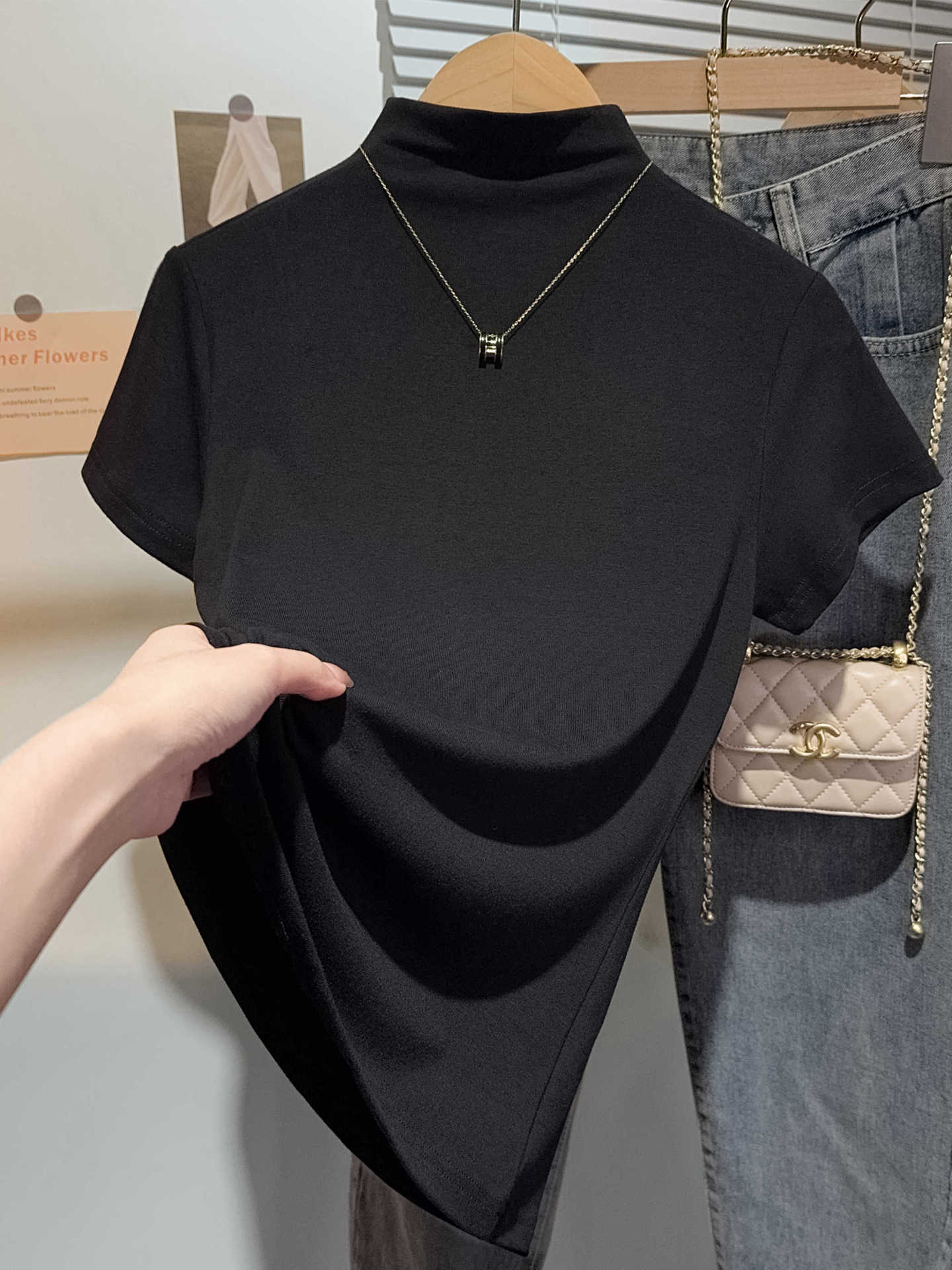 스레드 블랙 하프 하이 넥 반팔 티셔츠 여성용 2024 여름 뉴 숄더베이스 셔츠 디자인 웨스턴 스타일 탑