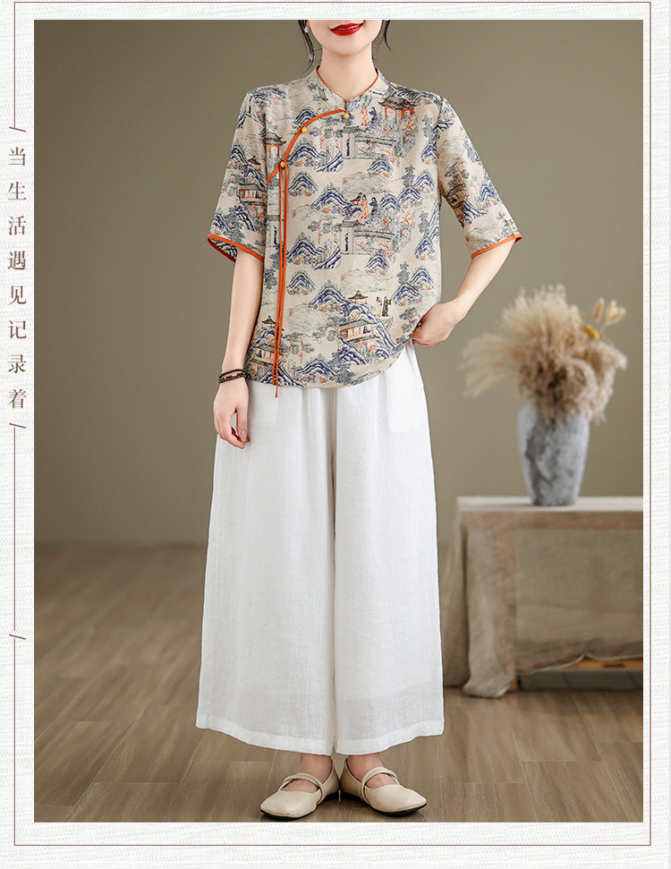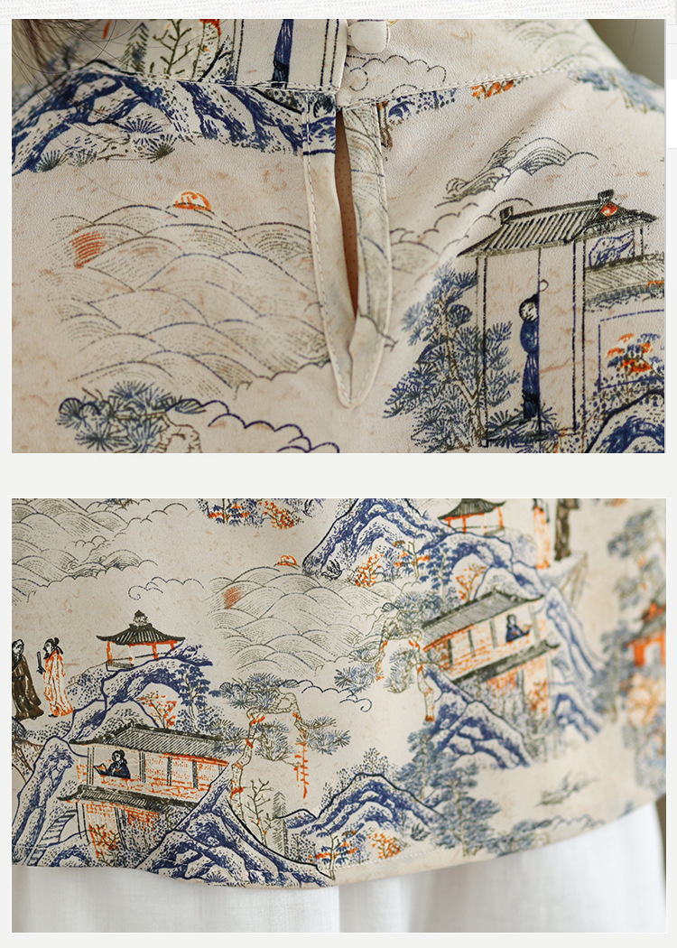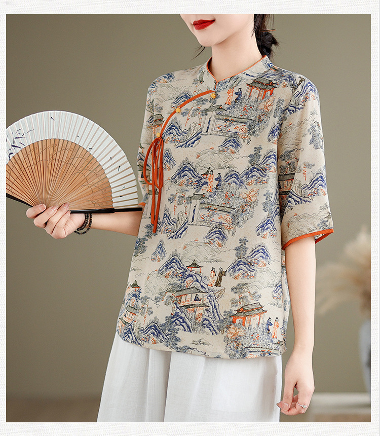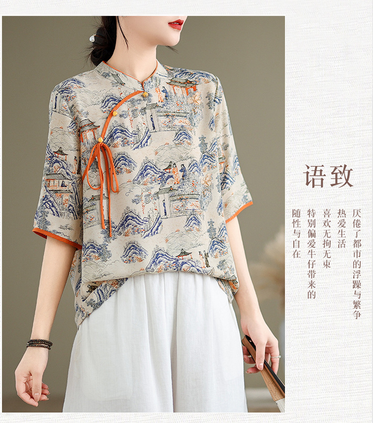 리얼 샷 2024 새로운 중국 인쇄 쉬폰 셔츠 플러스 사이즈 느슨한 패션 국가 스타일 5 소매 최고 여성