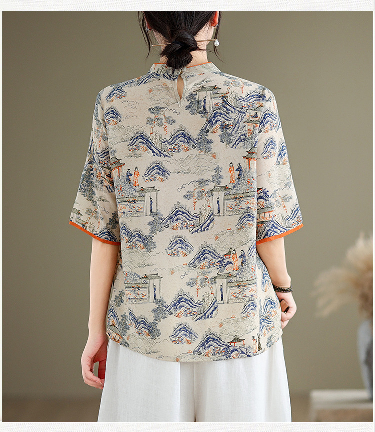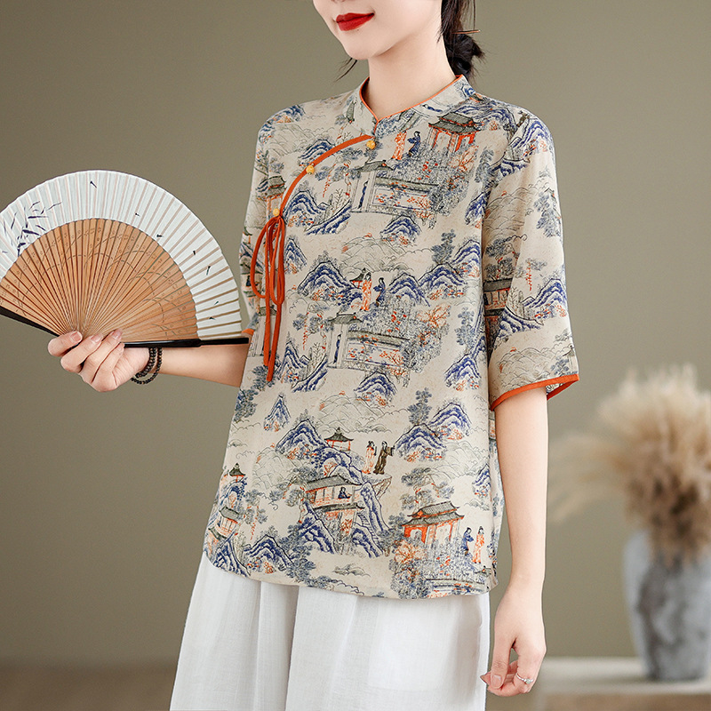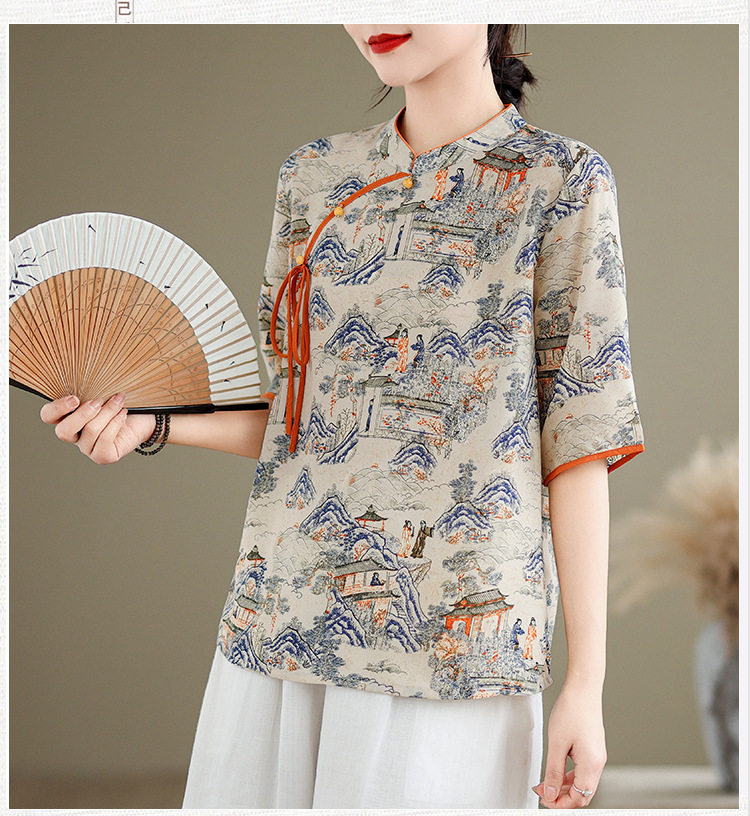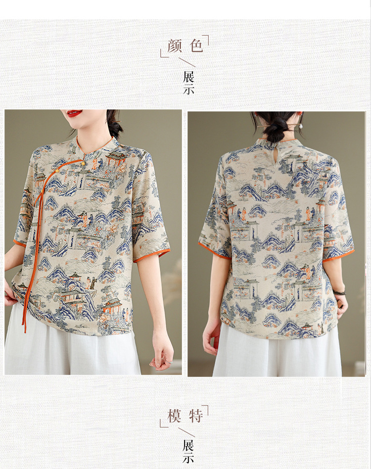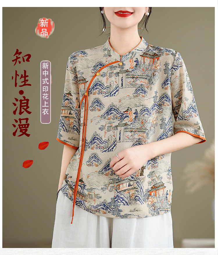 리얼 샷 2024 새로운 중국 인쇄 쉬폰 셔츠 플러스 사이즈 느슨한 패션 국가 스타일 5 소매 최고 여성스토어 가기