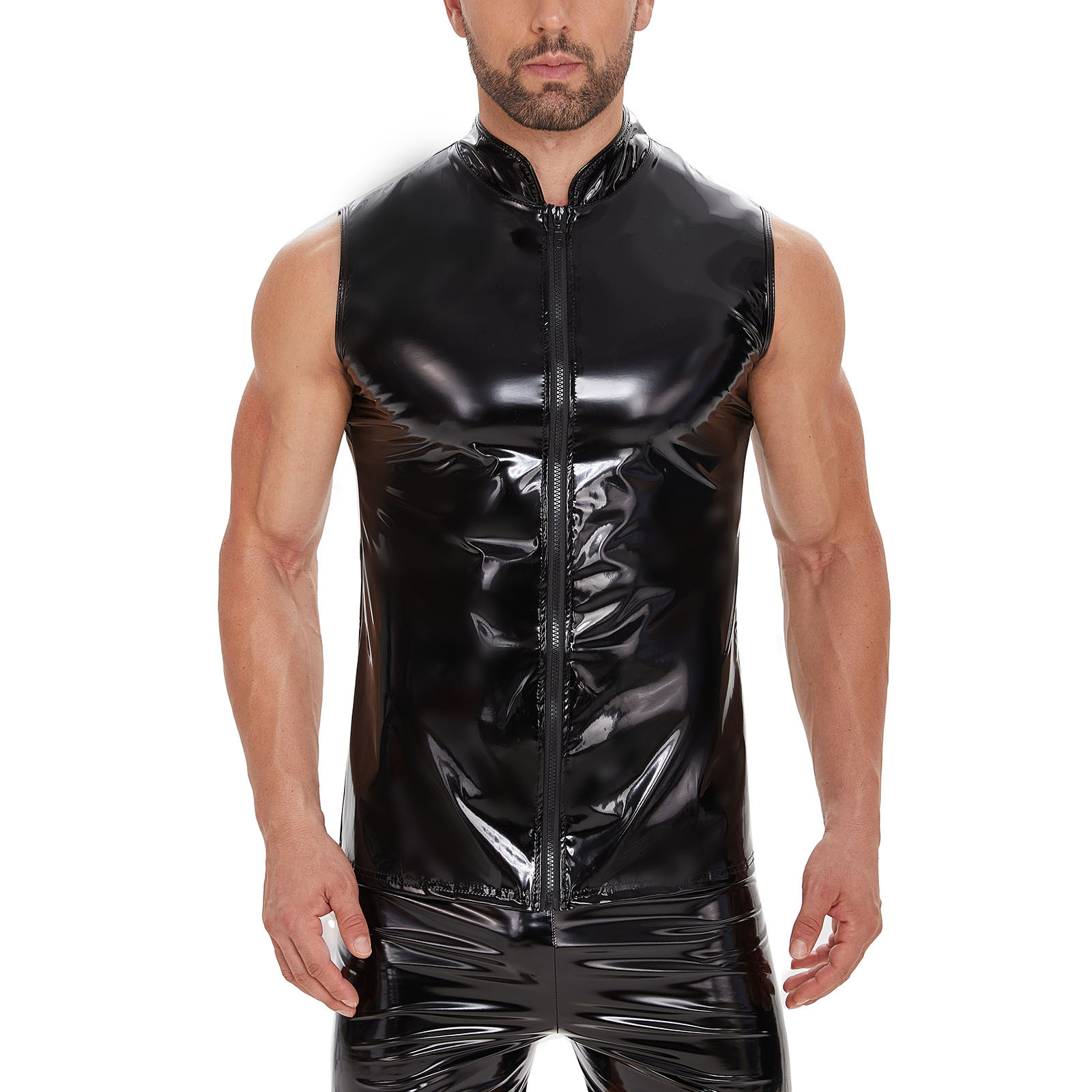 국경 간 제품 남성 거울 PU 밝은 가죽 조끼 슬림 핏 캐주얼 방수 칼라 민소매 가죽 조끼 냄새 없음