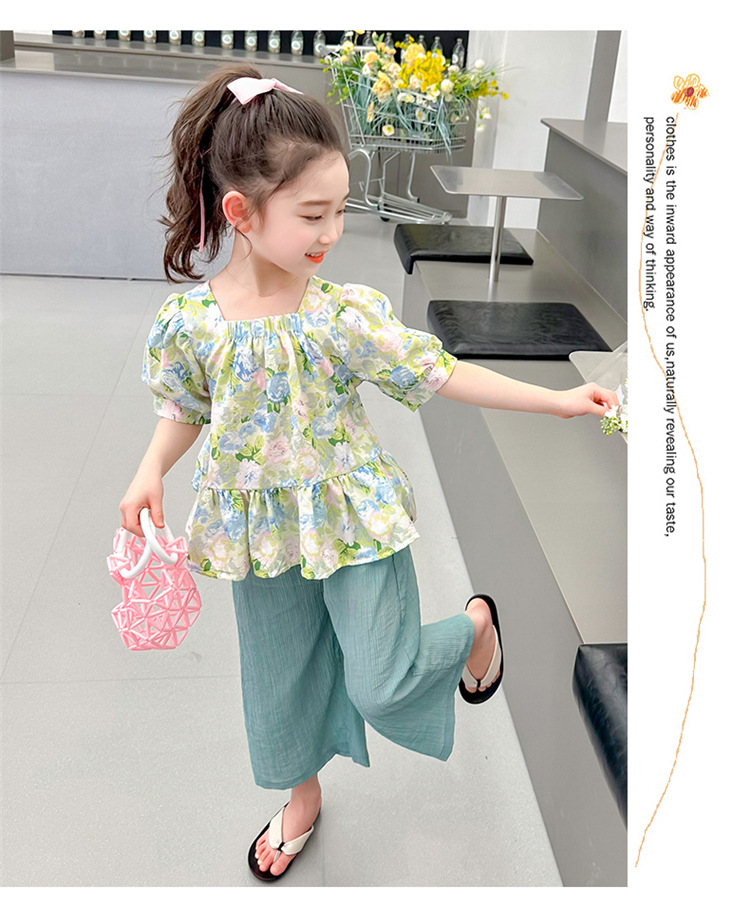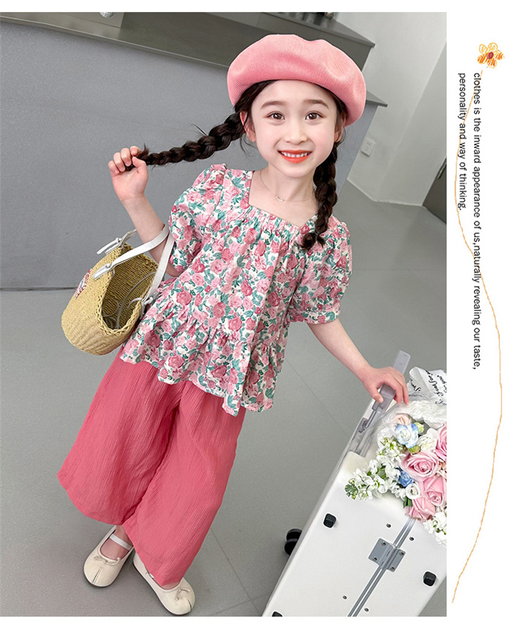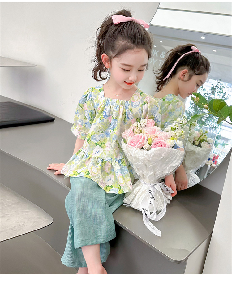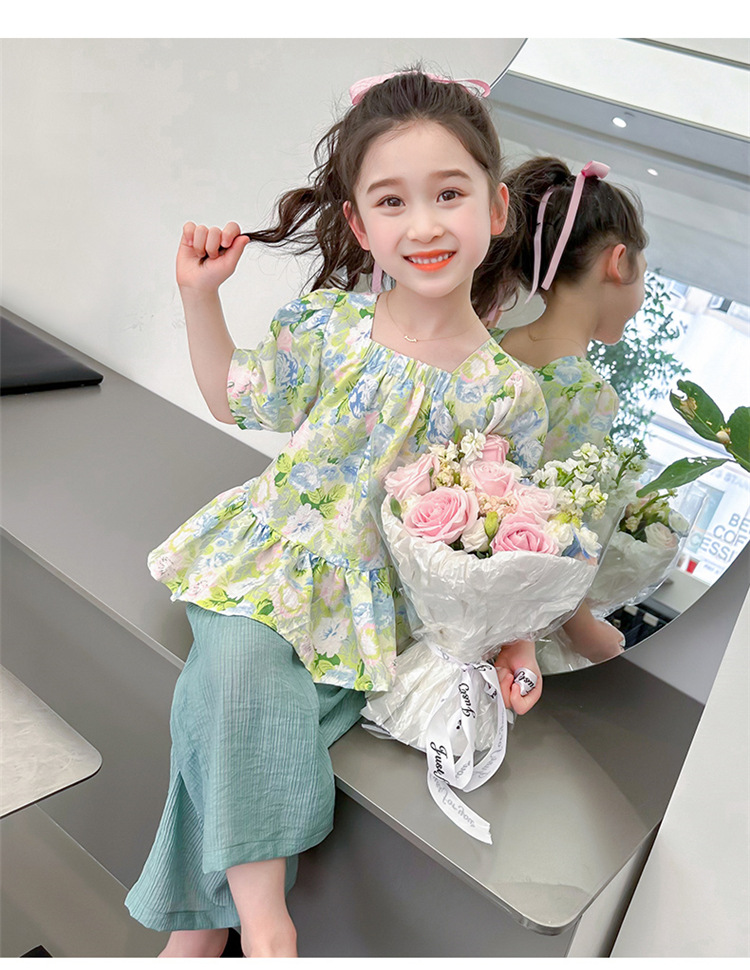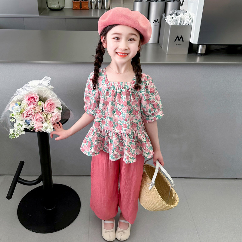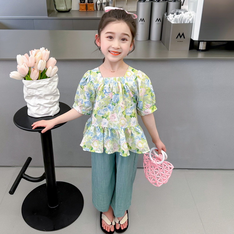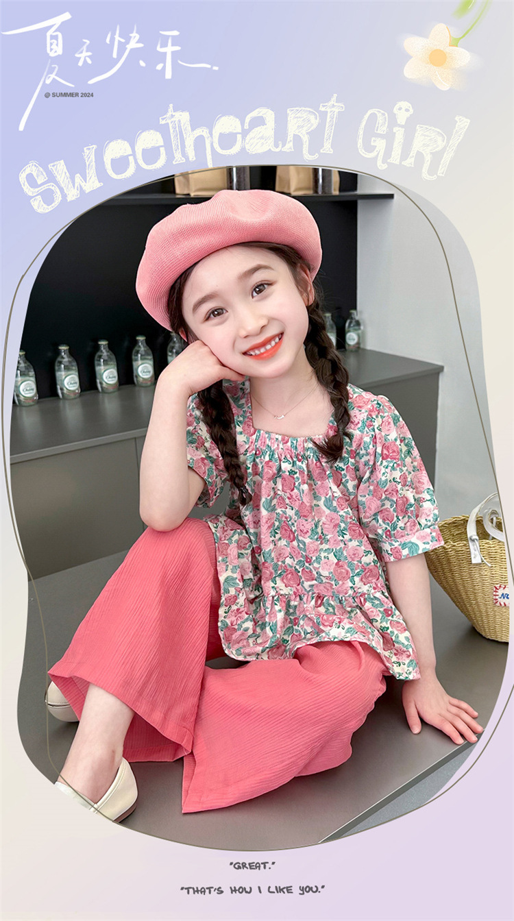 소녀 서양식 꽃 세트 2024 새로운 인터넷 인기있는 여름 어린이 달콤한 반팔 탑 와이드 레그 바지 투피스 세트