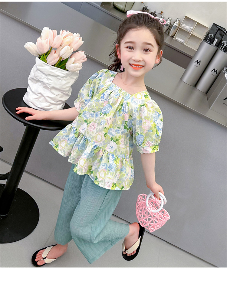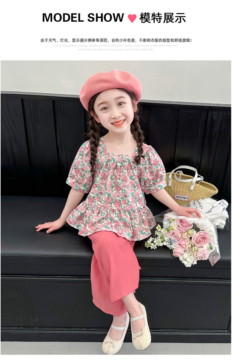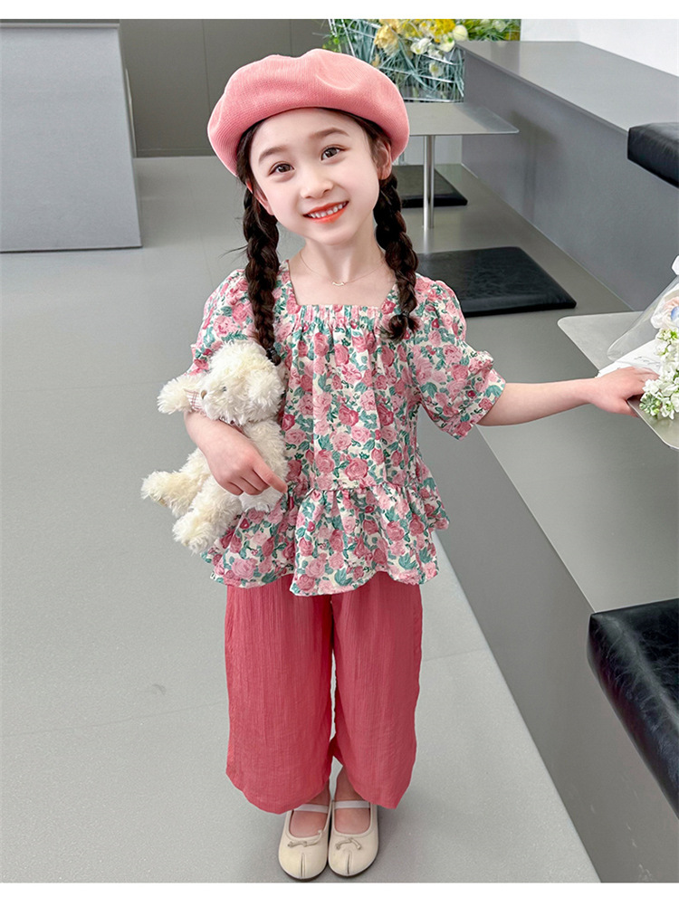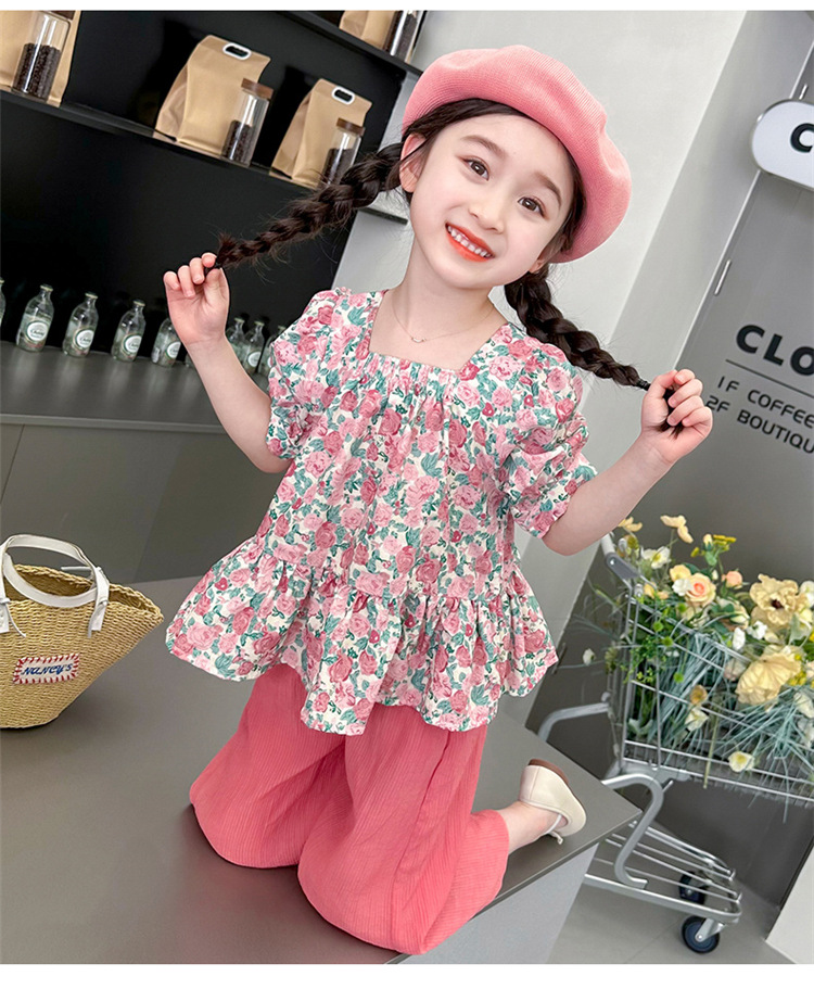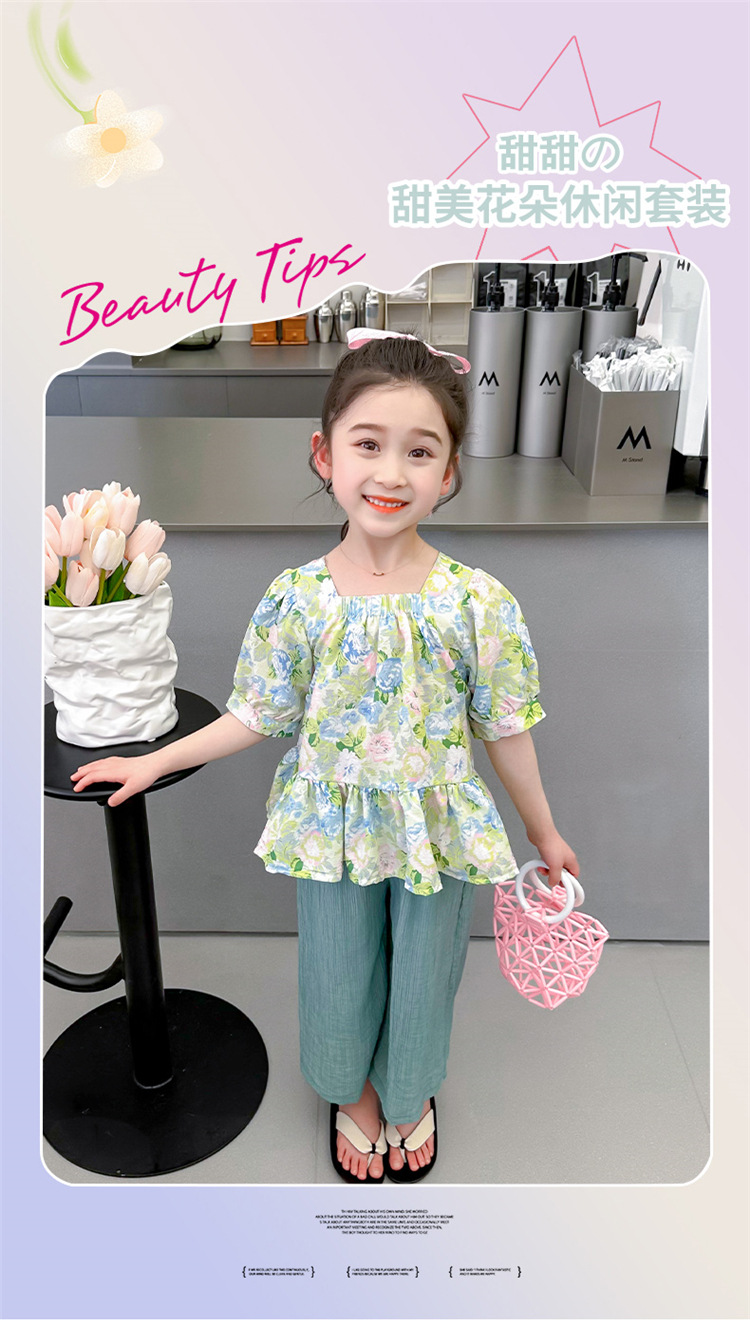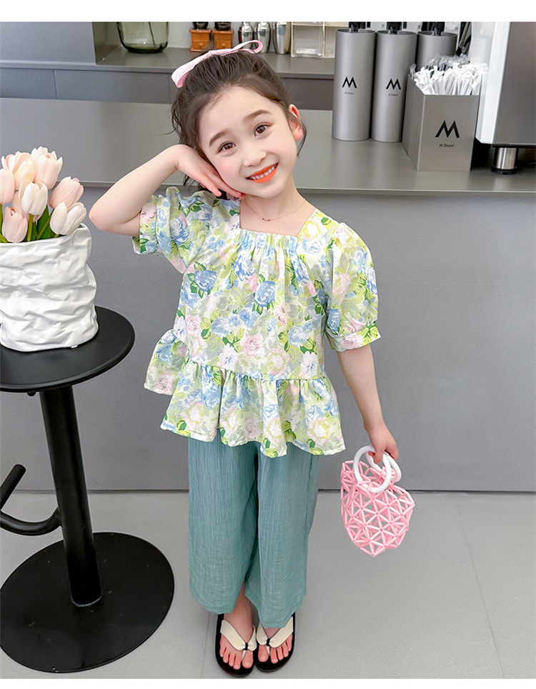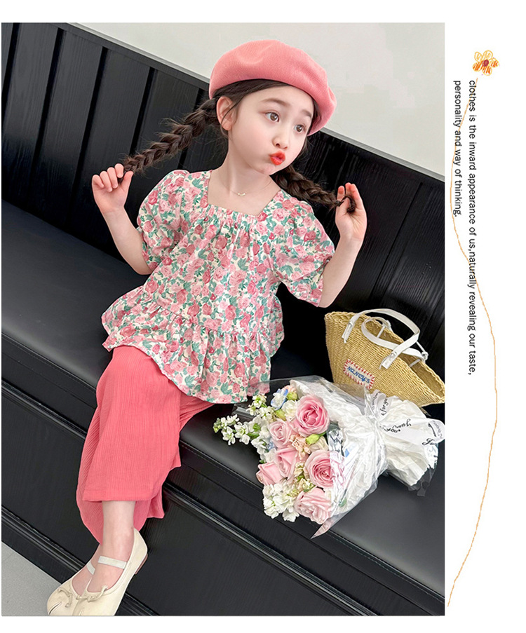 소녀 서양식 꽃 세트 2024 새로운 인터넷 인기있는 여름 어린이 달콤한 반팔 탑 와이드 레그 바지 투피스 세트