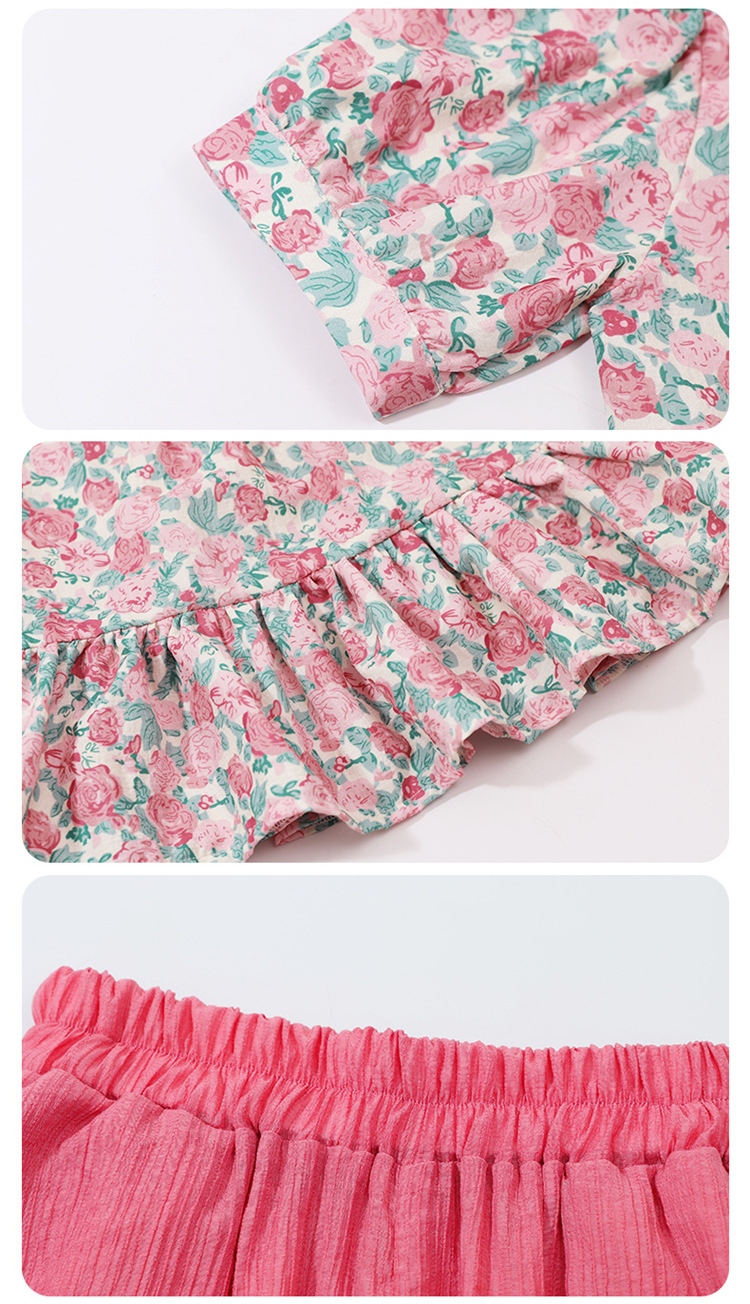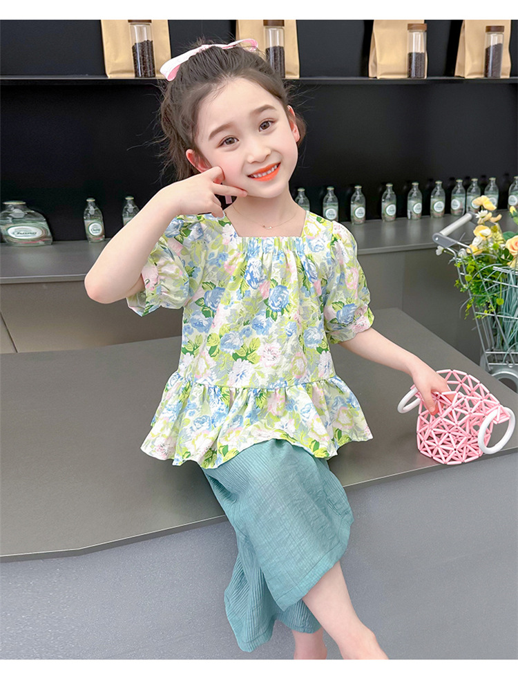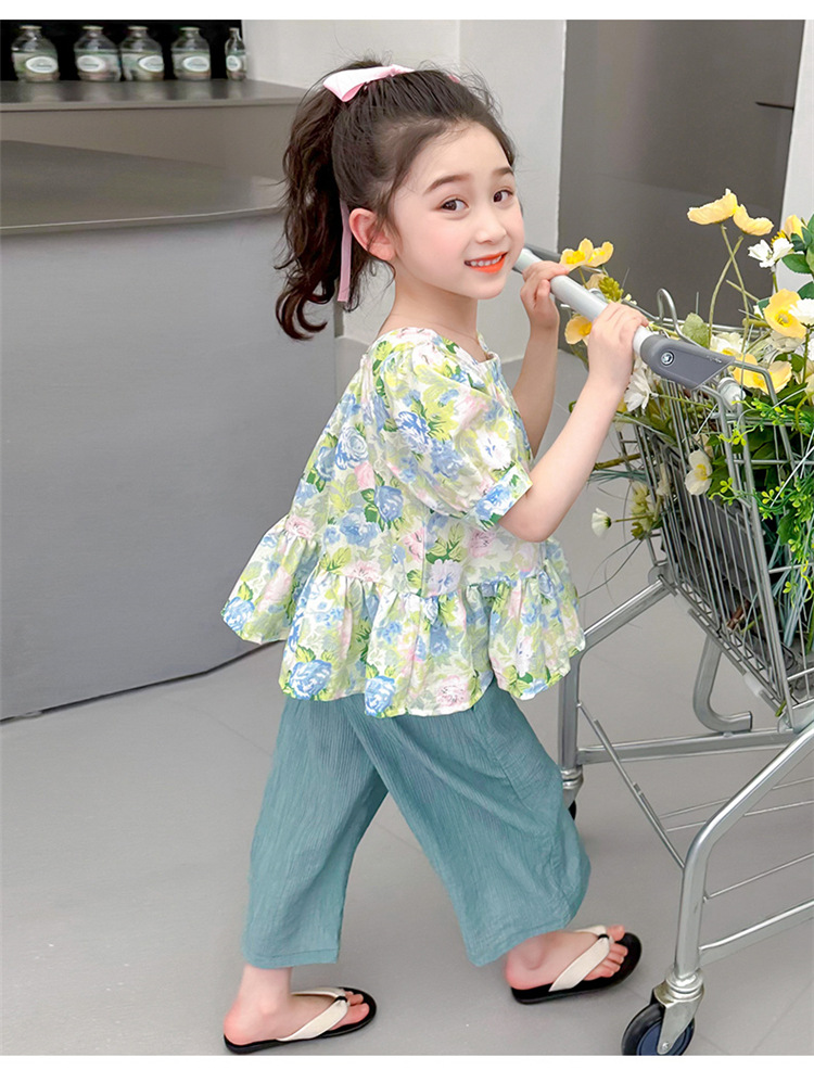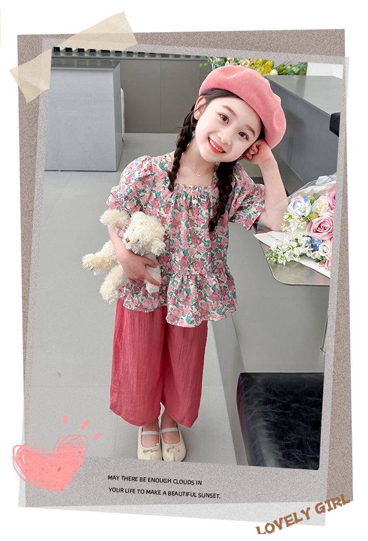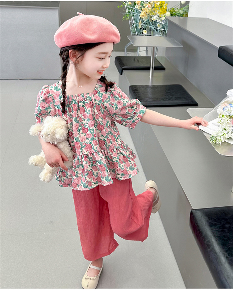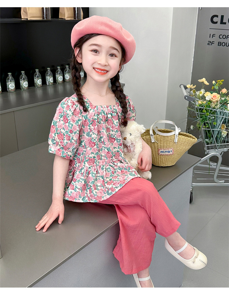 소녀 서양식 꽃 세트 2024 새로운 인터넷 인기있는 여름 어린이 달콤한 반팔 탑 와이드 레그 바지 투피스 세트
