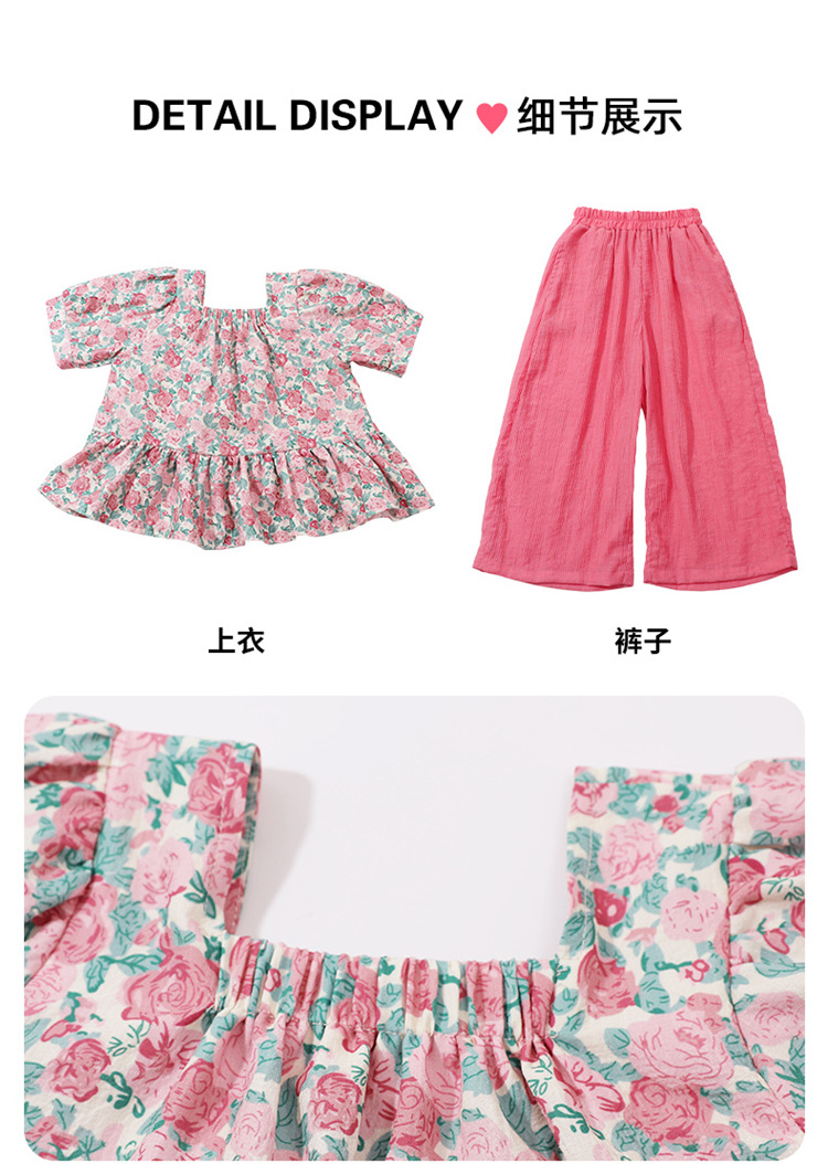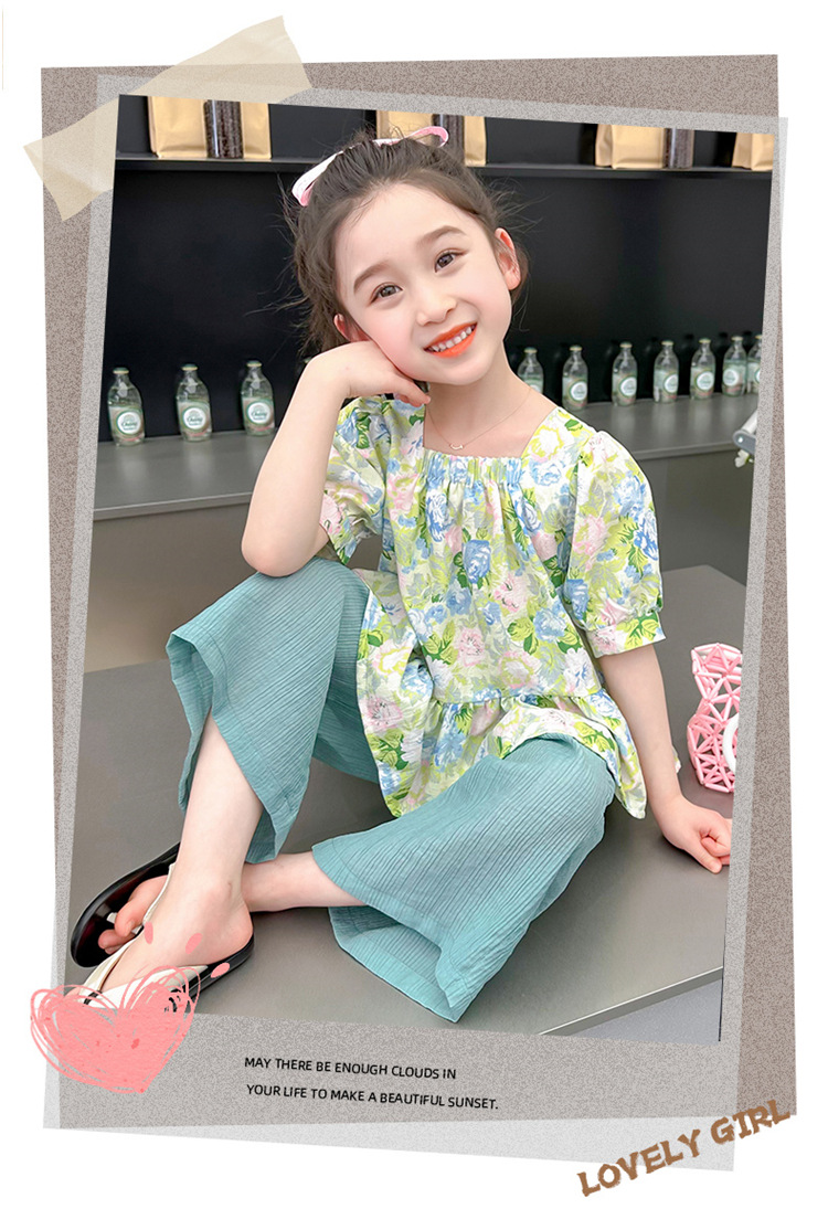 소녀 서양식 꽃 세트 2024 새로운 인터넷 인기있는 여름 어린이 달콤한 반팔 탑 와이드 레그 바지 투피스 세트스토어 가기