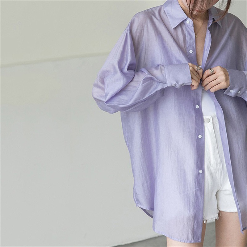 2026년 여름 신상품 퓨어&시스루 셔츠, 뒷면 슬릿과 끈이 있는 쉬폰 자외선 차단 셔츠, 얇은 셔츠 탑 여성용스토어 가기