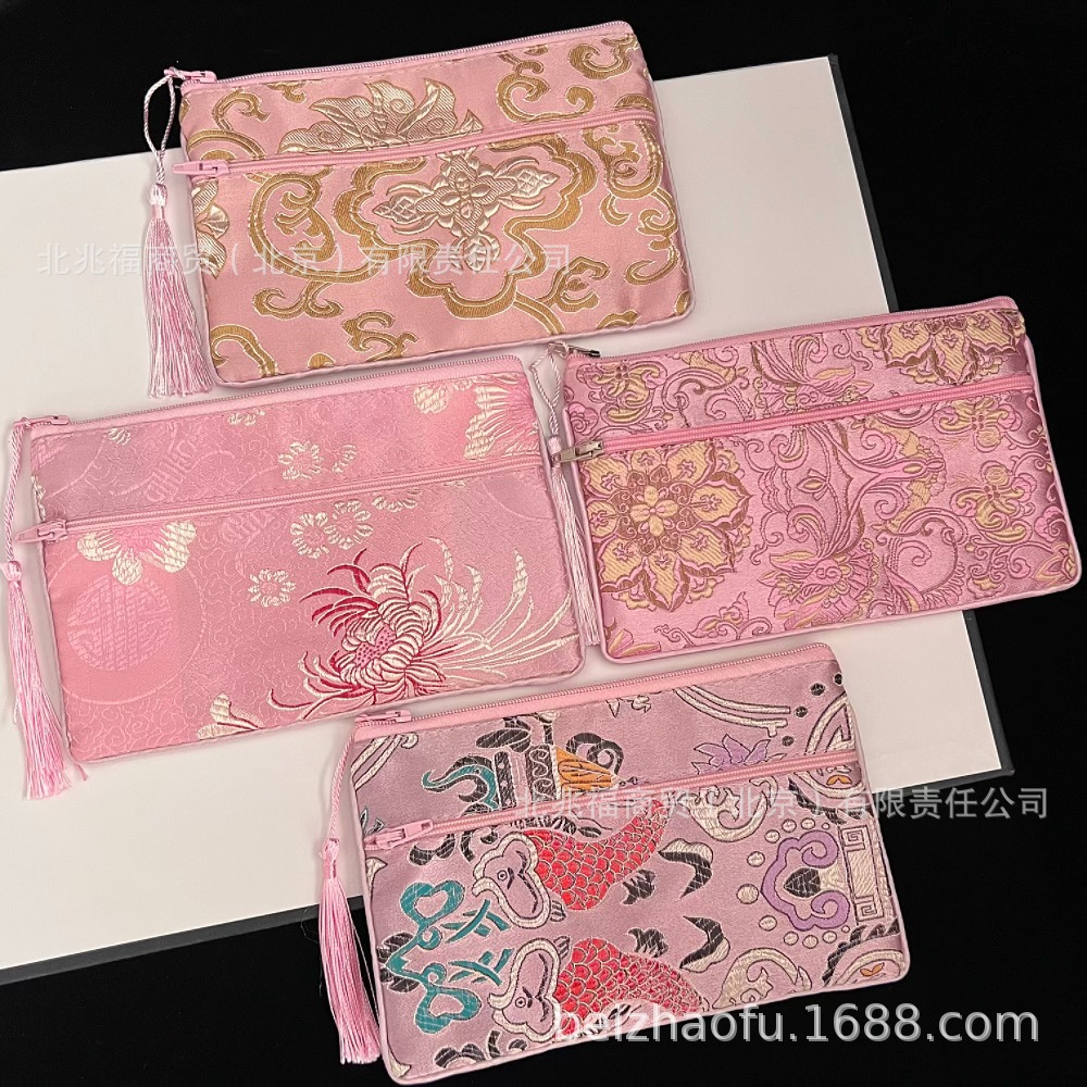 새로운 중국 스타일 브로케이드 더블 지퍼 동전 지갑 숙녀 긴 중국 보석 가방 저장 메이크업 작은 가방 키스토어 가기