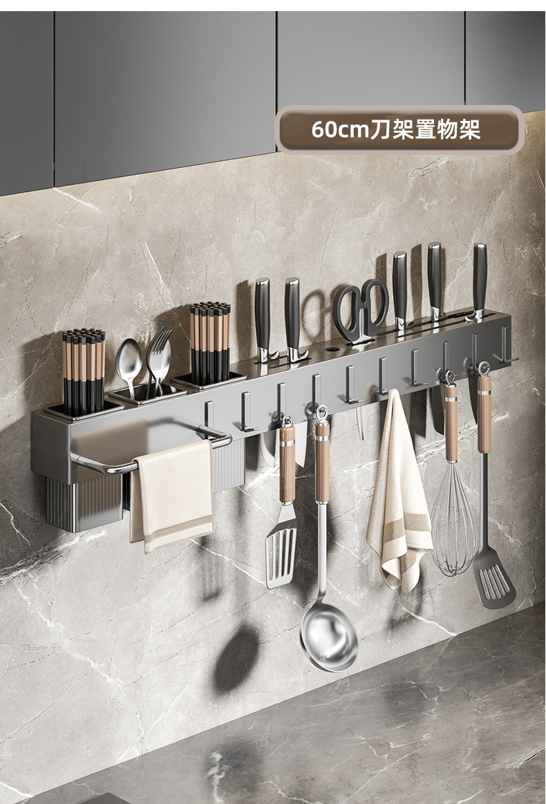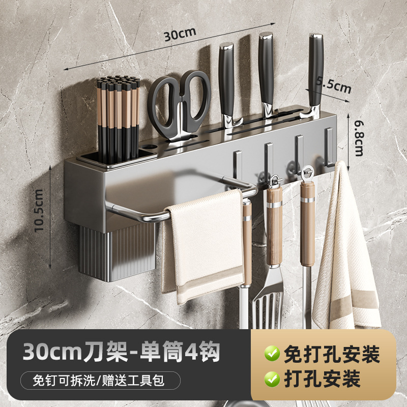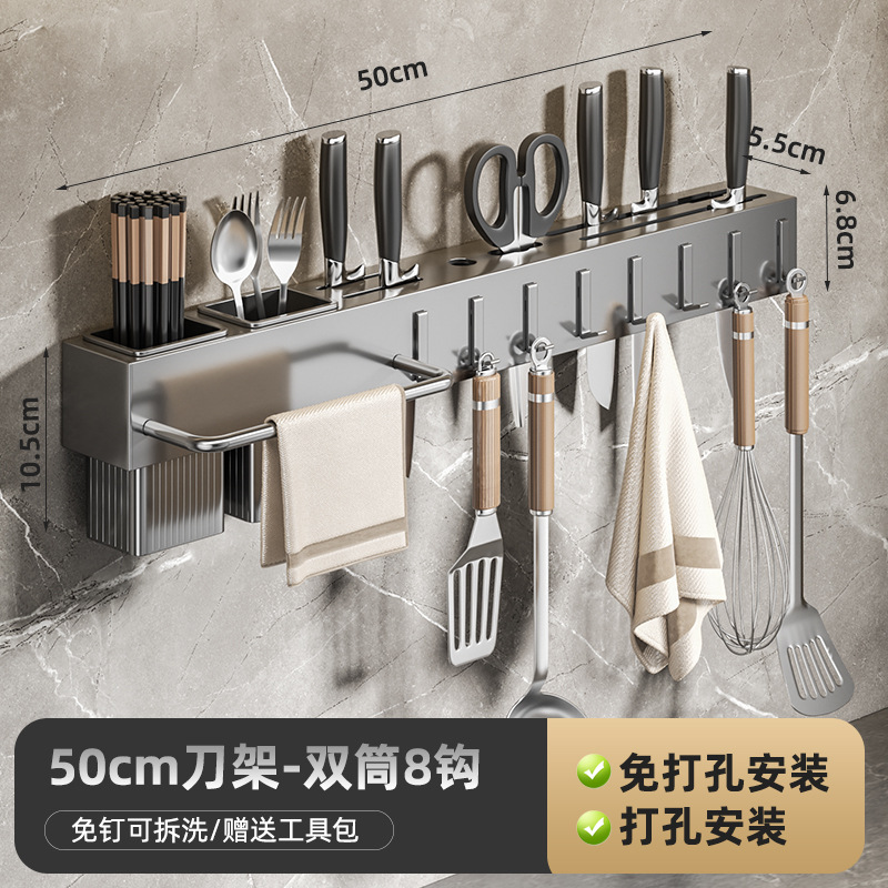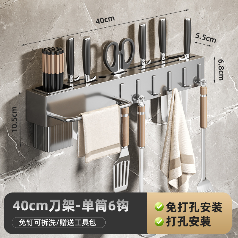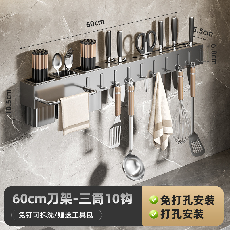 벽에 장착 된 다기능 나이프 홀더 펀치 프리 주방 나이프 홀더 젓가락 케이지 통합 주방 나이프 홀더 스토리지 랙스토어 가기