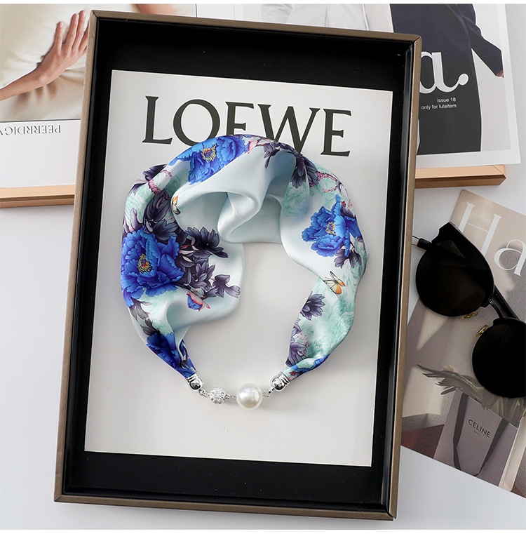 • 쌀 블루 (삼색 꽃) 진주 자석 버클 실크 스카프