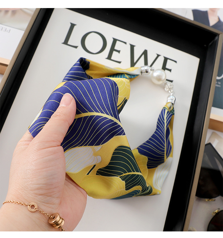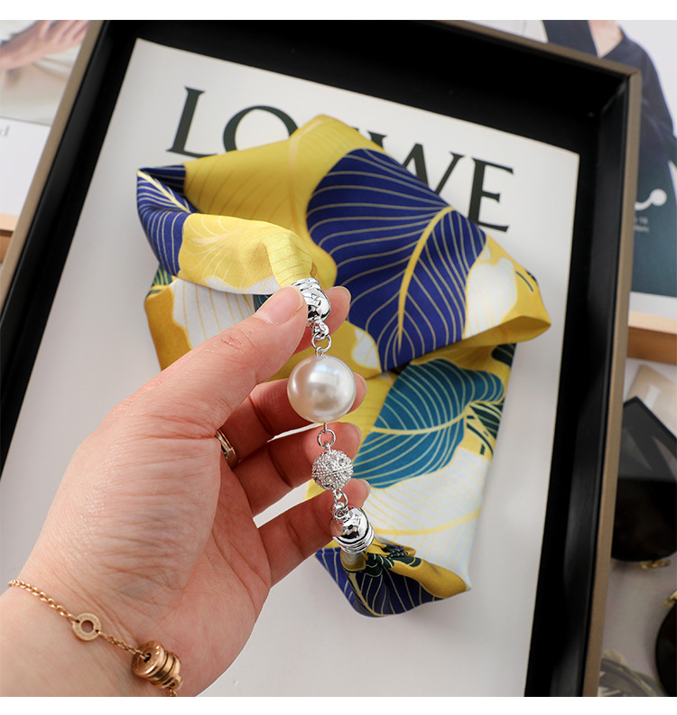 • 네이비 노란색 (부주의 한 잎) 진주 마그네틱 버클 실크 스카프