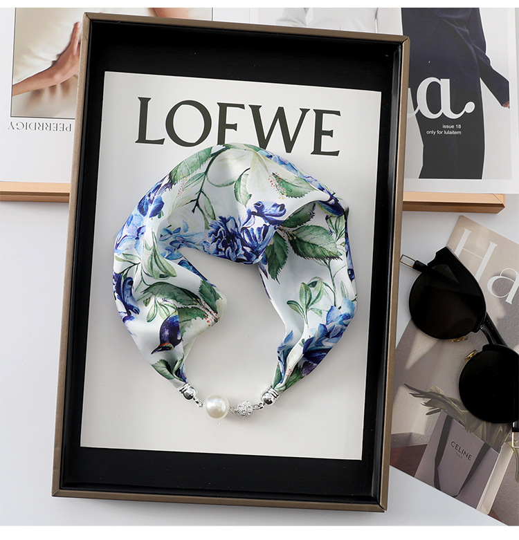 • 블랙 블루 화이트 배경 (가지와 잎 추가) 진주 마그네틱 버클 실크 스카프