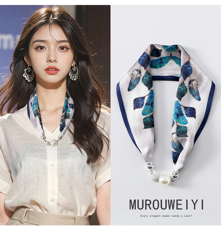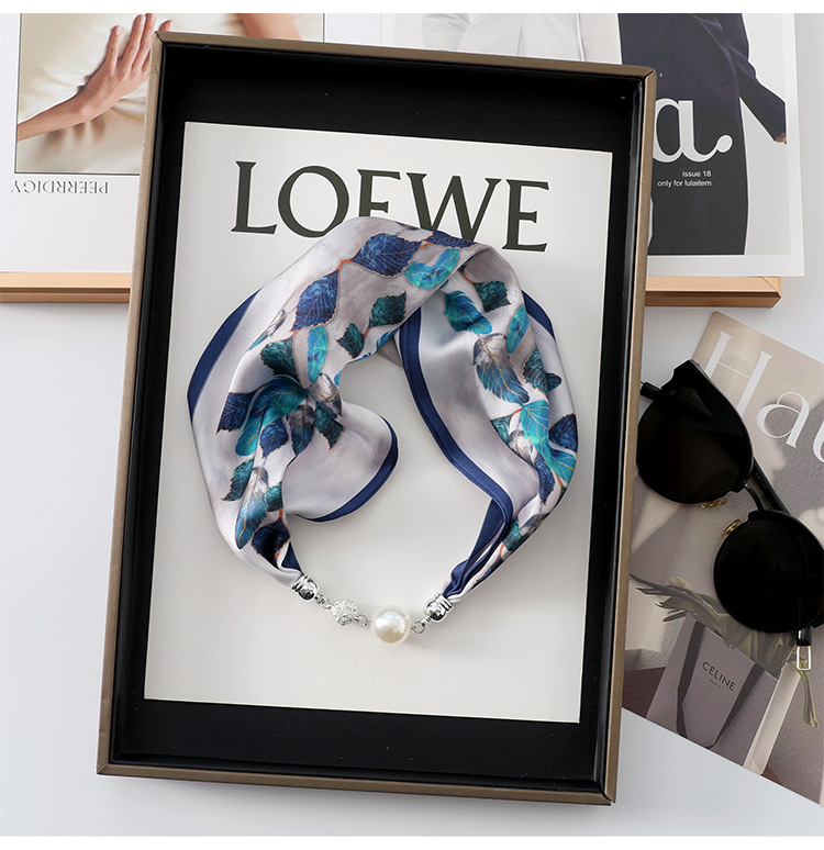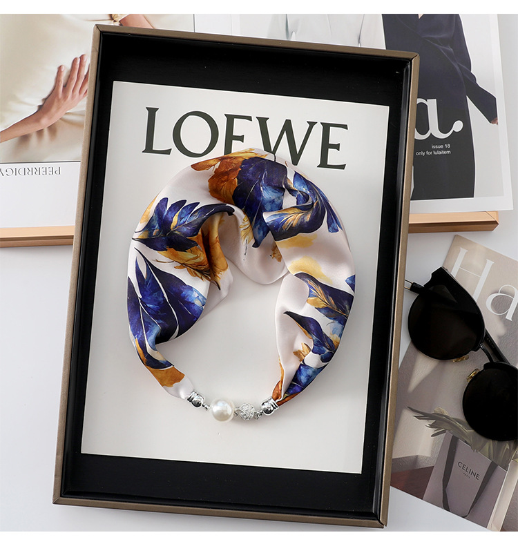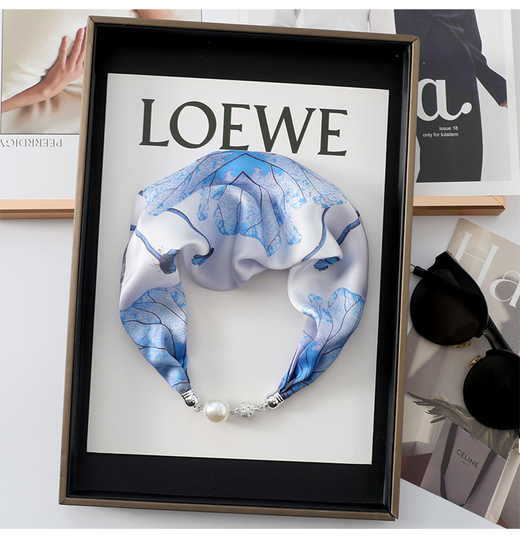 • 블루 퍼플 (불규칙한 잎 연결) 진주 마그네틱 버클 실크 스카프