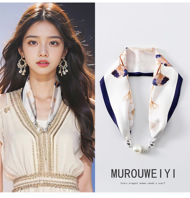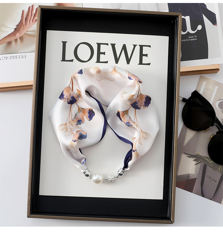 • 흰색 배경 네이비 가장자리 (은행나무 잎) 진주 마그네틱 버클 실크 스카프