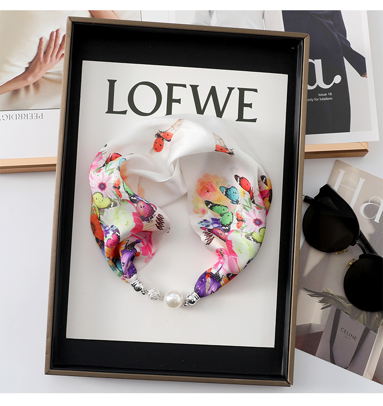 • 진주 자석 버클 실크 스카프 다채로운 베이지 (꽃 나비 와이)