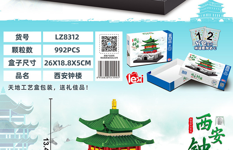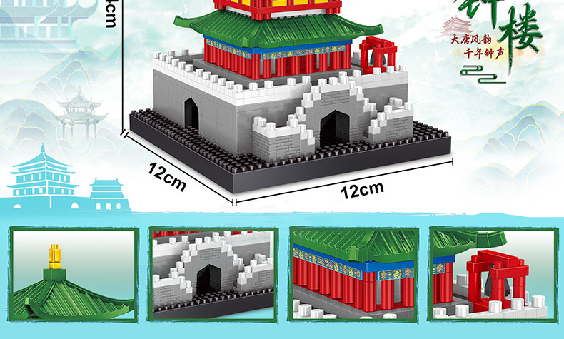 Lezi 8312-13 Xi 'an Bell Tower 마이크로 다이아몬드 빌딩 시리즈 조립 건물 블록 장난감 장식품 어린이 선물