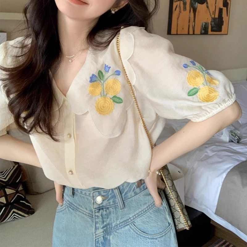 프랑스 스타일 인형 칼라 쉬폰 셔츠 짧은 소매 여성의 달콤한 자수 퍼프 슬리브 꽃 꽃잎 칼라 셔츠 여성의 여름 얇은