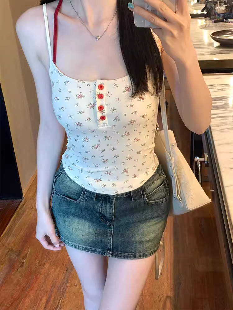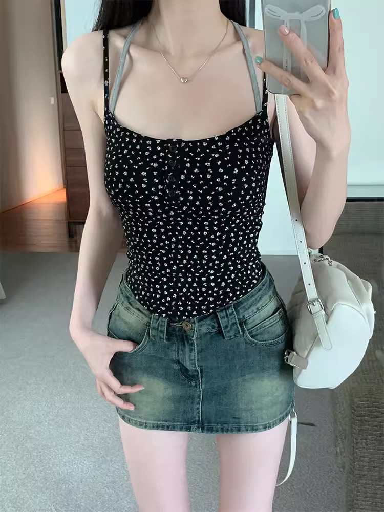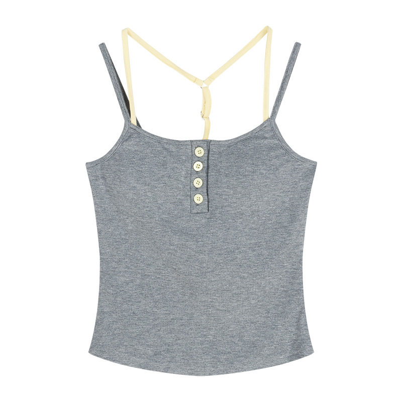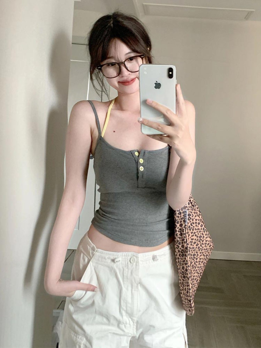 아메리칸 스타일 레트로 스파이스 소녀 그레이 로우 칼라 카미 솔 조끼 여성 여름 슬림 핏 퓨어 뷰티 스트랩 탑