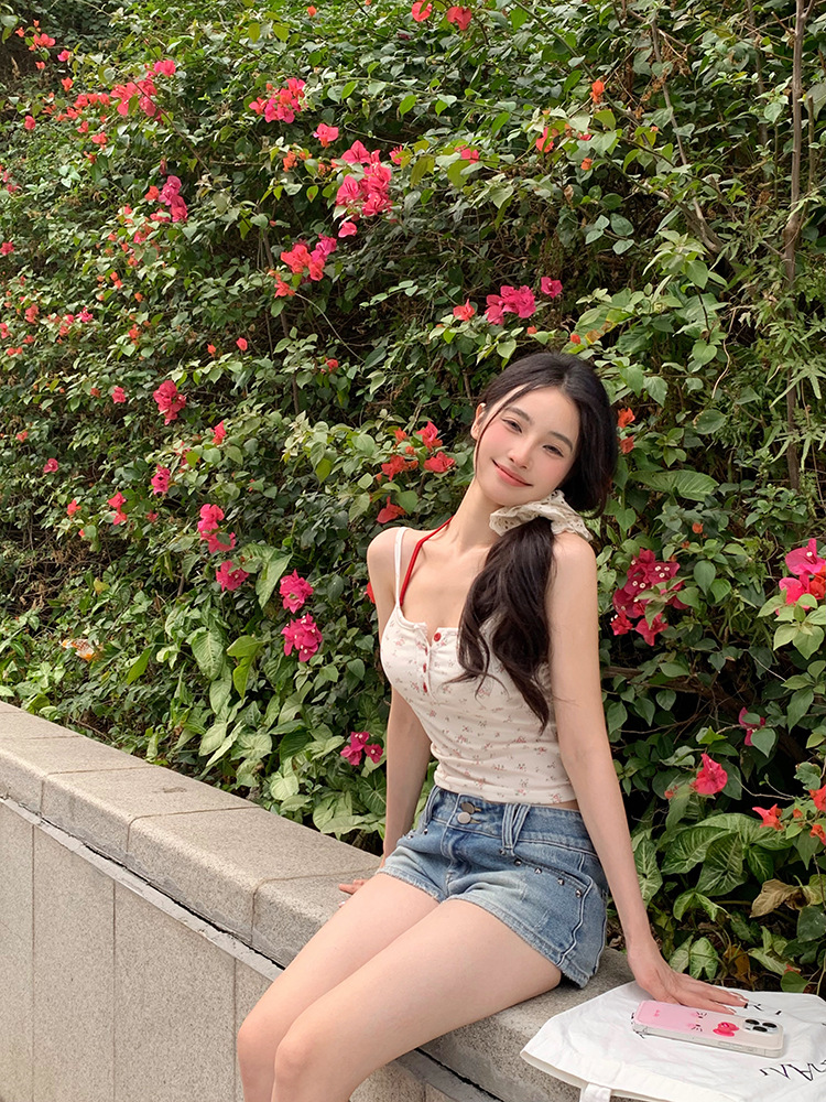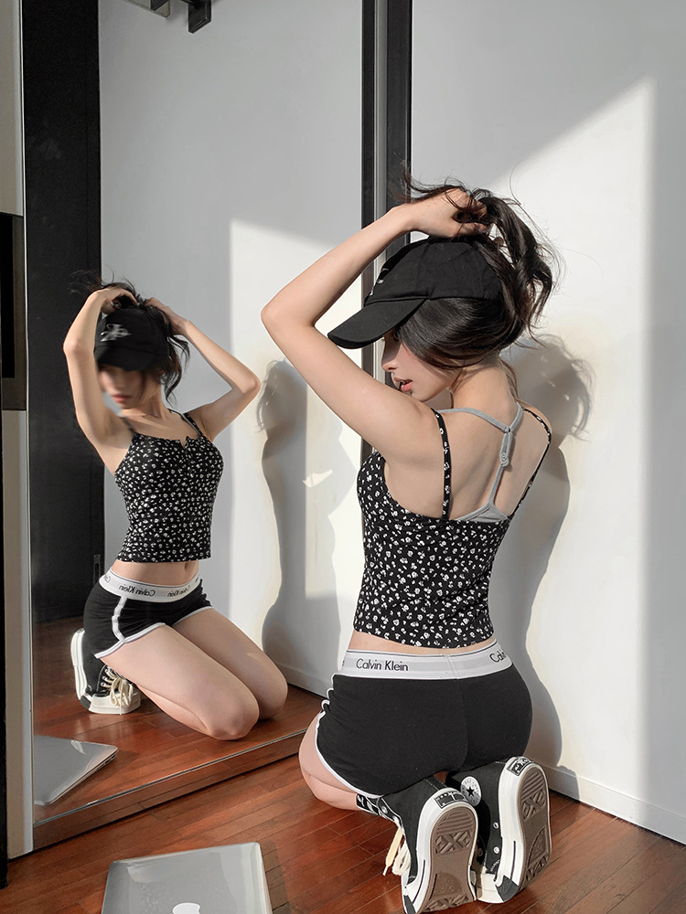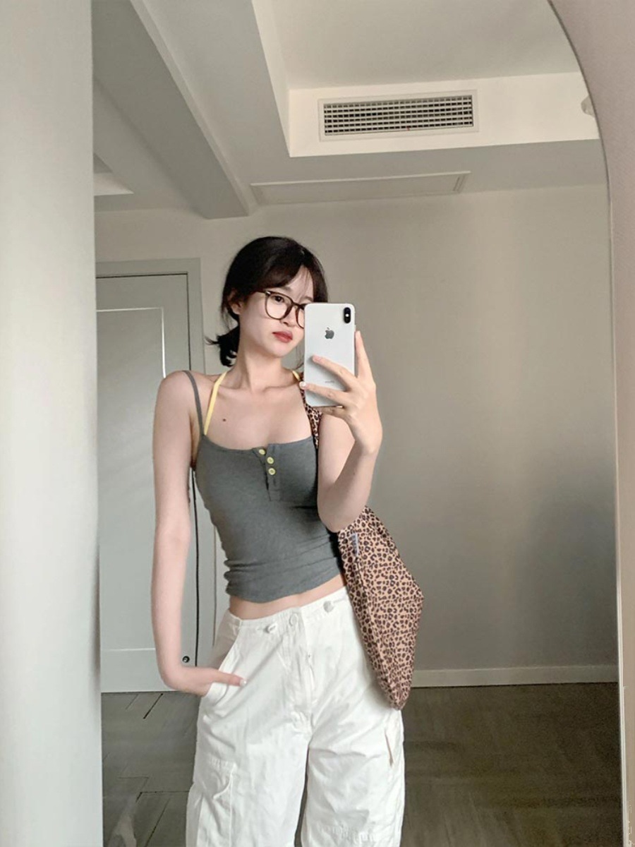 아메리칸 스타일 레트로 스파이스 소녀 그레이 로우 칼라 카미 솔 조끼 여성 여름 슬림 핏 퓨어 뷰티 스트랩 탑스토어 가기