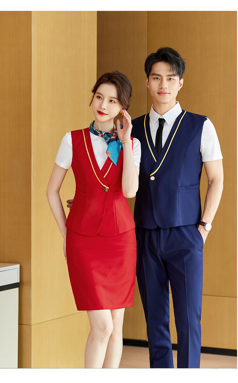로즈 레드 조끼 세트 남성과 여성의 재산 고객 서비스 가이드 전문 말 클립 작업복 프론트 오피스 환영 리셉션 오버롤 여름스토어 가기