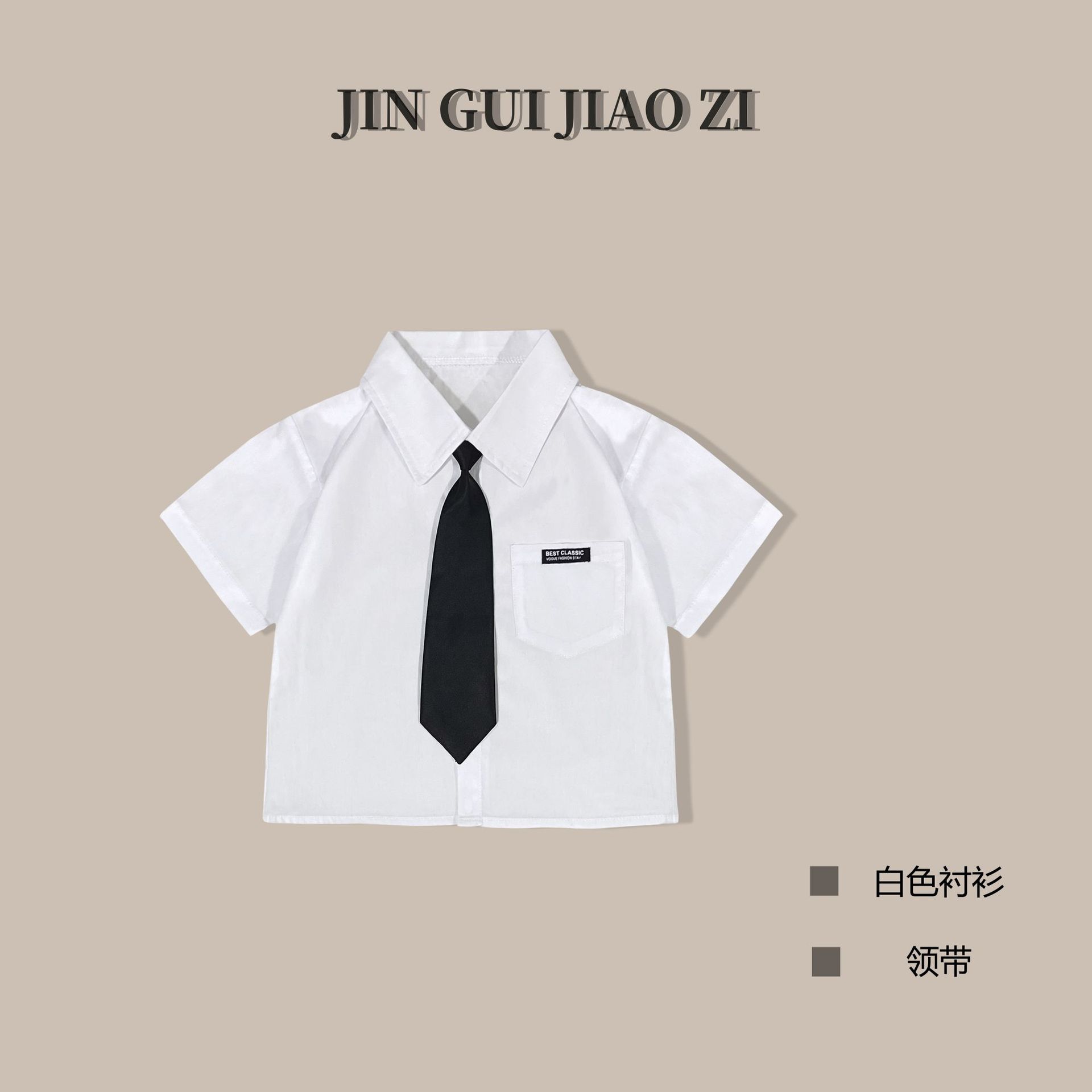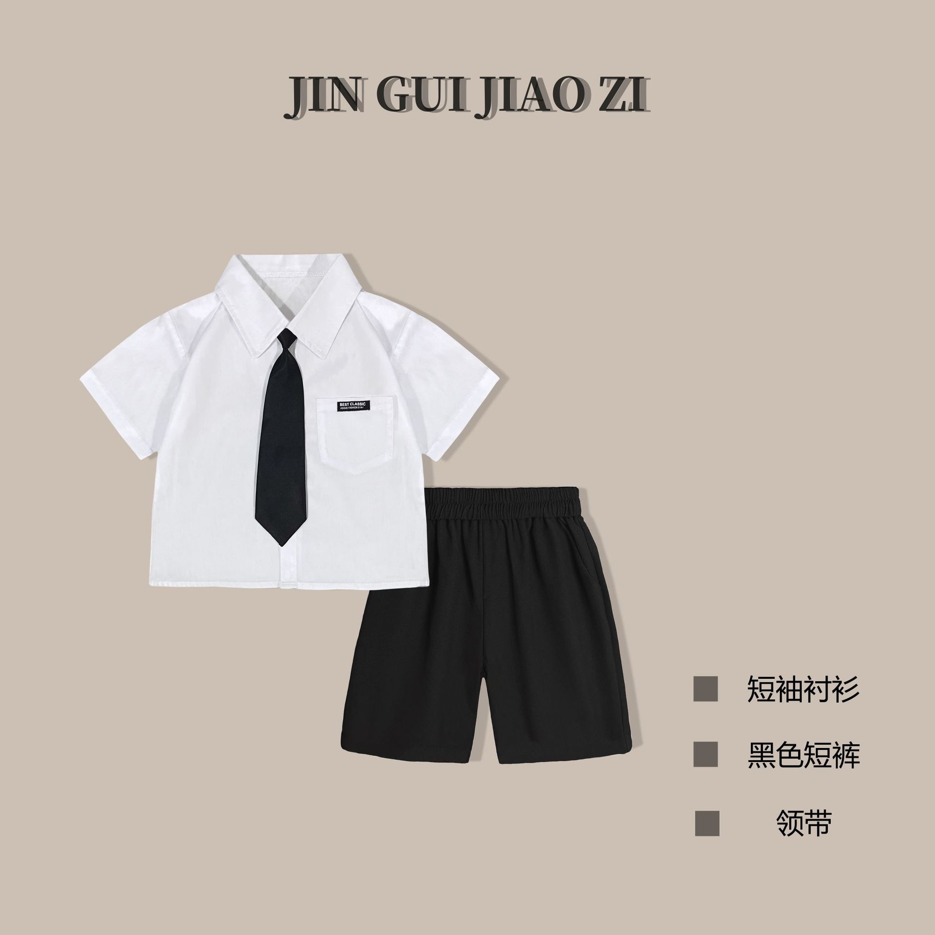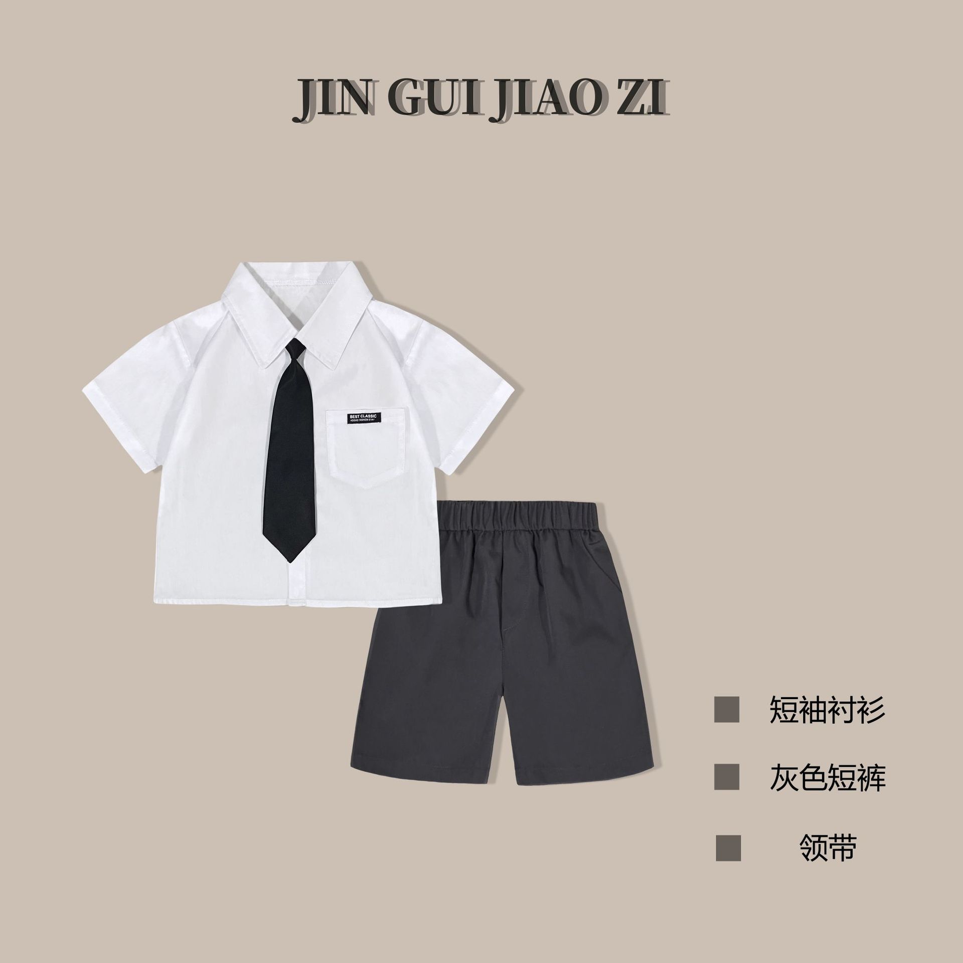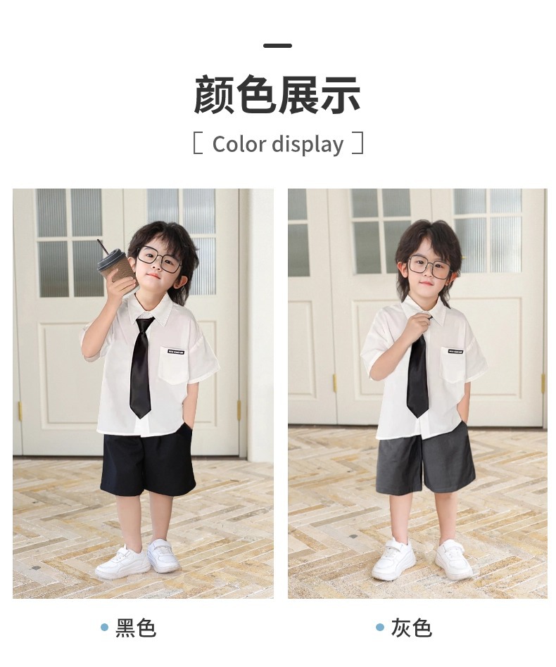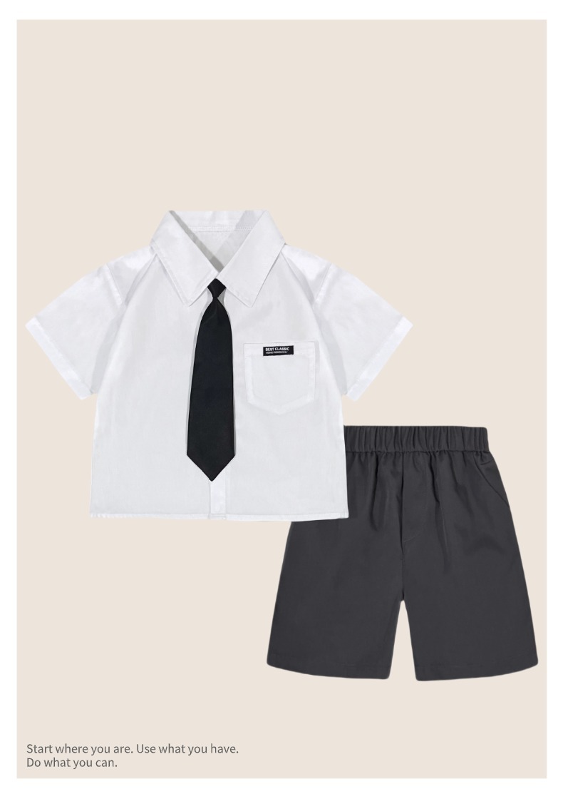 • 회색 반바지 흰색면 셔츠 검은 넥타이