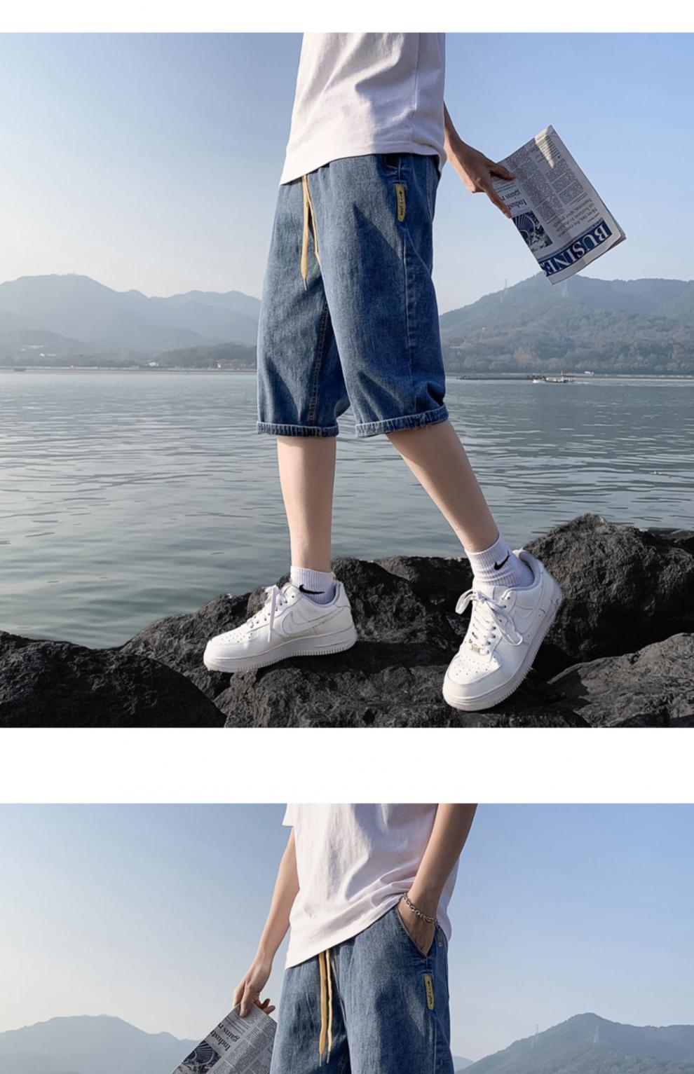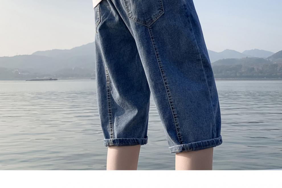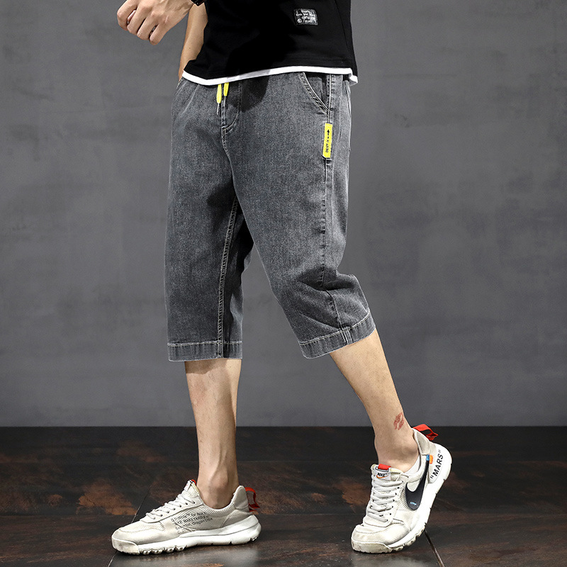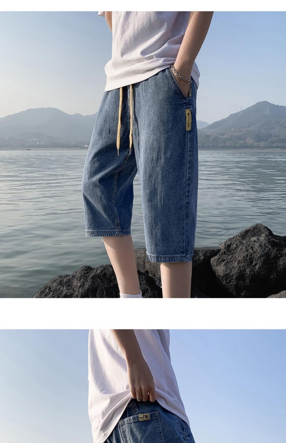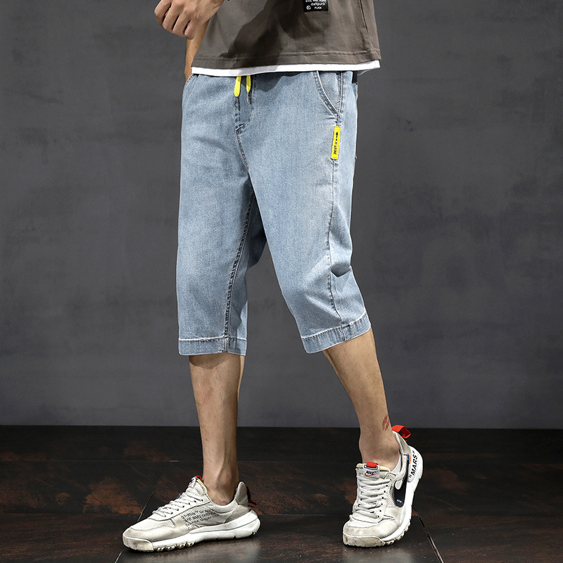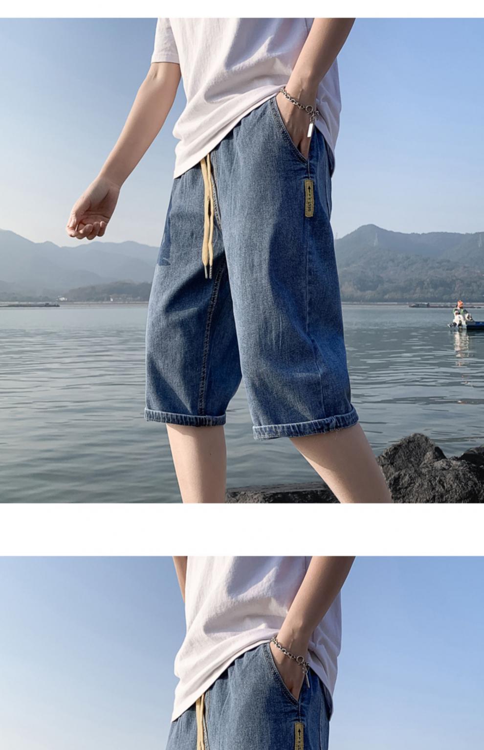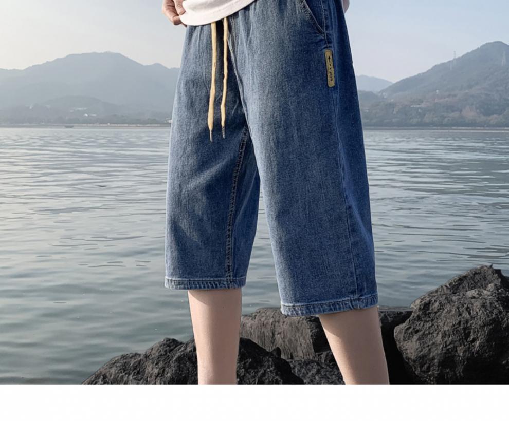 여름 얇은 데님 반바지 남자 카프리 바지 한국 스타일 패셔너블 루즈 스트레이트 드로우 스트링 중 허리 바지스토어 가기
