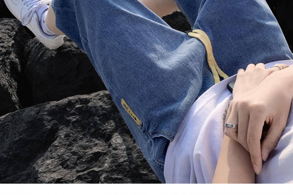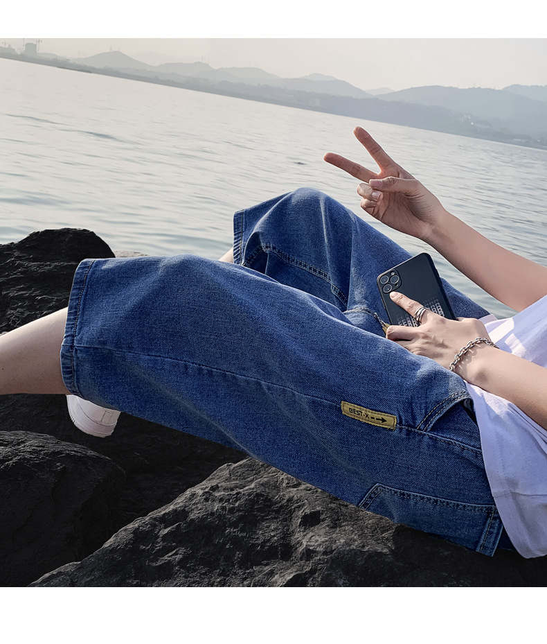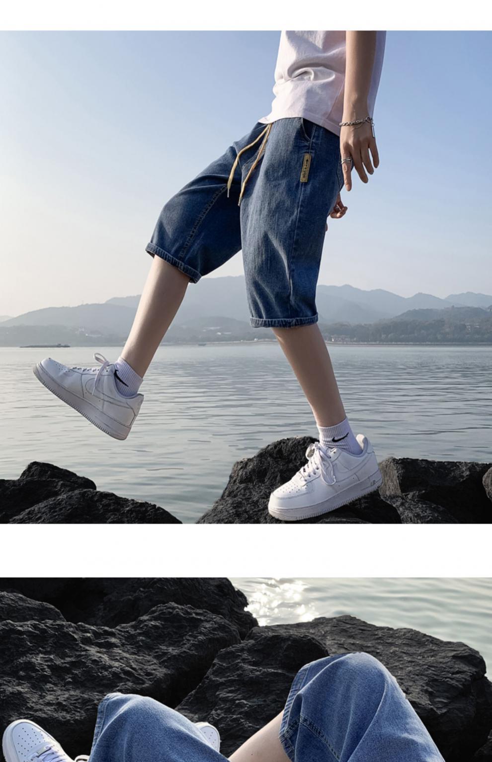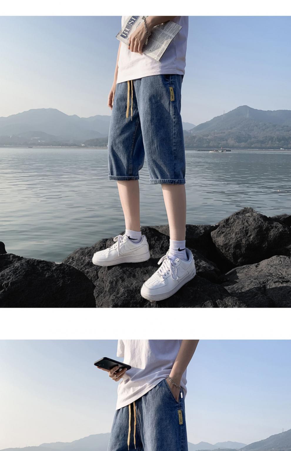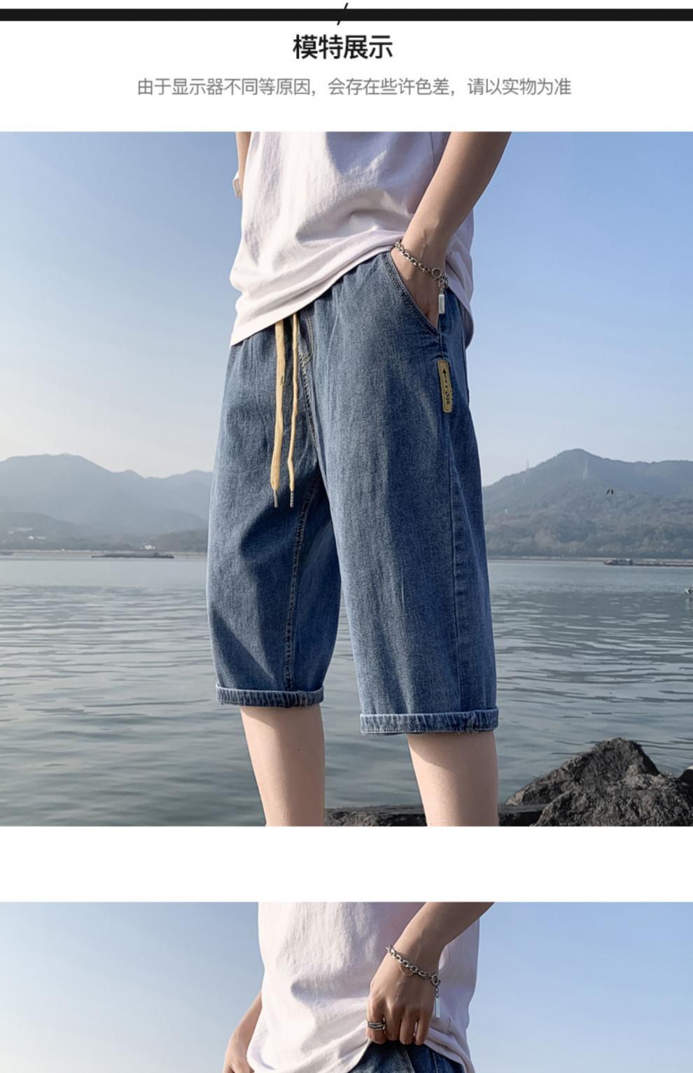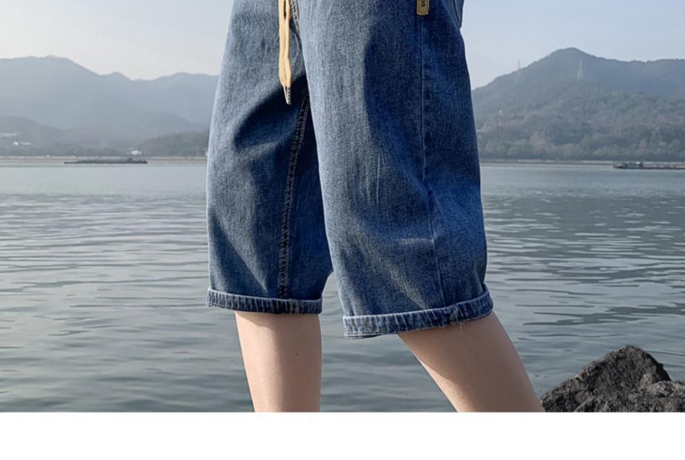 여름 얇은 데님 반바지 남자 카프리 바지 한국 스타일 패셔너블 루즈 스트레이트 드로우 스트링 중 허리 바지스토어 가기
