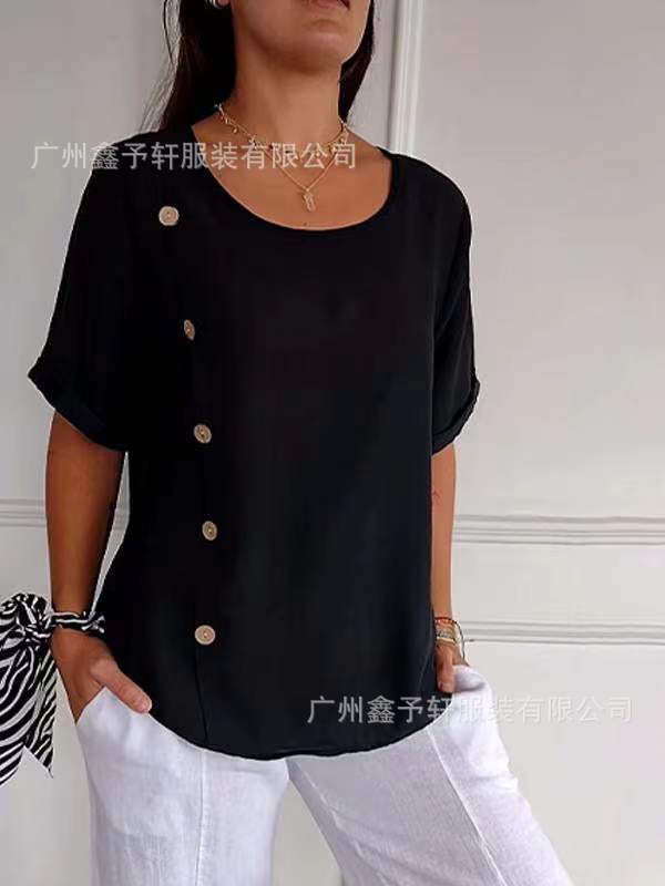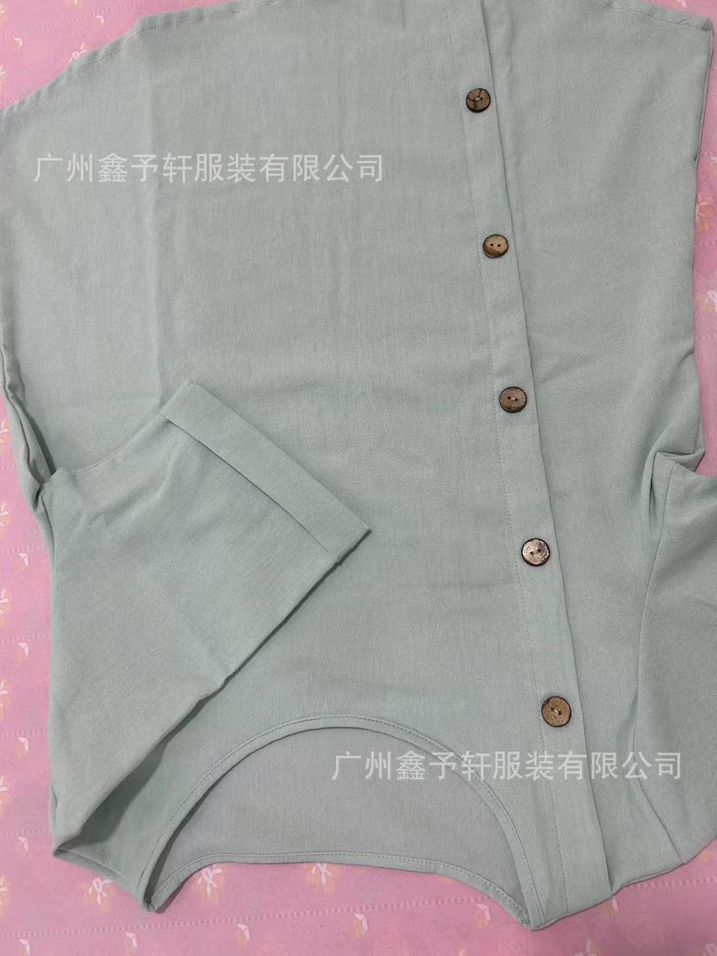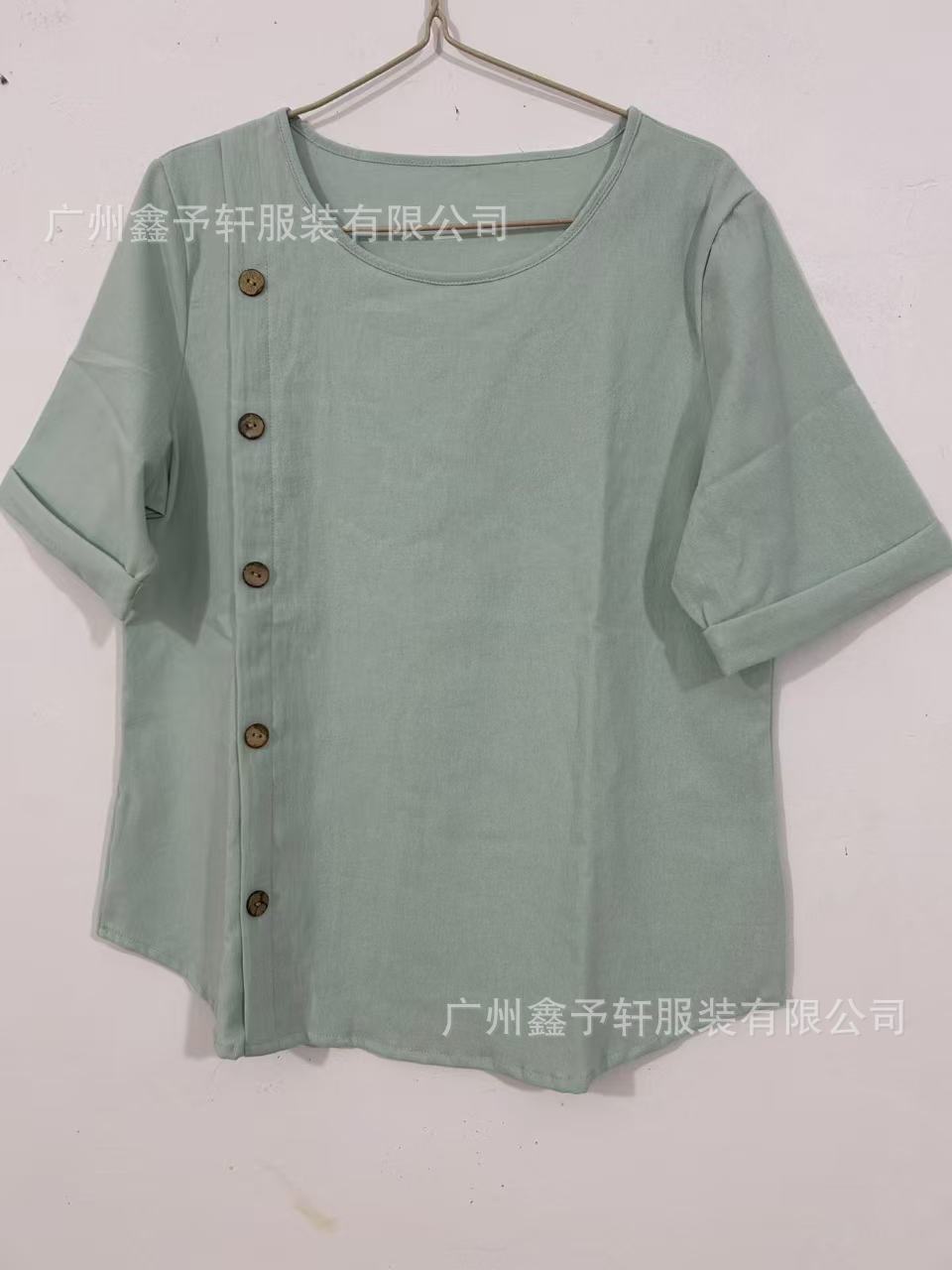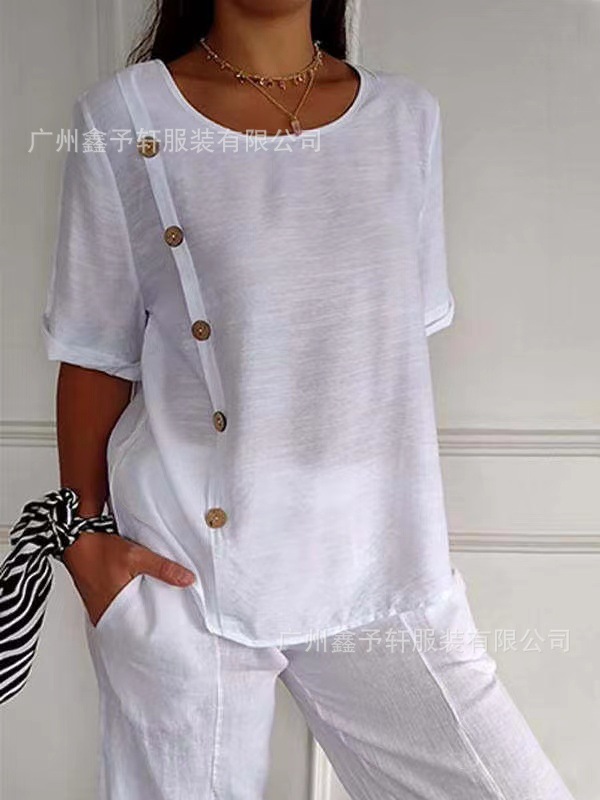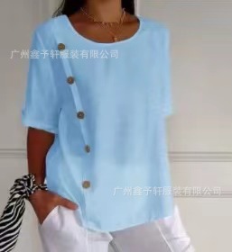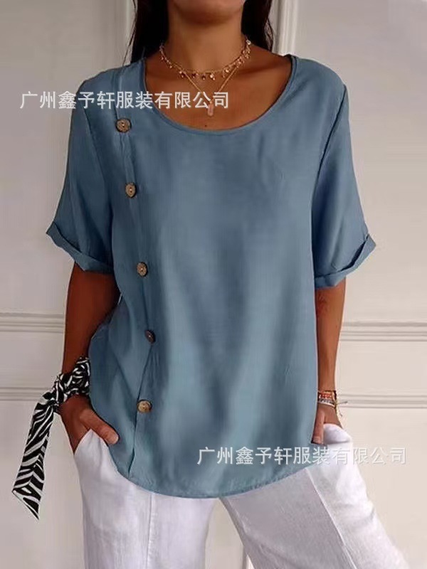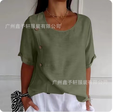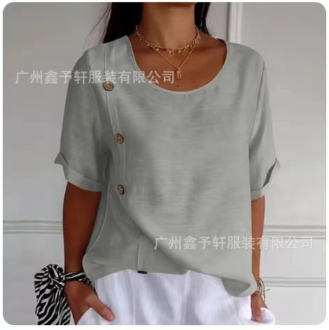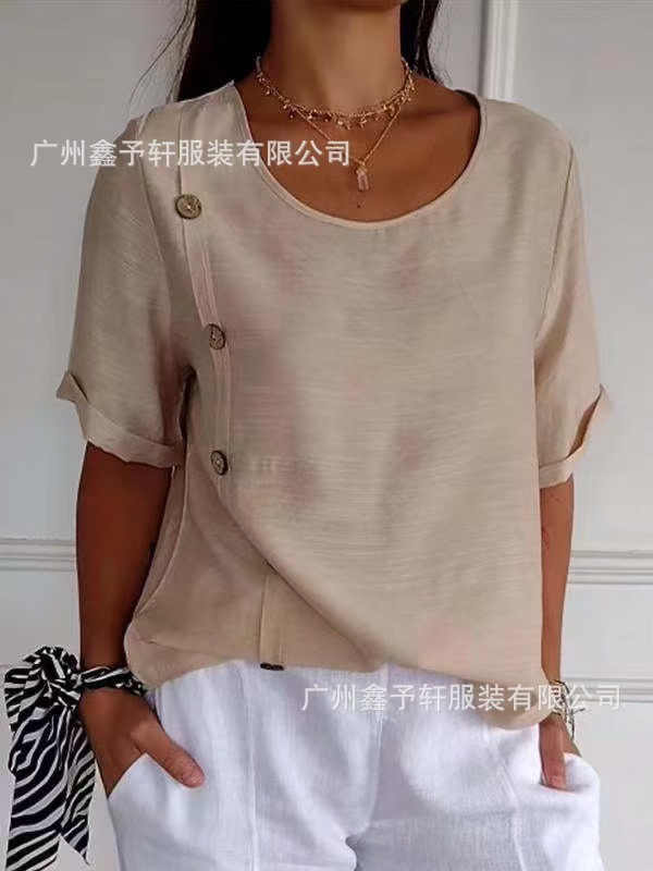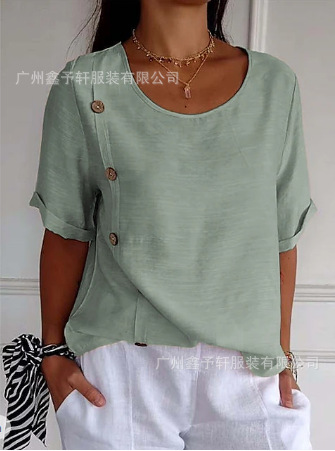 유럽 및 미국 해외 직구 2024 여름 여성용 면마 반팔 셔츠, 패셔너블하고 다재다능한 라운드넥 버튼 탑