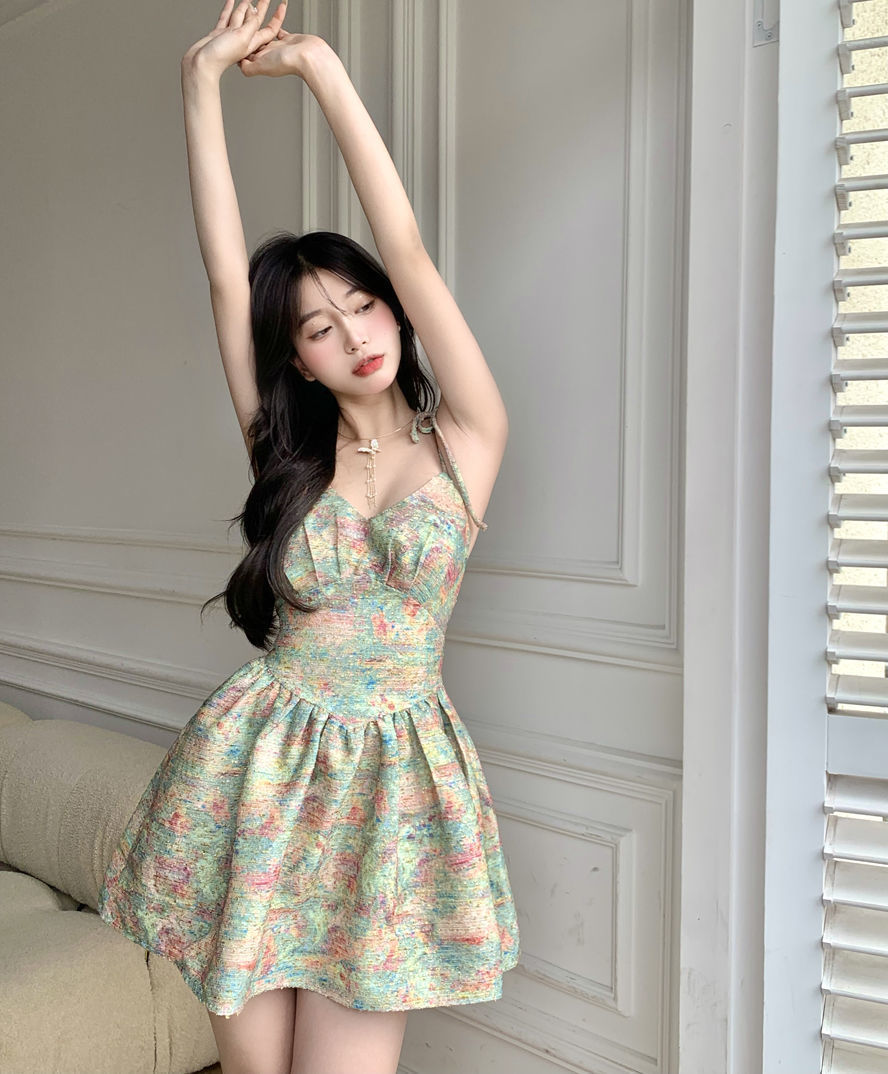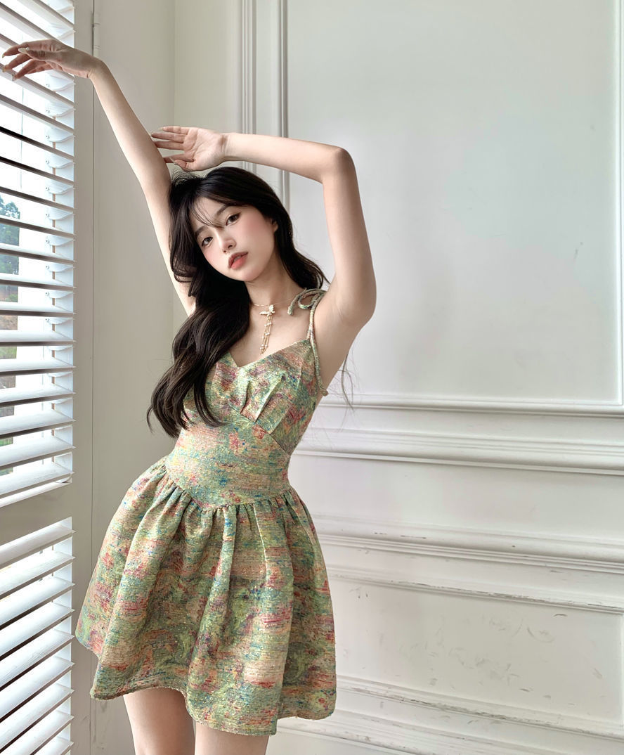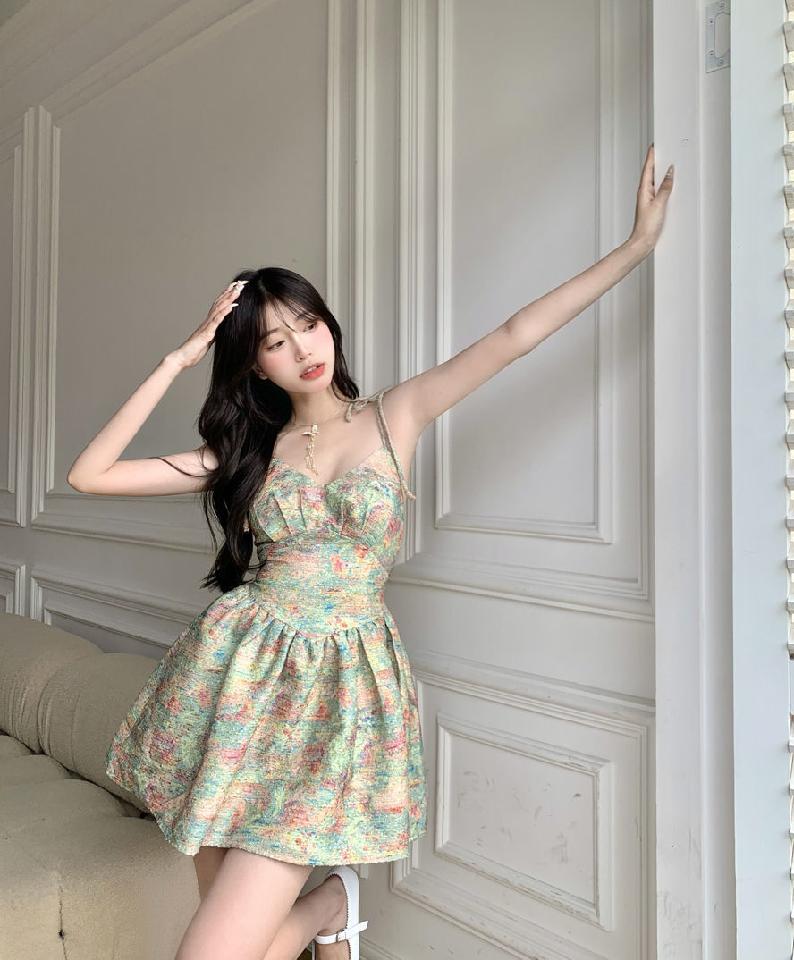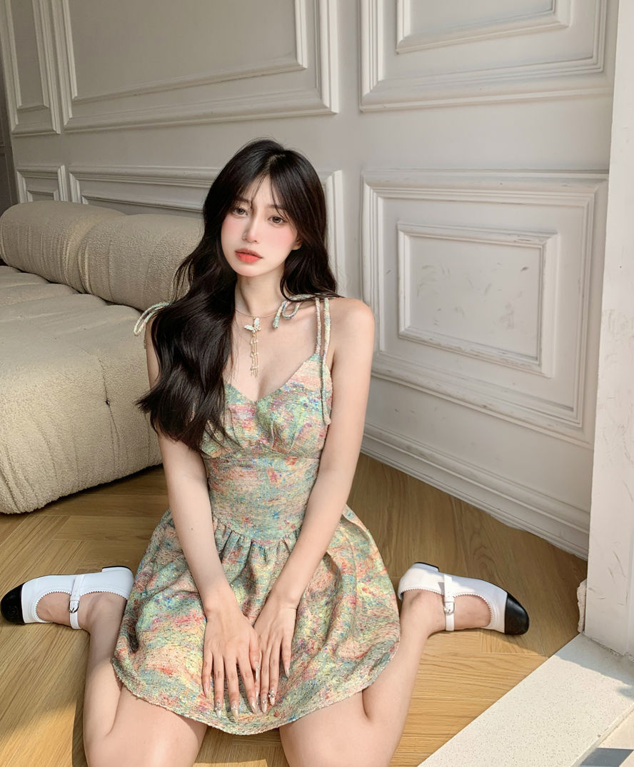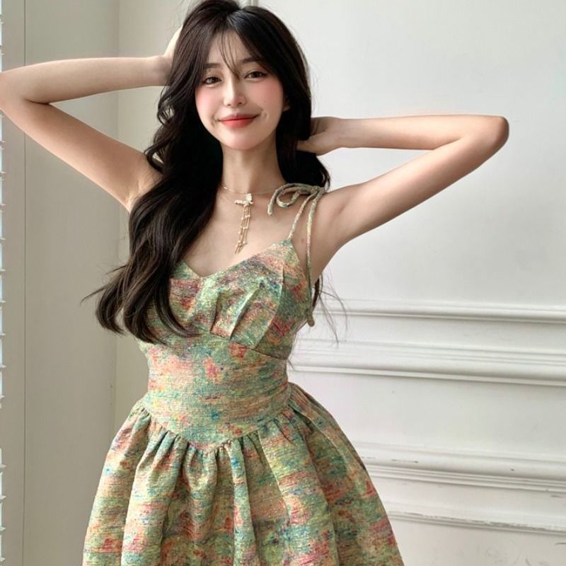 짧은 새 스타일 짧은 치마 타이트 허리 휴가 스타일 짧은 스커트 레트로 젠틀 스타일 달콤한 꽃 슬링 원피스 여성스토어 가기