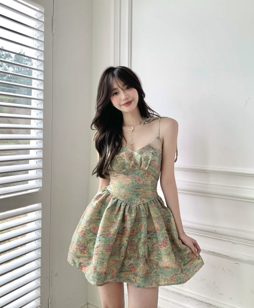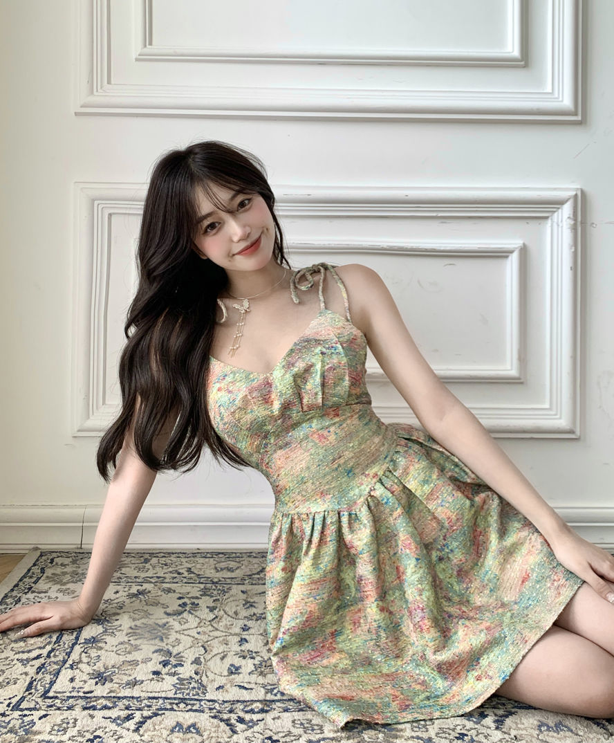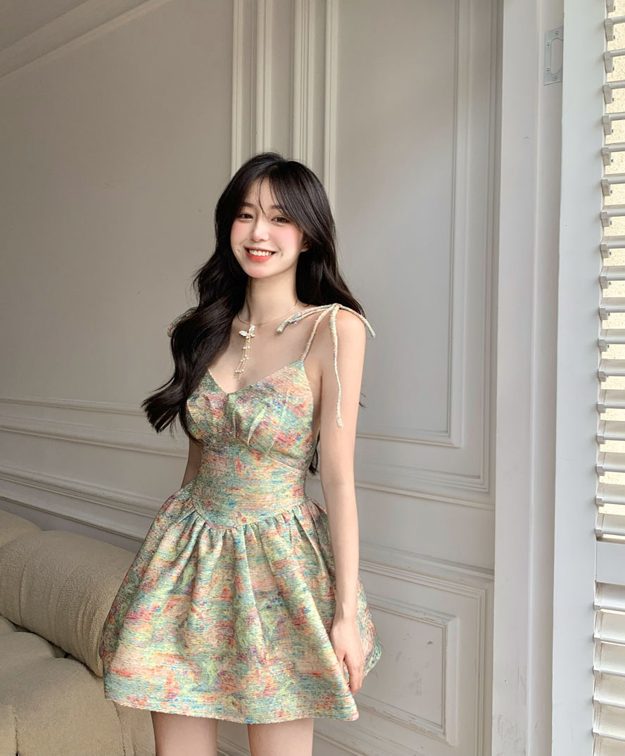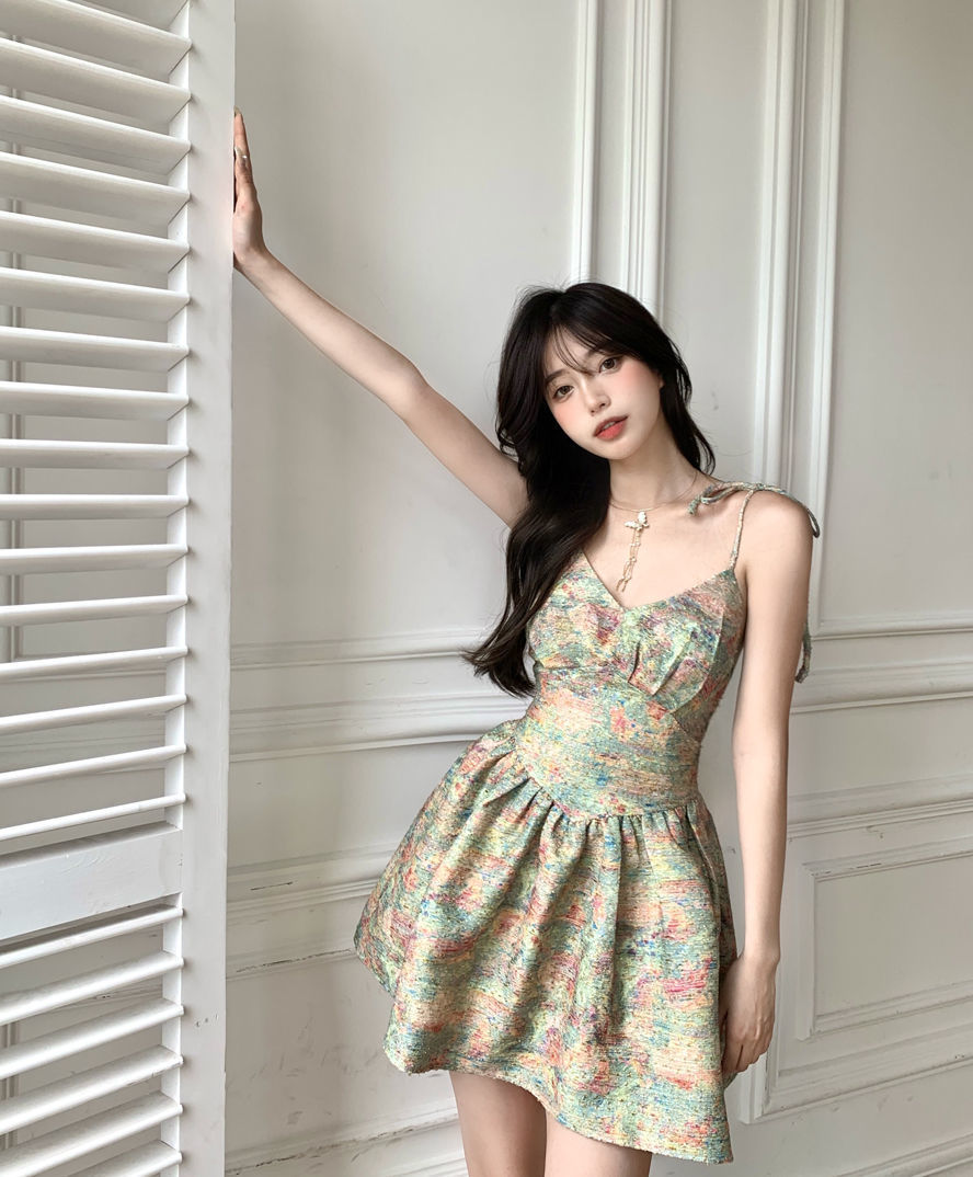 짧은 새 스타일 짧은 치마 타이트 허리 휴가 스타일 짧은 스커트 레트로 젠틀 스타일 달콤한 꽃 슬링 원피스 여성스토어 가기