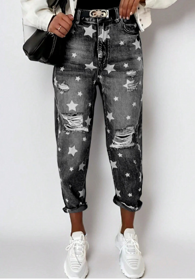 크로스보더 신상 유럽 및 미국 스타일 하이웨이스트 편안한 여성용 데님 팬츠, 데미지 스트레이트 핏 롱 팬츠, 여성용 공장 직판 트렌디 상품스토어 가기