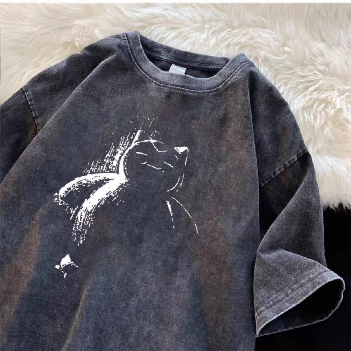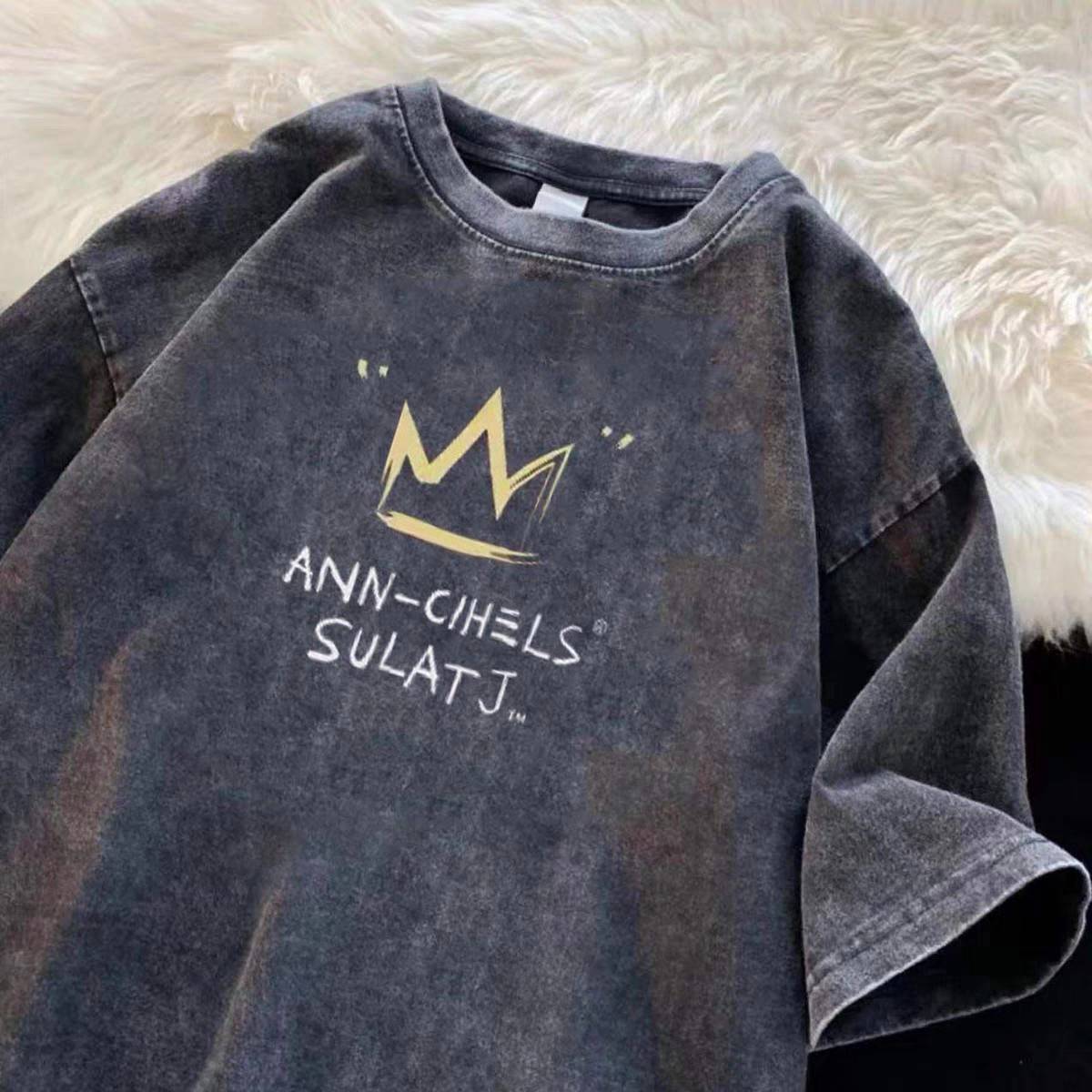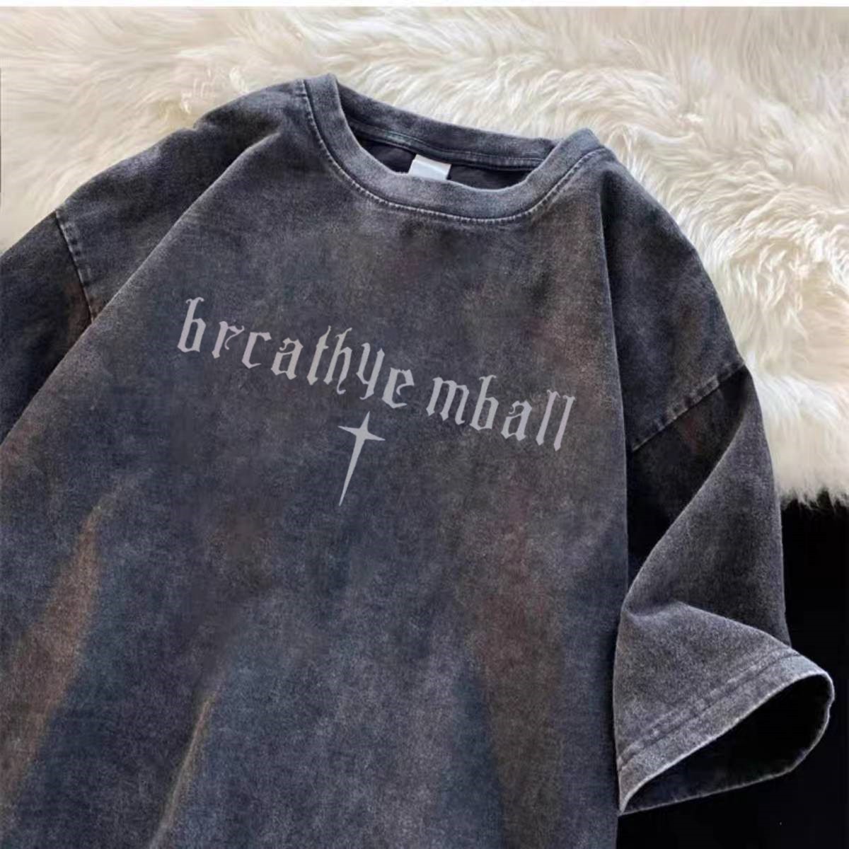 유럽과 미국 스타일의 힙합 패션 브랜드 고민 반팔 티셔츠 여성용 플러스 사이즈 느슨한 오버 사이즈 세탁 블랙 프린트 탑 옷스토어 가기