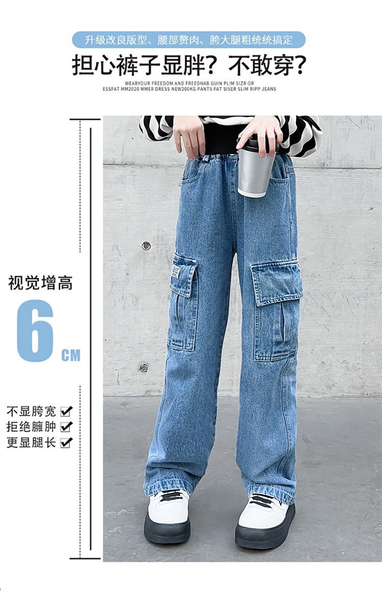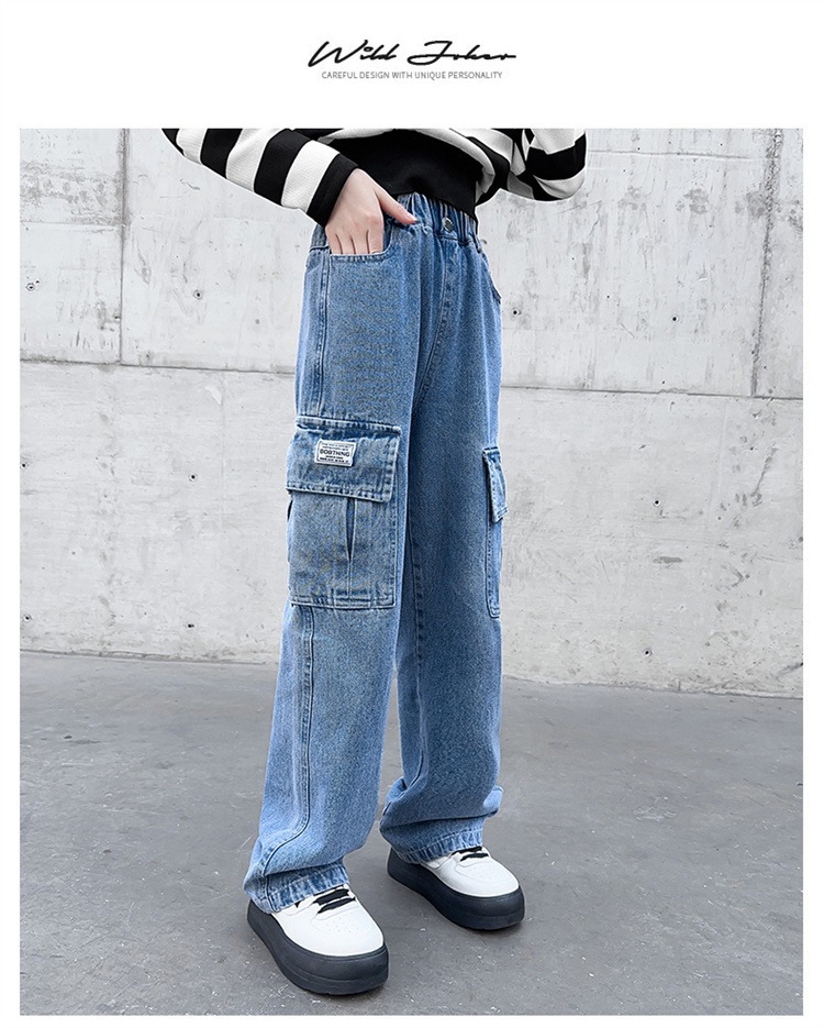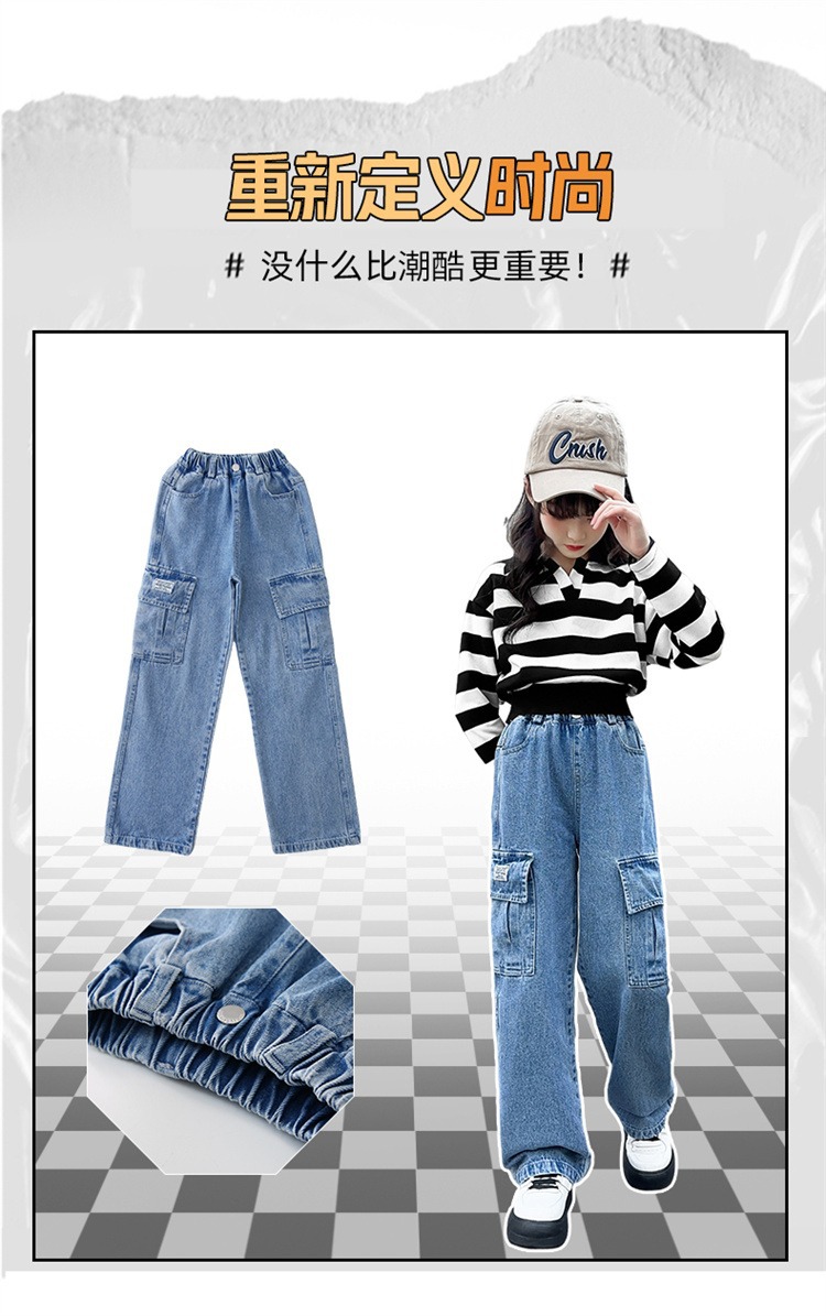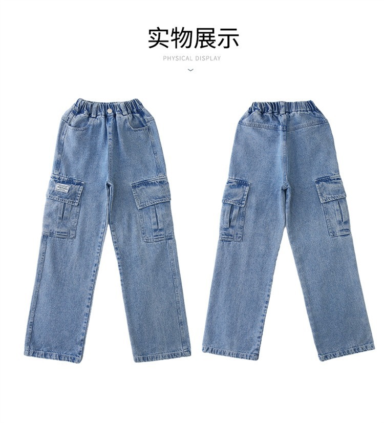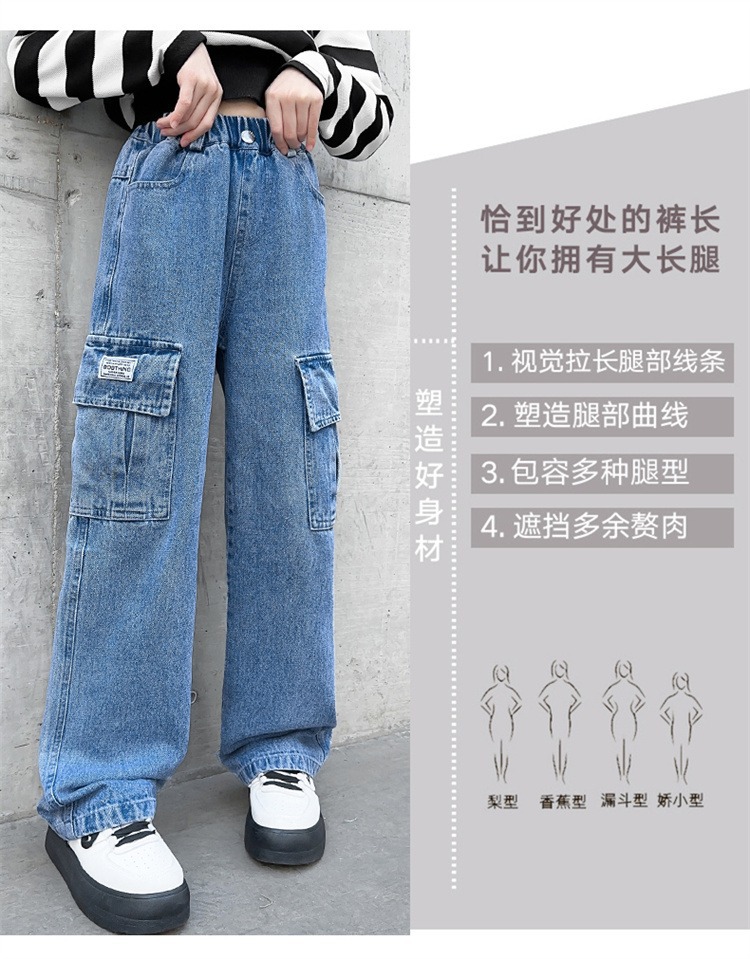 어린 소녀 데님 작업복 넓은 다리 바지 소스 공장 도매 중대형 어린이 느슨한 바지 소녀 스트레이트 다리 바지스토어 가기