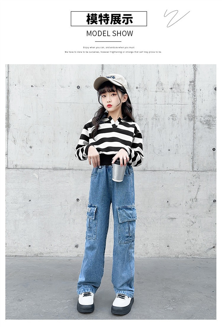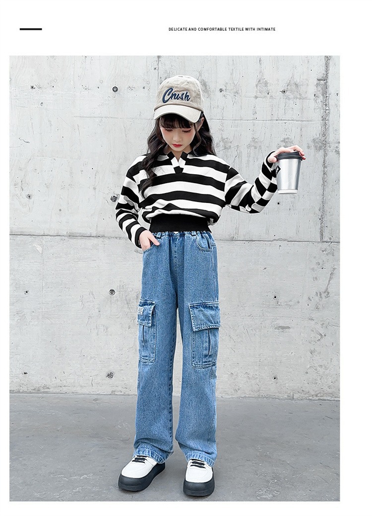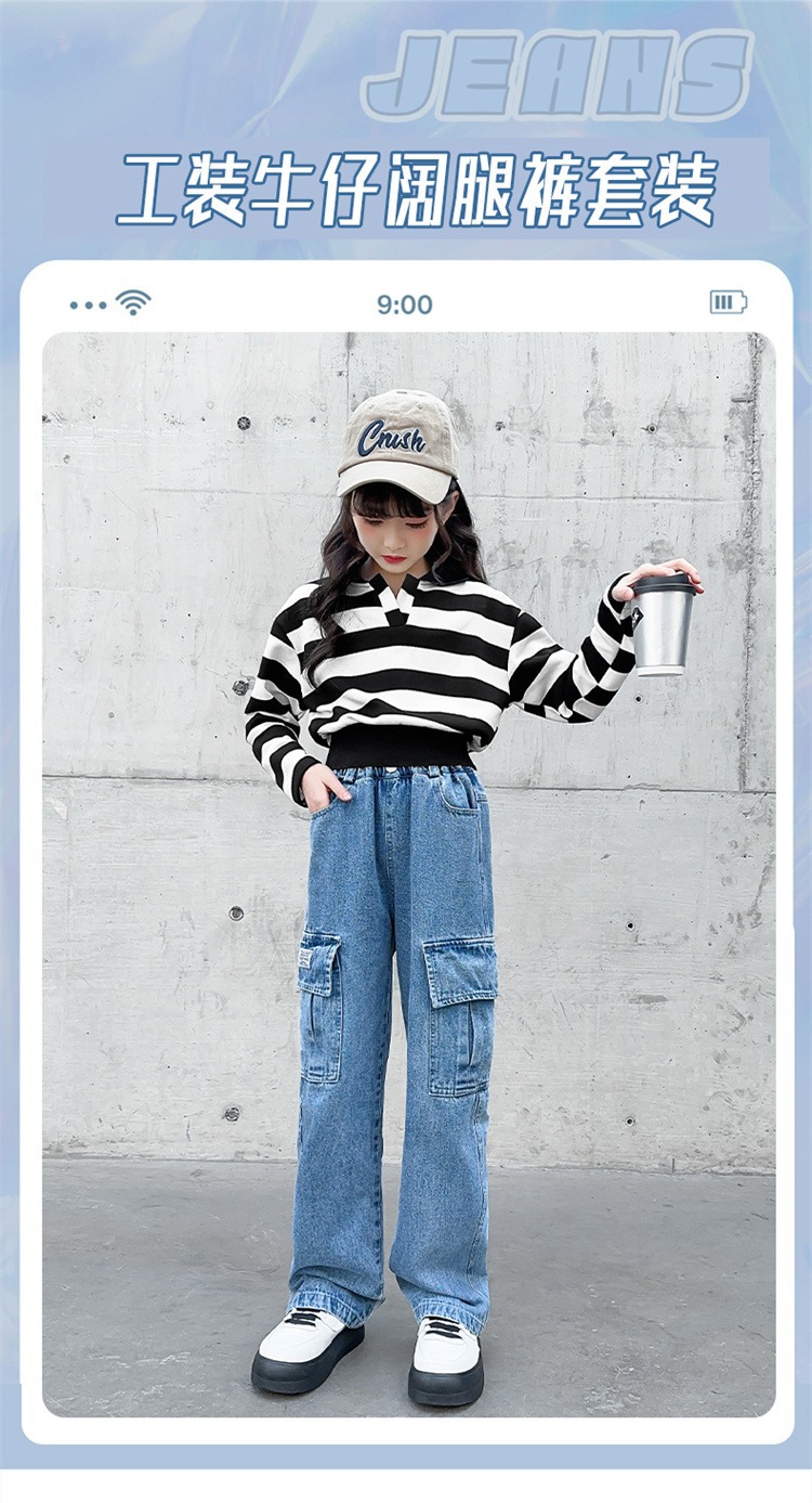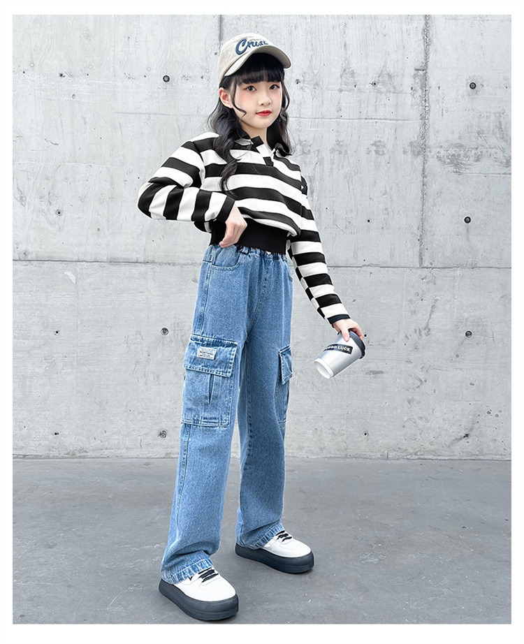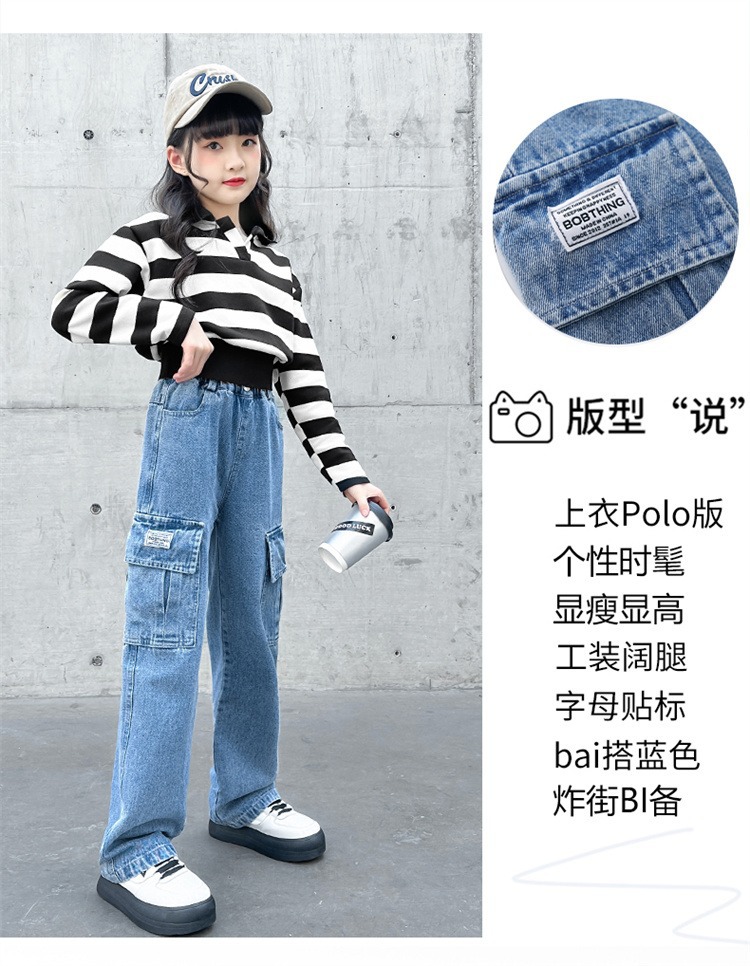 어린 소녀 데님 작업복 넓은 다리 바지 소스 공장 도매 중대형 어린이 느슨한 바지 소녀 스트레이트 다리 바지