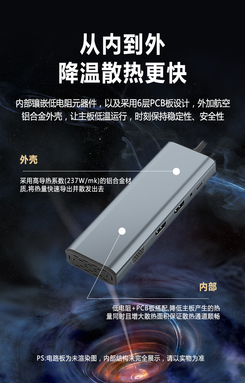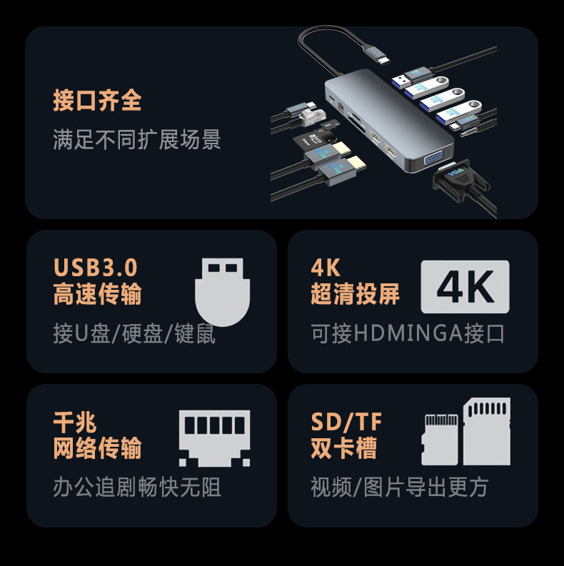 • "Input: Type-c Output: HDMI(4K@30HZ)*2+VGA*1+RJ45(