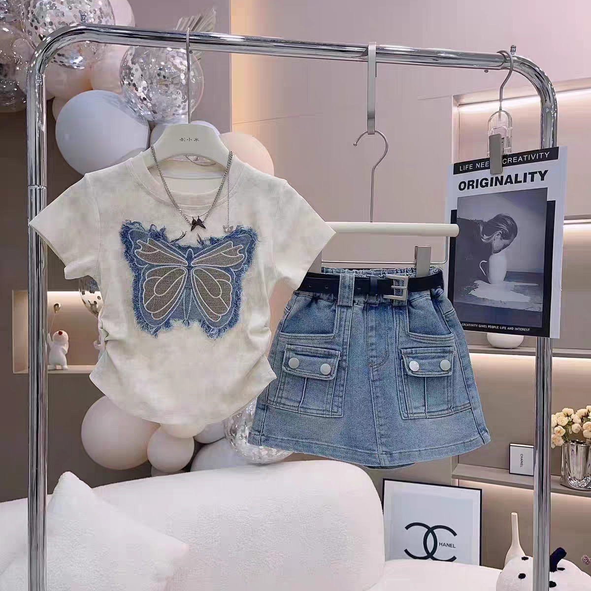 여아 2026년 여름 신상 아동복 개성있는 나비 리본 자수 상의와 데님 스커트 세트