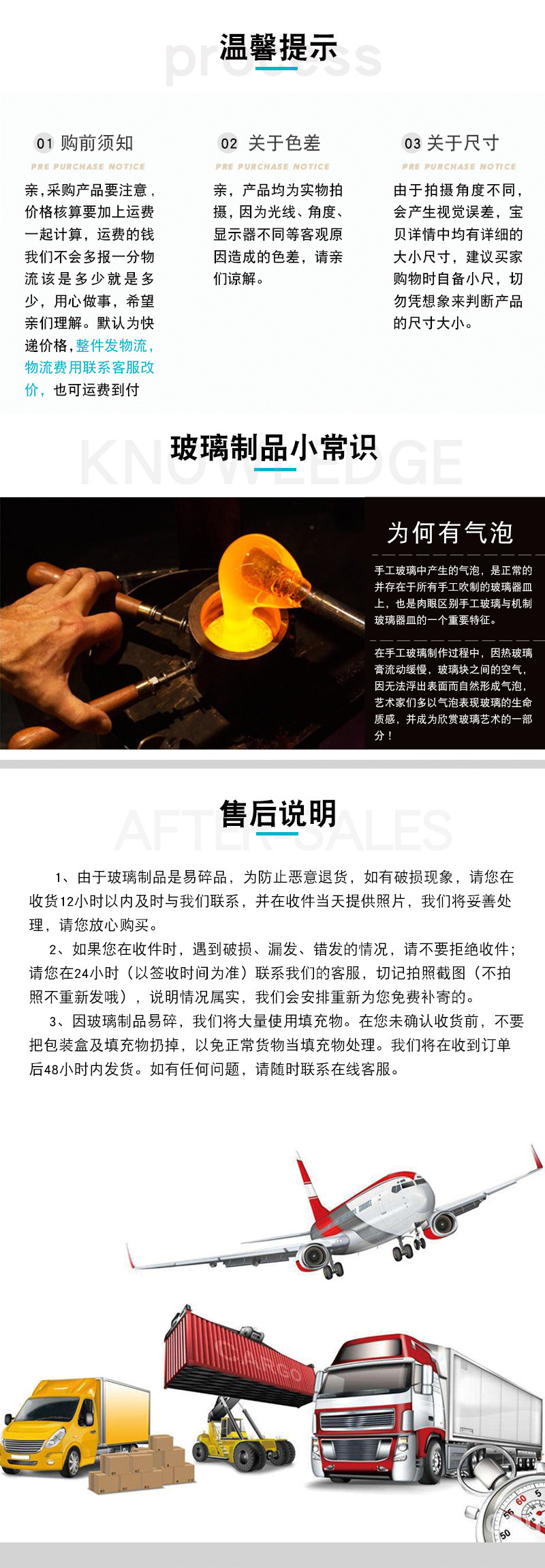 玻璃制品属高温烧制,难免会有小气泡、小黑点、小划痕等情况,属于工艺范畴,不影响正常使用,质量都符合出厂执行标准,介意的亲请慎拍,手工测量,误差不超过2mm,请以实物为准