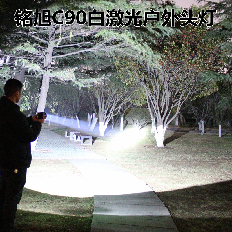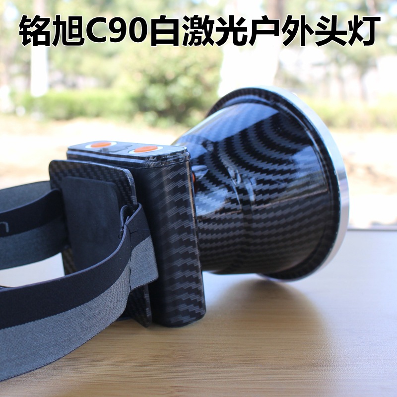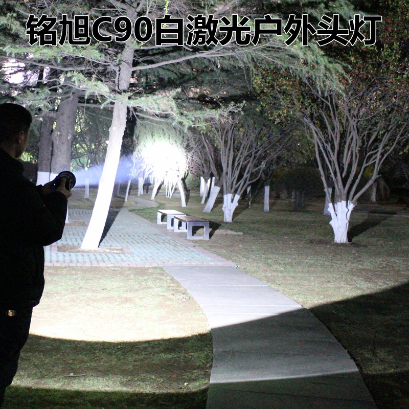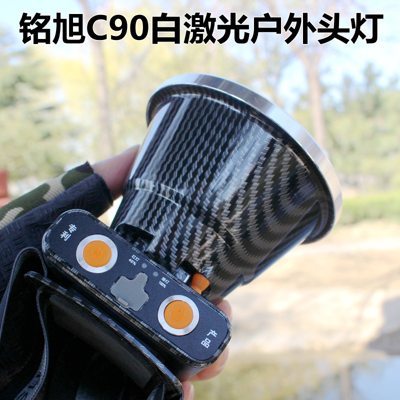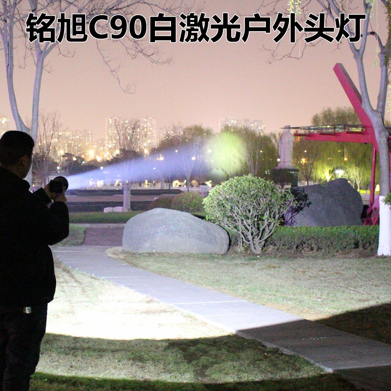 铭旭C90大功率户外激光头灯,进口SFT50白激光灯珠,有效射程1000米,光源为正白光,灯头直径10.3CM,内置三节18650高容量锂电池,带电量指示,强光连续照明8小时,3个档位:强光、弱光、爆闪;高容量超长续航、轻巧耐用,适合户外探险、巡逻、应急、救援等夜间照明!