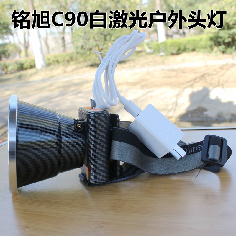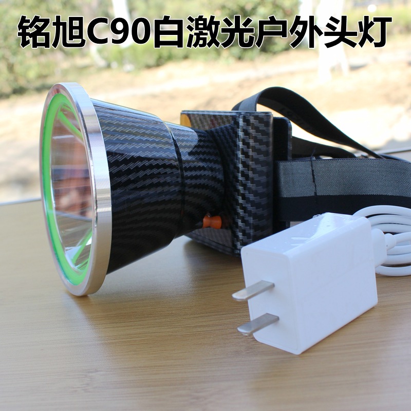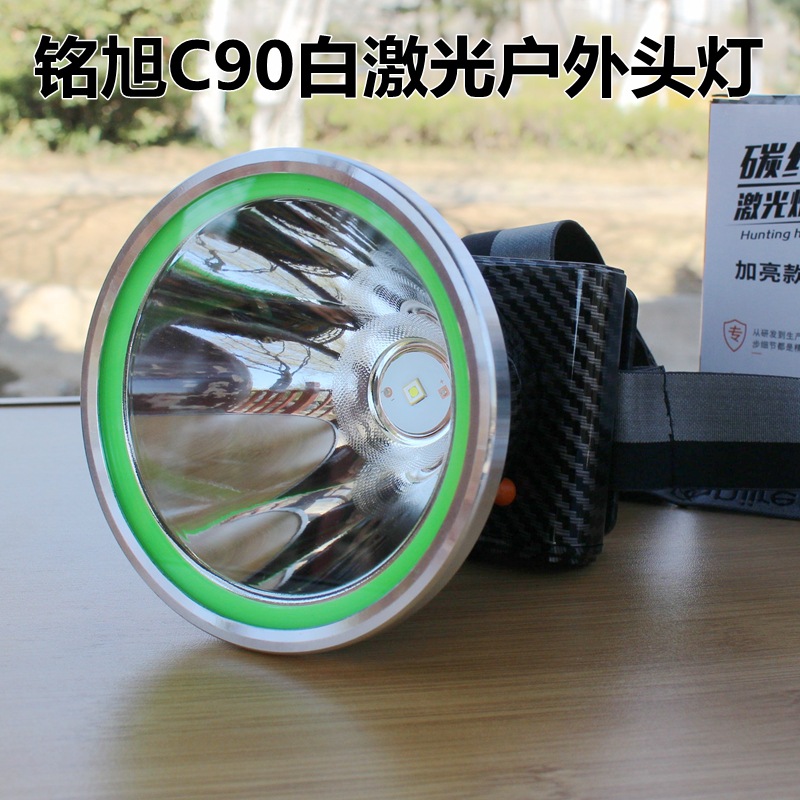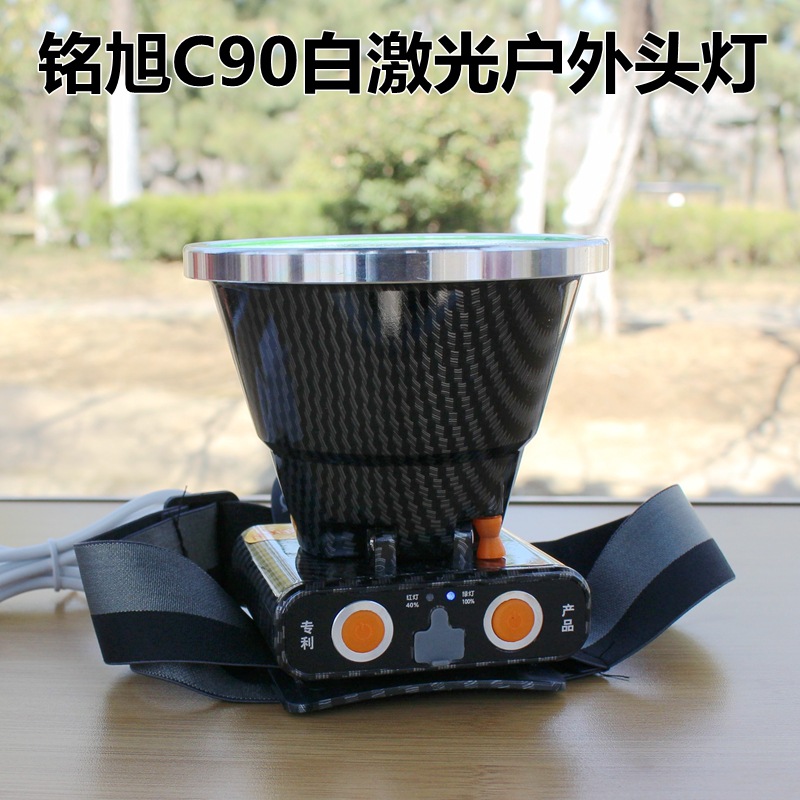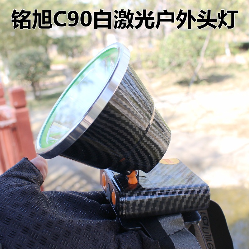 铭旭C90大功率户外激光头灯,进口SFT50白激光灯珠,有效射程1000米,光源为正白光,灯头直径10.3CM,内置三节18650高容量锂电池,带电量指示,强光连续照明8小时,3个档位:强光、弱光、爆闪;高容量超长续航、轻巧耐用,适合户外探险、巡逻、应急、救援等夜间照明!