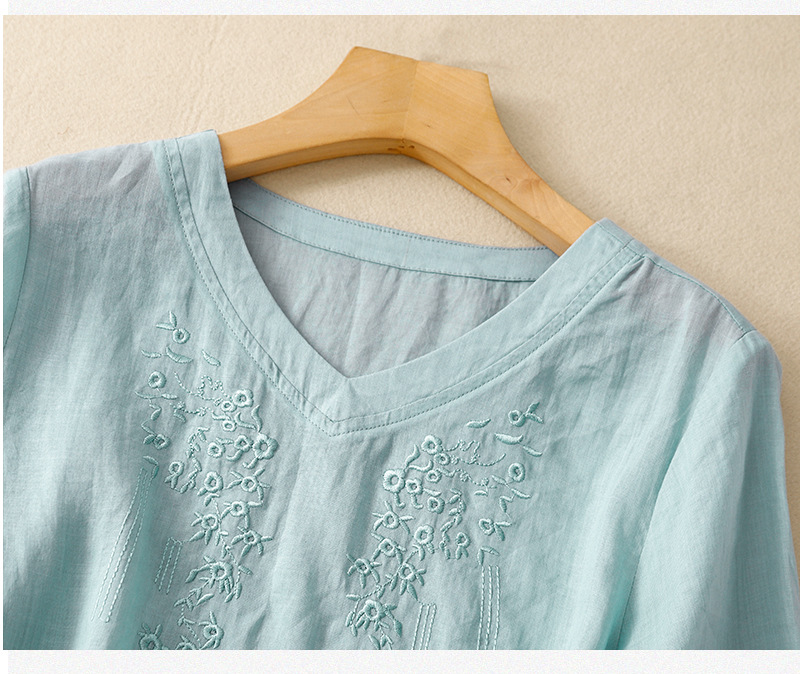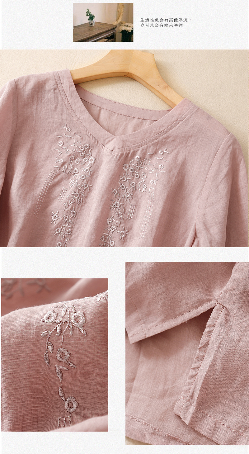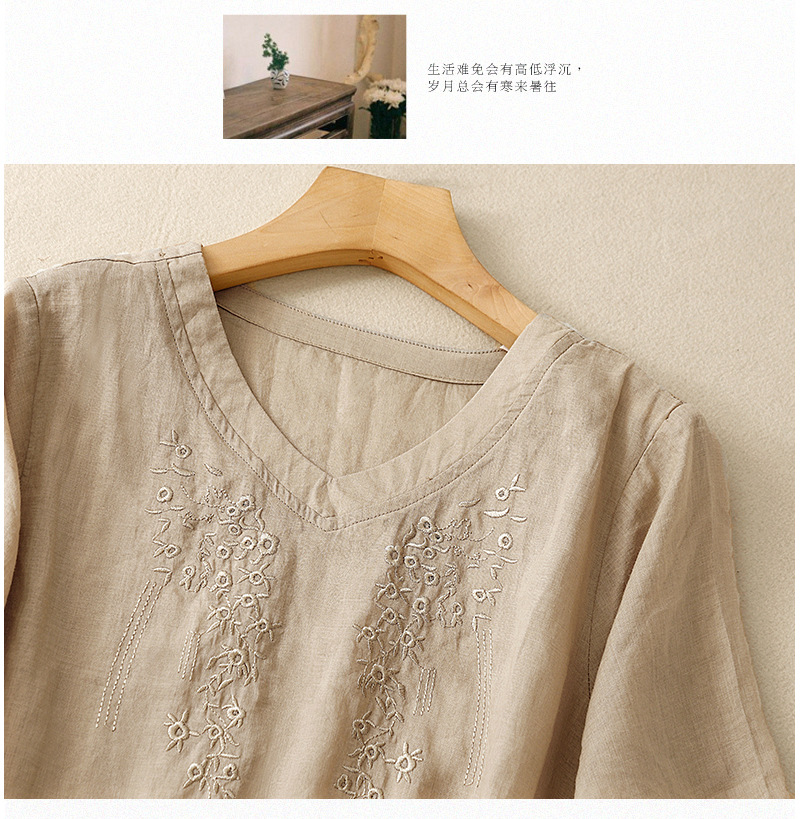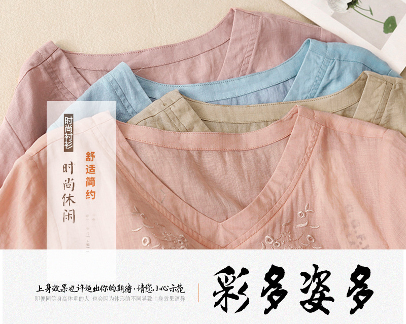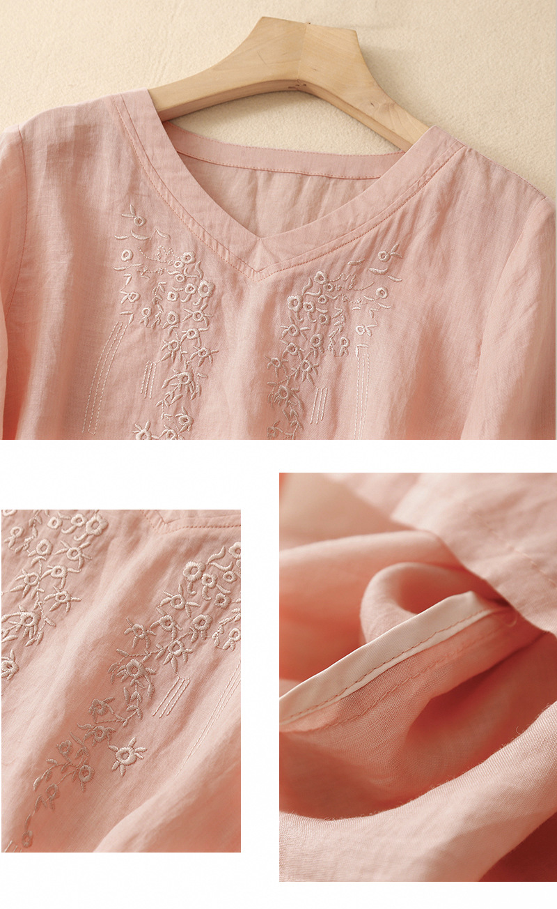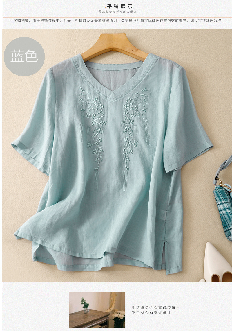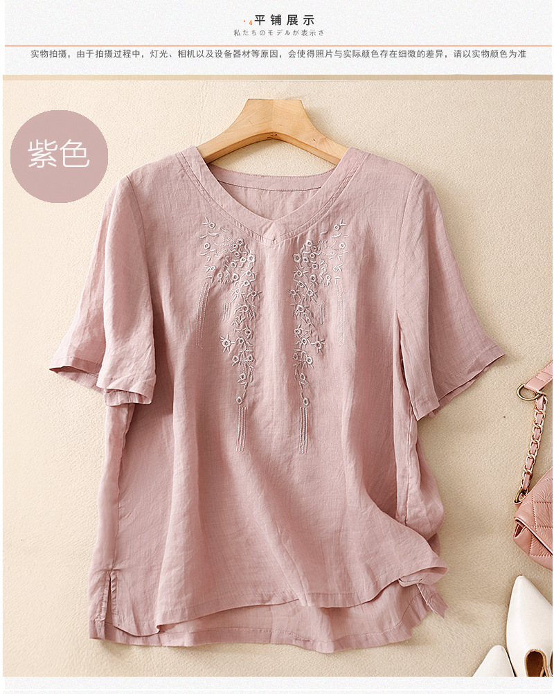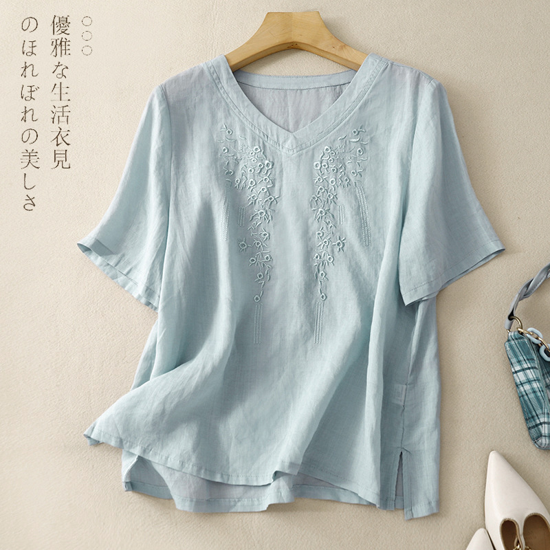 아티스틱 레트로 코튼 린넨 솔리드 컬러 자수 V넥 여성용 루즈핏 2026 여름 신상 만능 반팔 티셔츠 여성용 풀오버스토어 가기