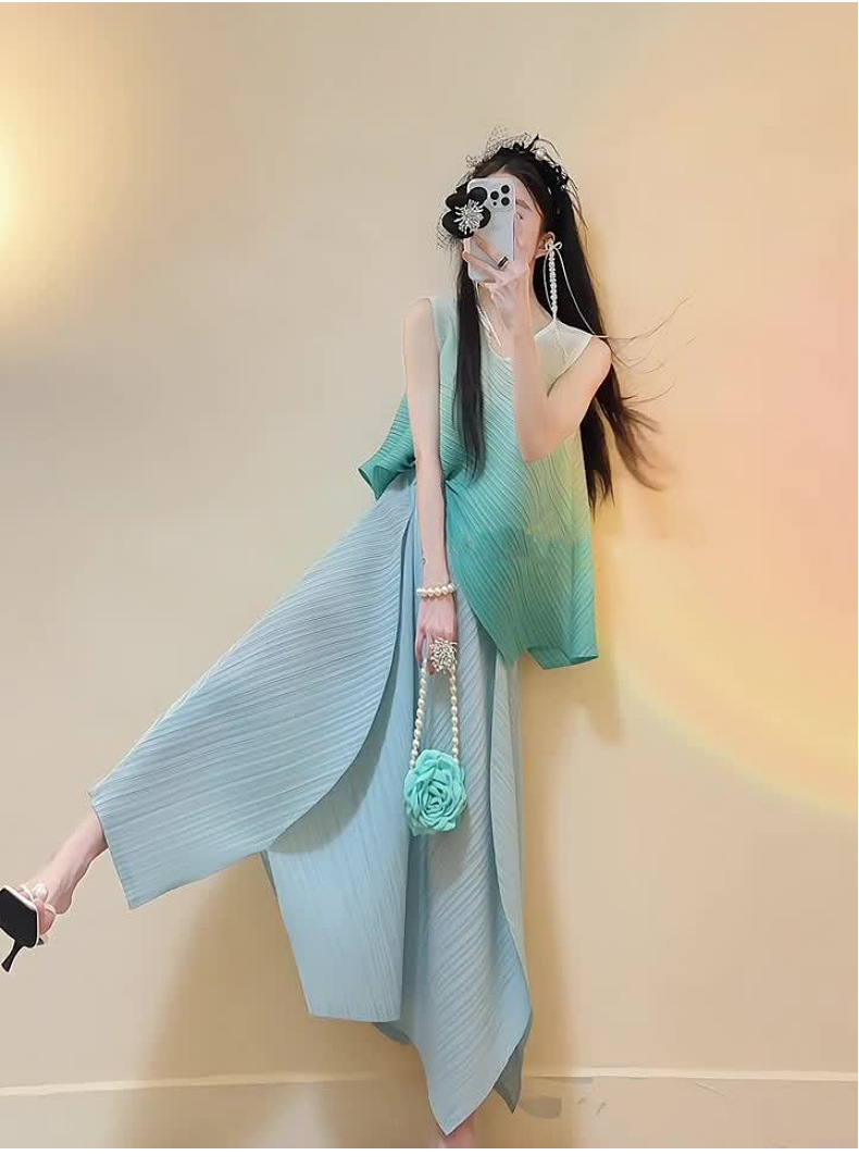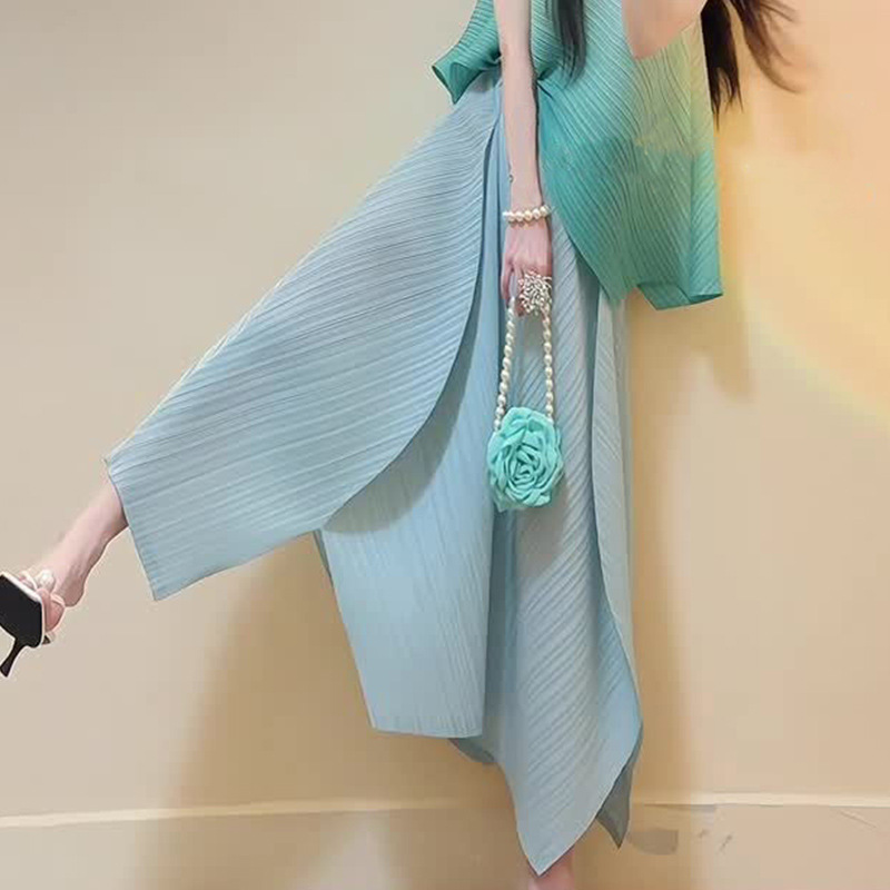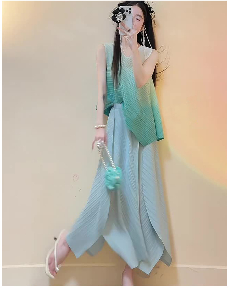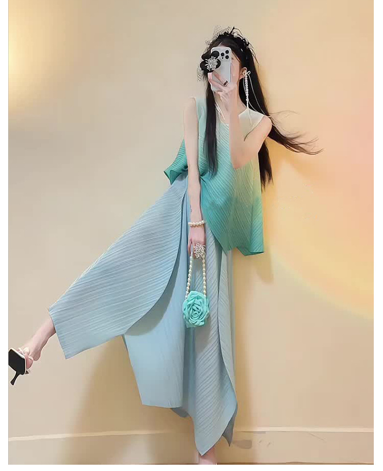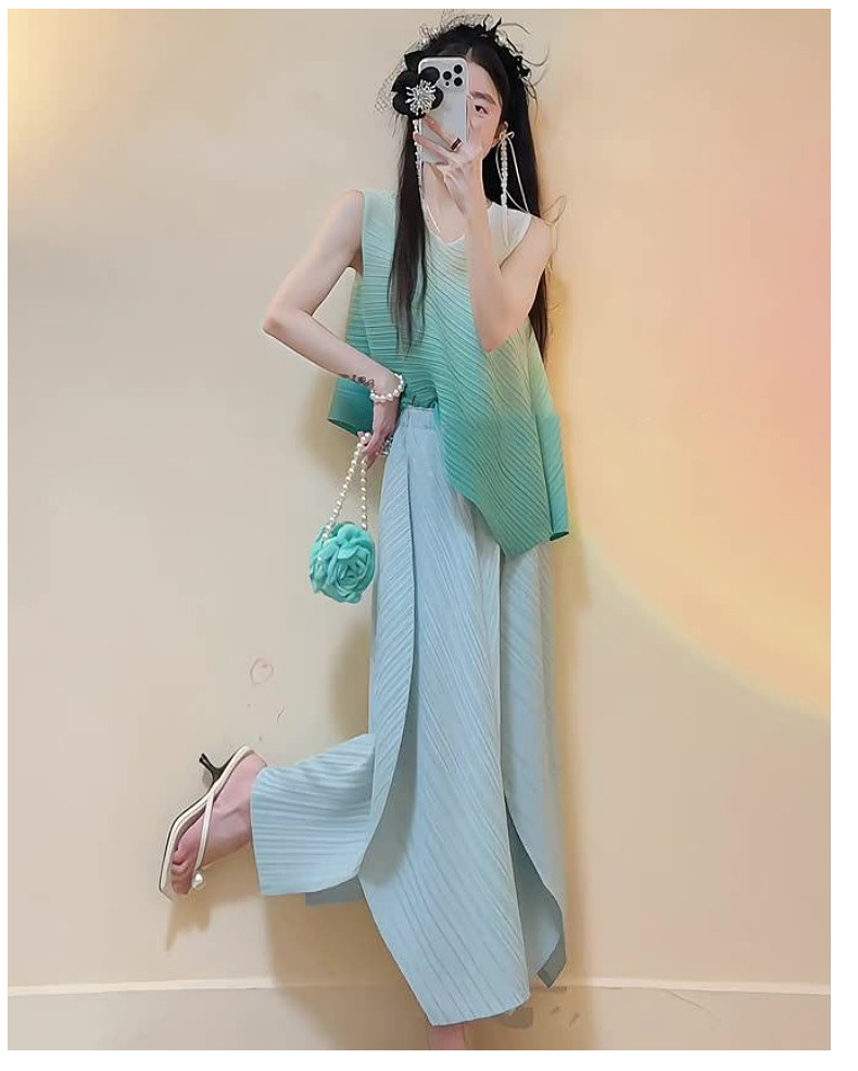 Miyake 2024 여름 신선하고 달콤한 착용 여성용 그라디언트 편안한 올 매치 슬란 트 탑 불규칙한 꽃잎 바지