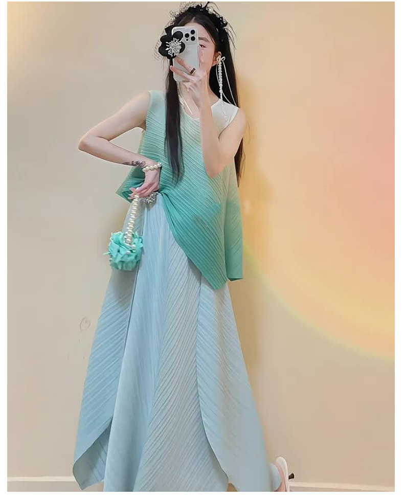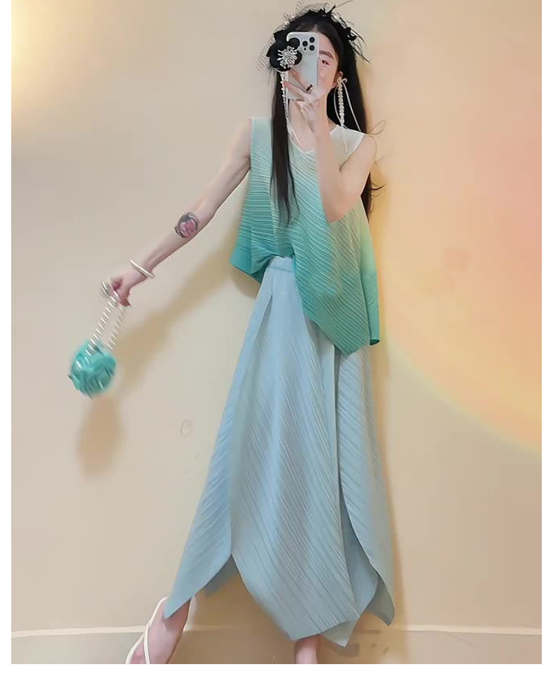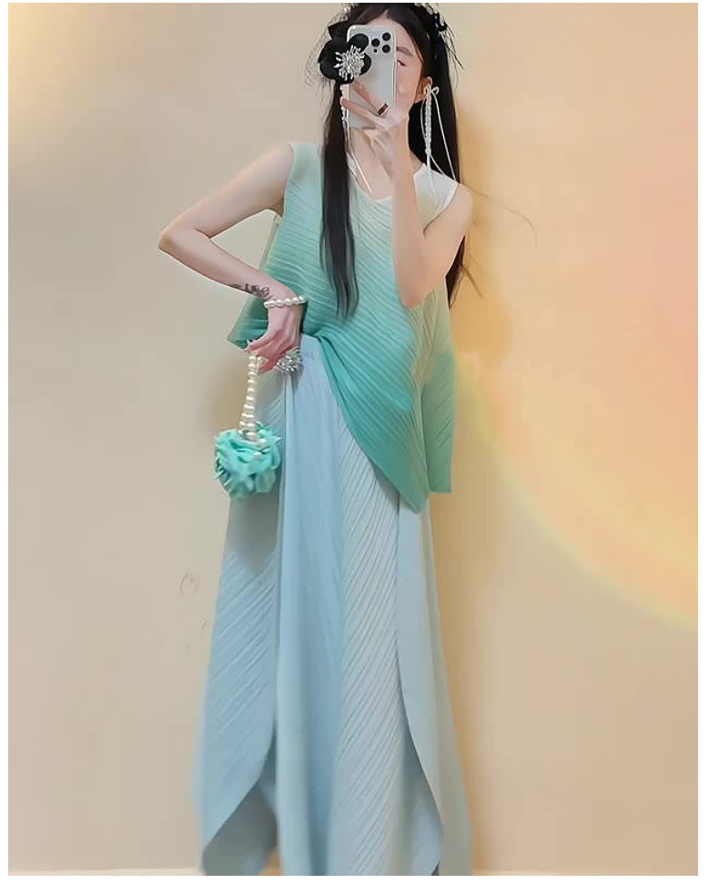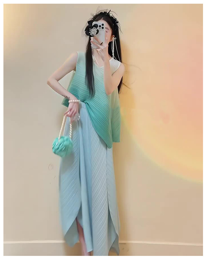 Miyake 2024 여름 신선하고 달콤한 착용 여성용 그라디언트 편안한 올 매치 슬란 트 탑 불규칙한 꽃잎 바지