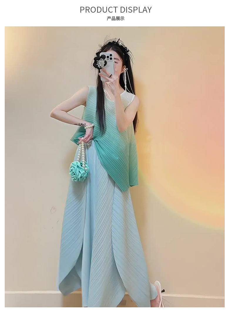 Miyake 2024 여름 신선하고 달콤한 착용 여성용 그라디언트 편안한 올 매치 슬란 트 탑 불규칙한 꽃잎 바지스토어 가기