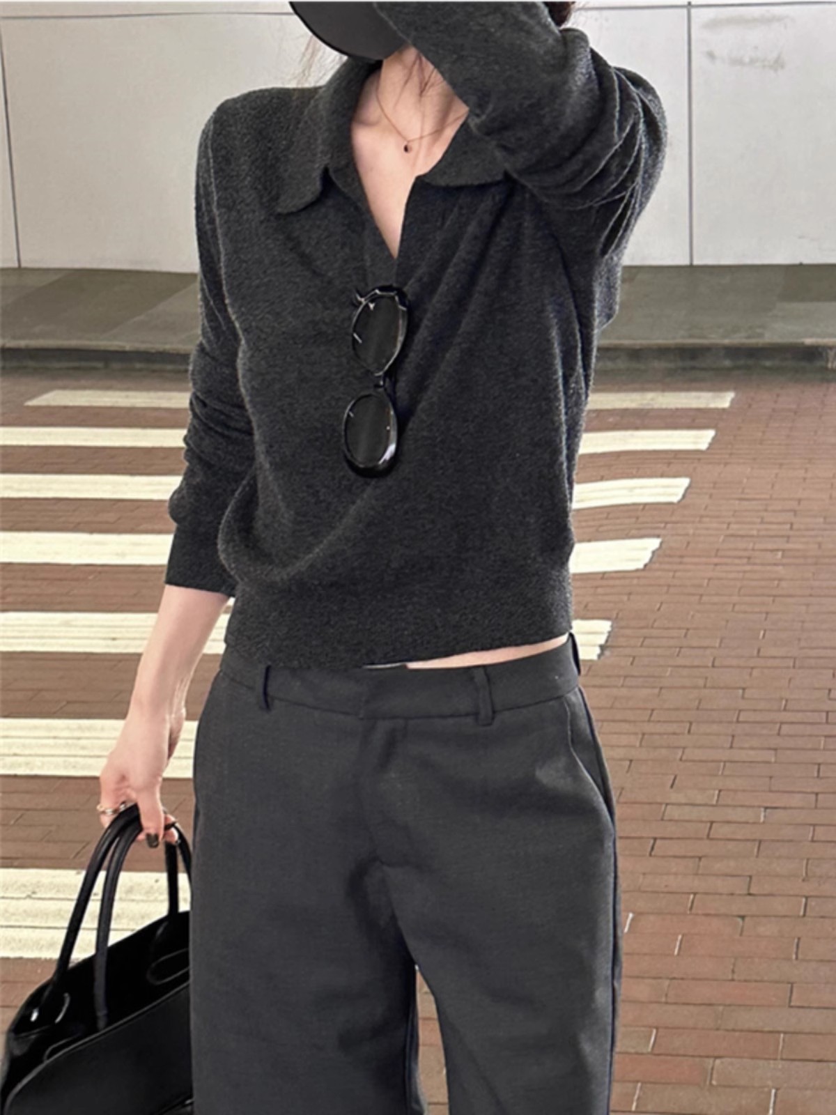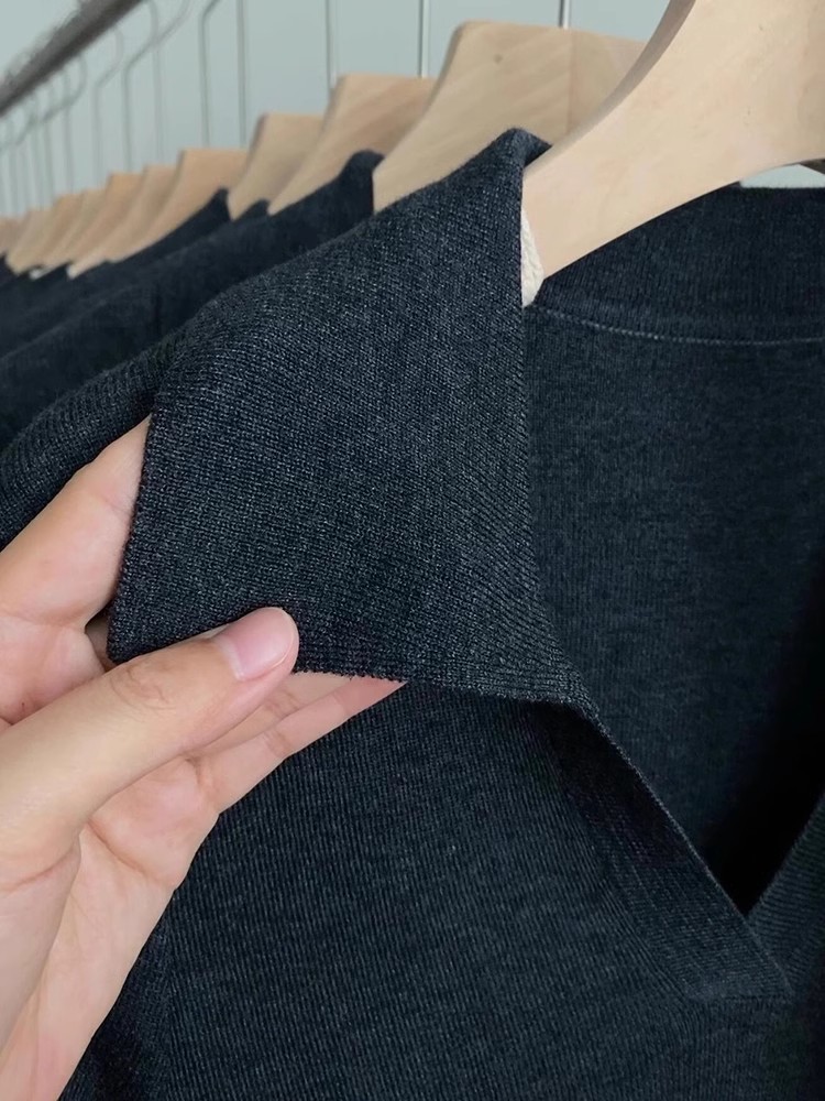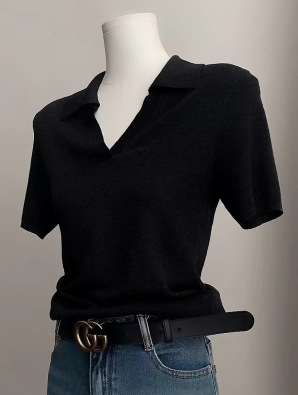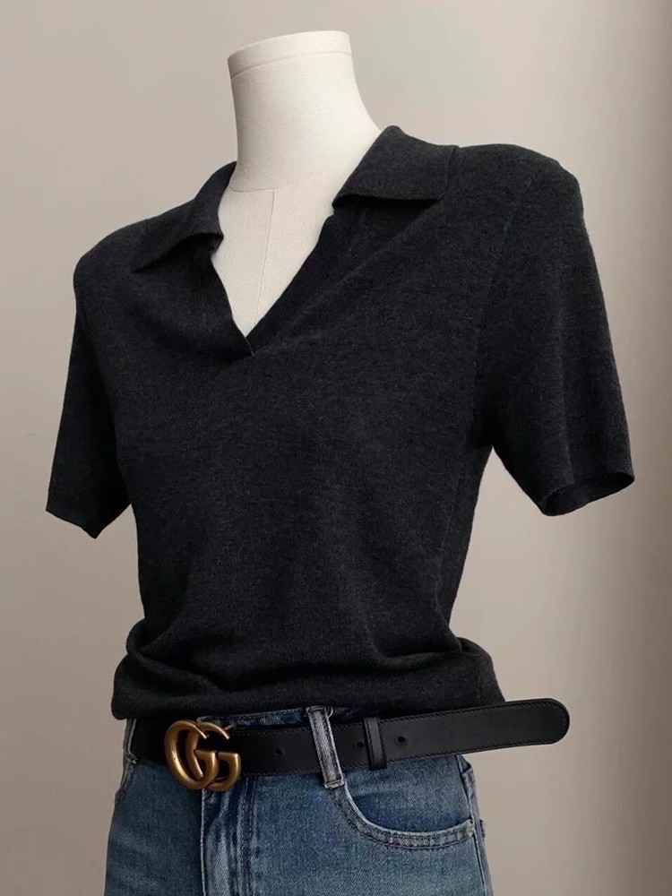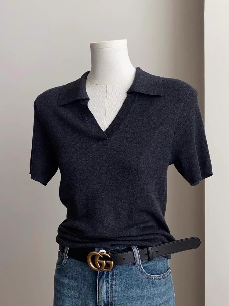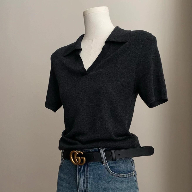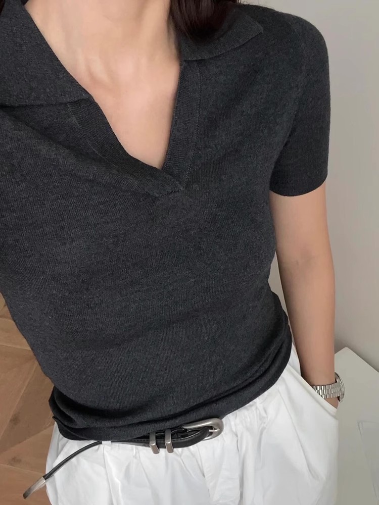슬리밍 종이 사람들 ~ 미니멀리스트 폴로 칼라 아이스 실크 니트 셔츠 여성의 여름 짧은 소매 티셔츠 가위 V-칼라 탑