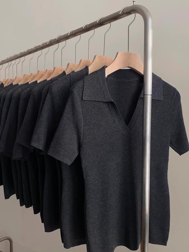 슬리밍 종이 사람들 ~ 미니멀리스트 폴로 칼라 아이스 실크 니트 셔츠 여성의 여름 짧은 소매 티셔츠 가위 V-칼라 탑스토어 가기