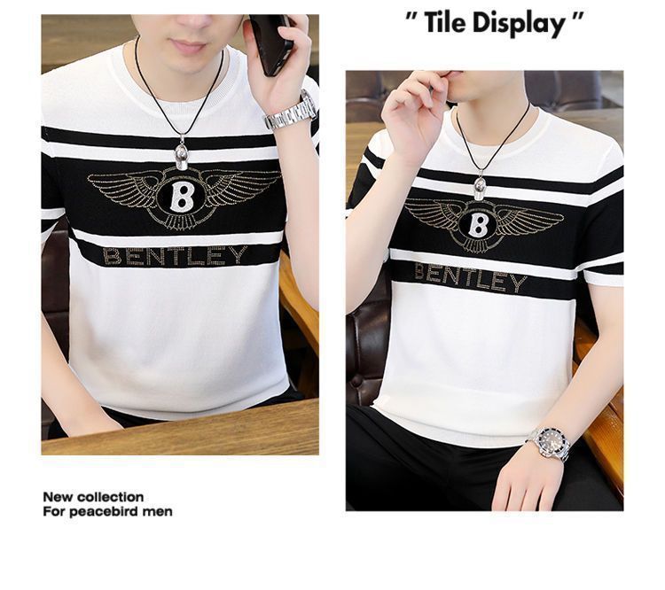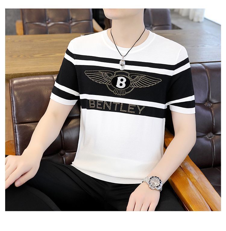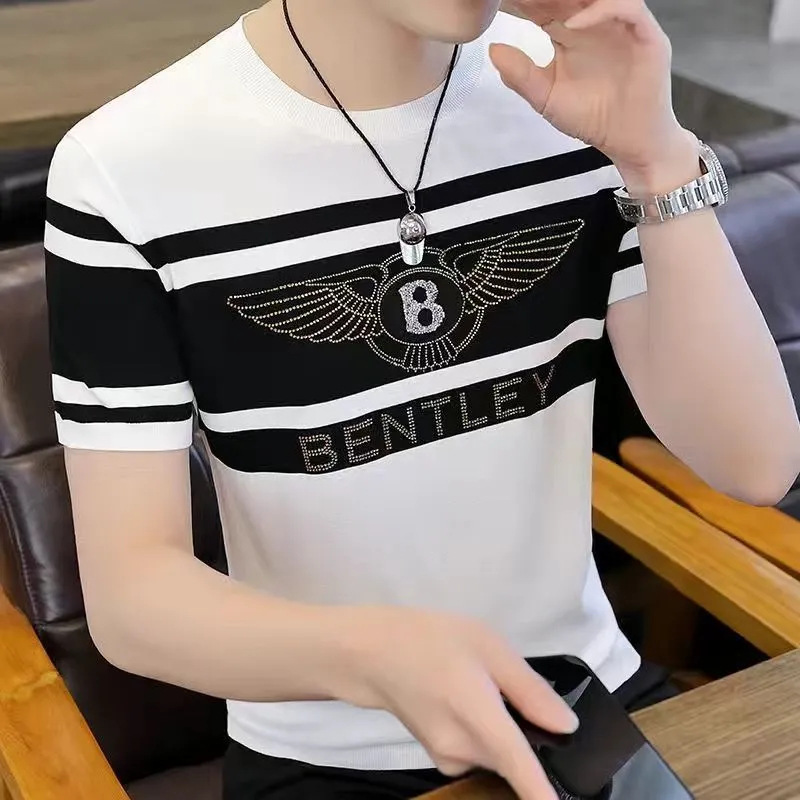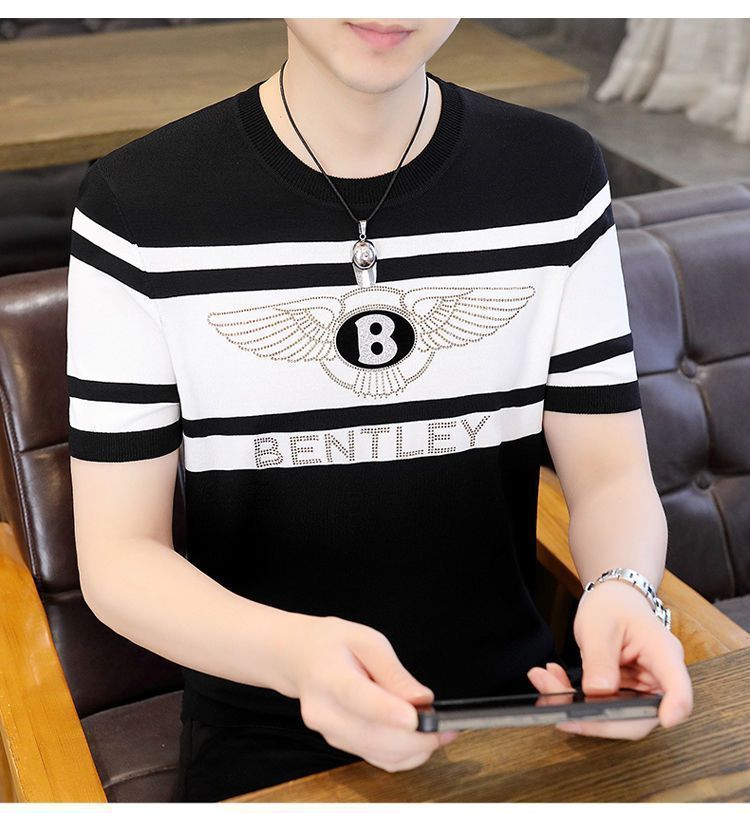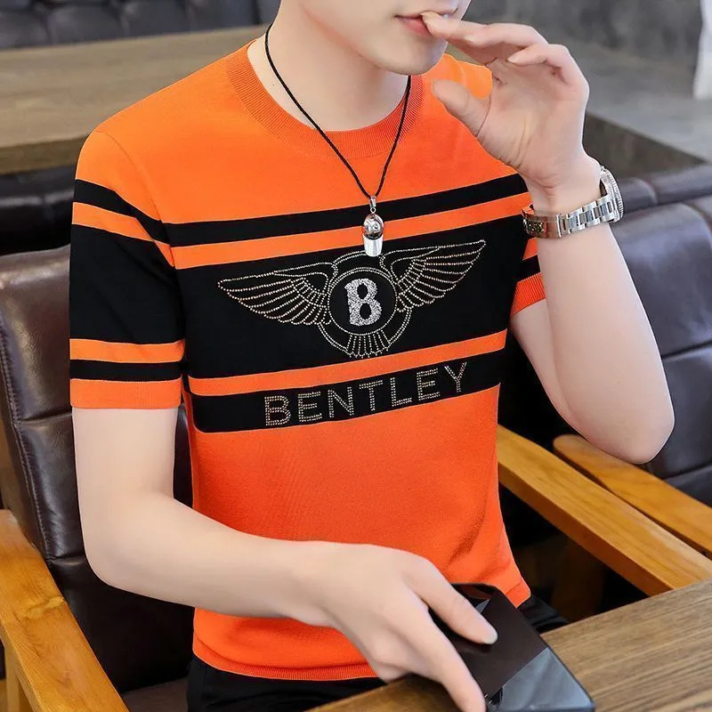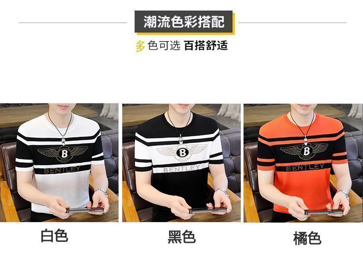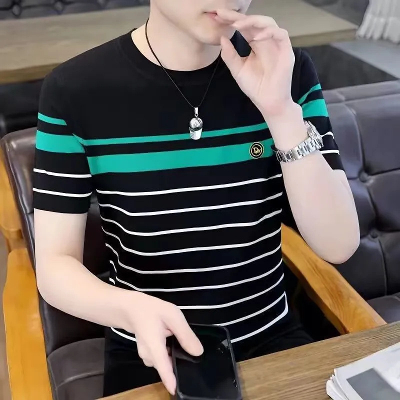 아이스 실크 반팔 티셔츠 남자 여름 라운드 넥 캐주얼 올매치 베이스 셔츠 잘 생긴 줄무늬 티셔츠 남자 탑 대비